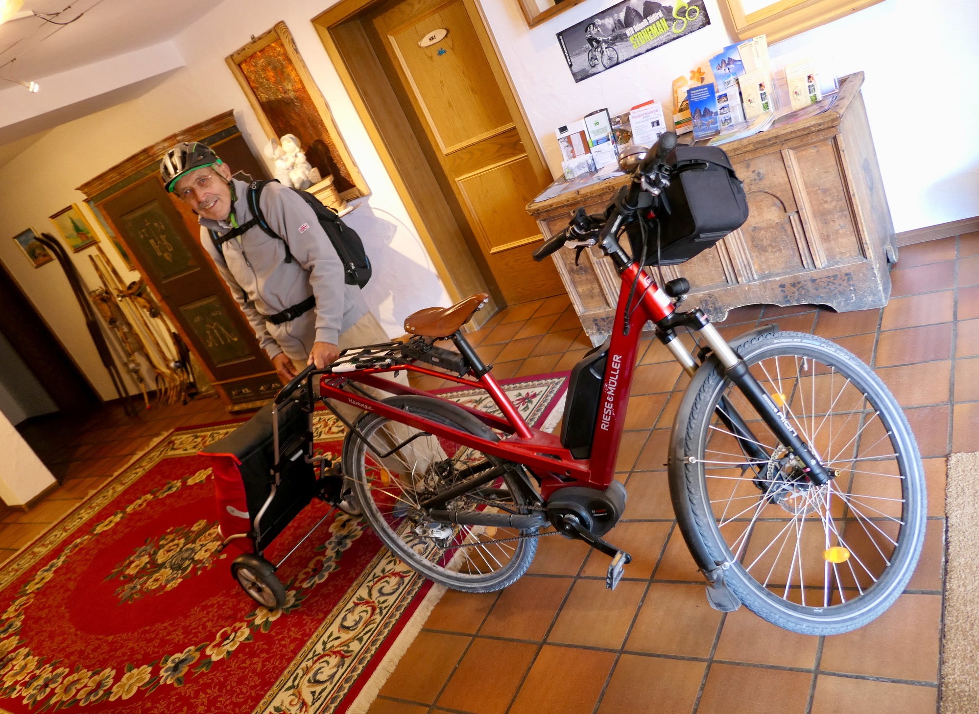 Wolff from Germany, our favorite fellow guest at the hotel. He’s leaving for home this morning, after a visit of about a week. He’s on his way to the train station with his bike and trailer. His bike weighs a ton!