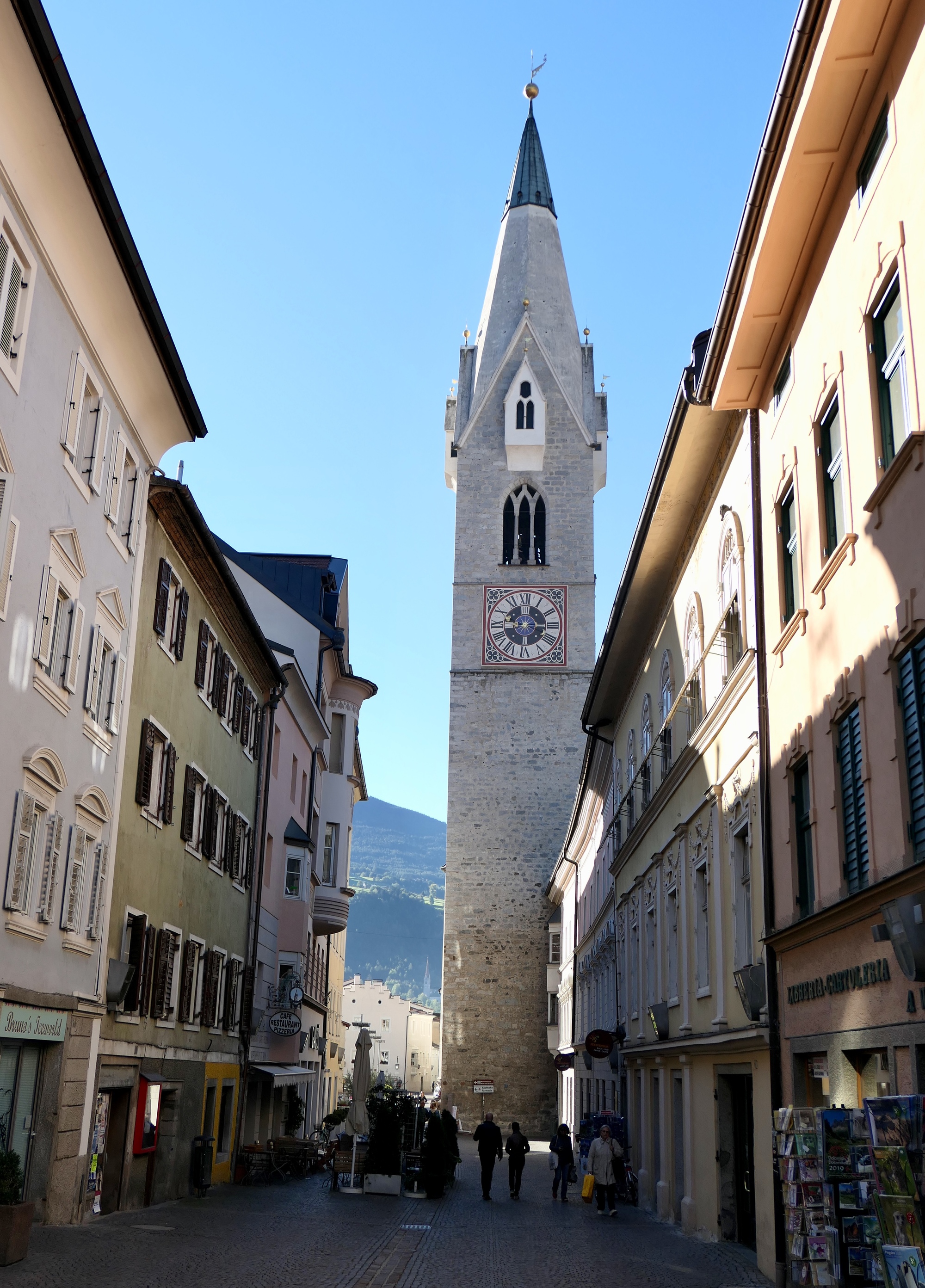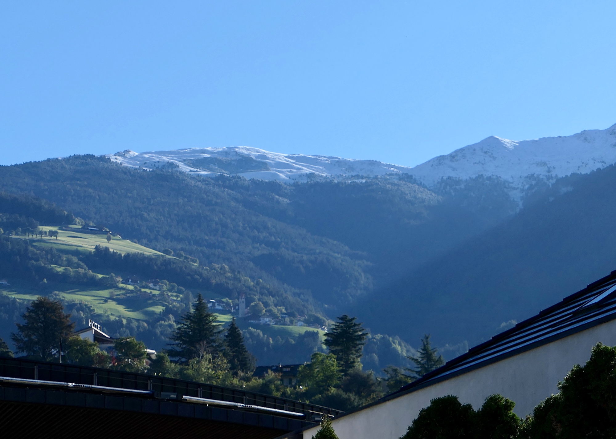 Such a fine plan. The weather even cooperated, and we felt very lucky as we reviewed the plan over another nice breakfast at the Grauer Bar. After yesterday’s cold and rain, the next three days all look great. It will be quite cold up in the passes, but we can bundle up. Seeing some new snow on the hills will make it really special. Today it’s still cold though and we can see snow on the ridge above town. We wait around until 11, checkout time, with Rachael passing time by keeping warm in bed, curled up with a good book; and I go out in town with the camera one last time.