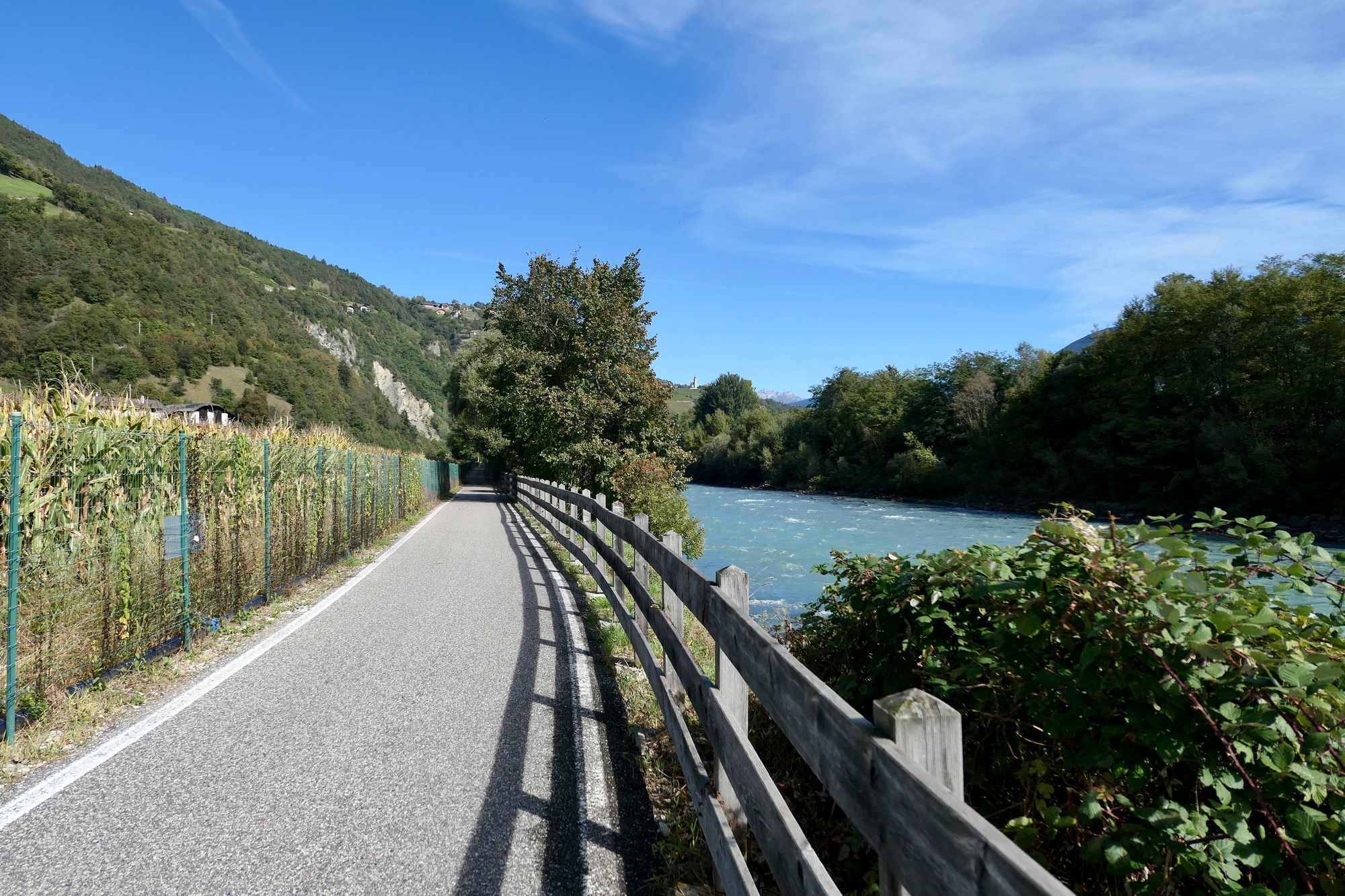 Eleven comes, and we start out. It’s a short 20 mile ride, so we aren’t really concerned about the time. The first eight miles go quickly, as we follow the bike path down river to Point Gardena. After this the route is all uphill - 2,000’ in twelve miles. Not too bad. We expect we’ll reach Ortisei by midafternoon sometime.