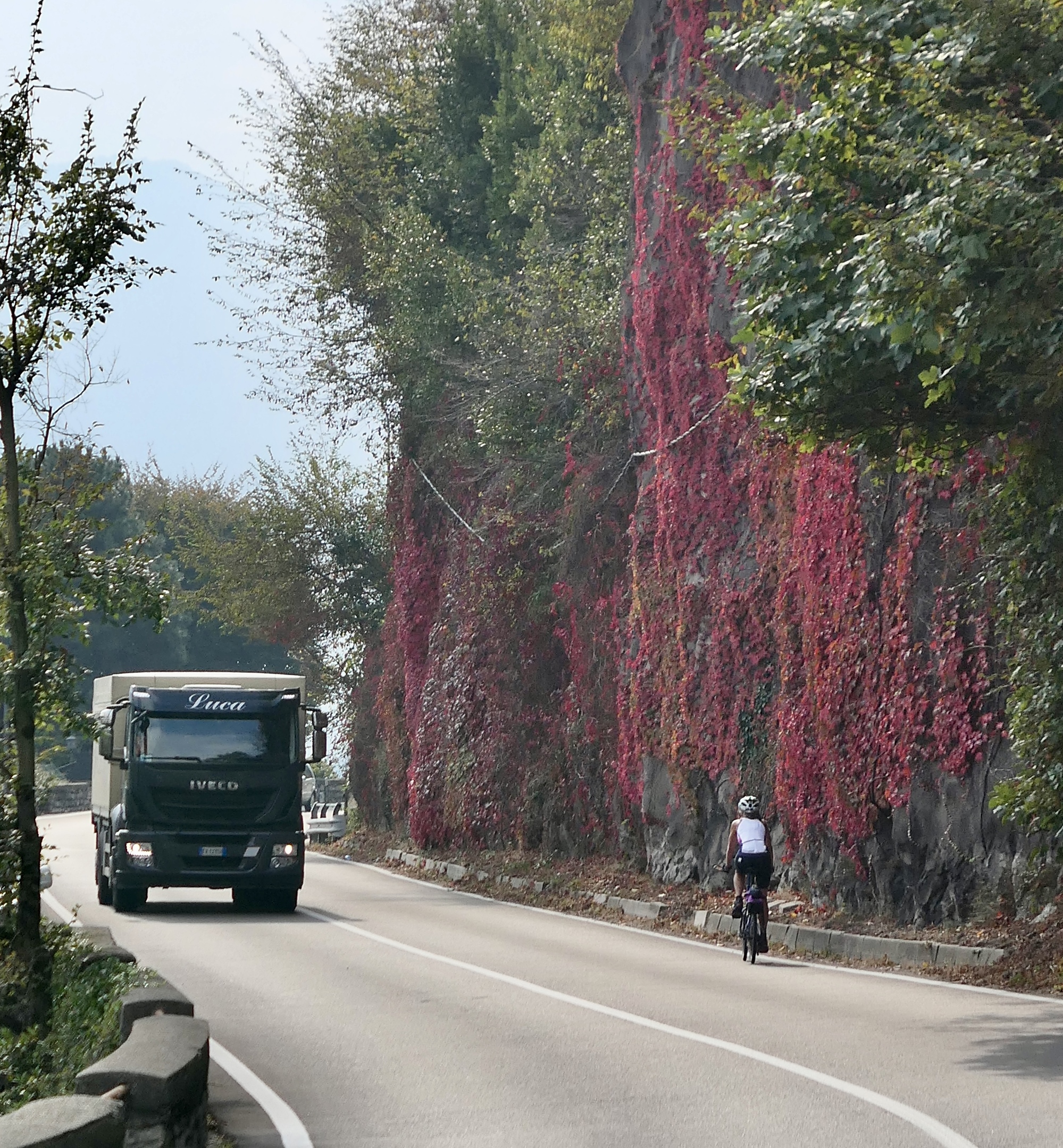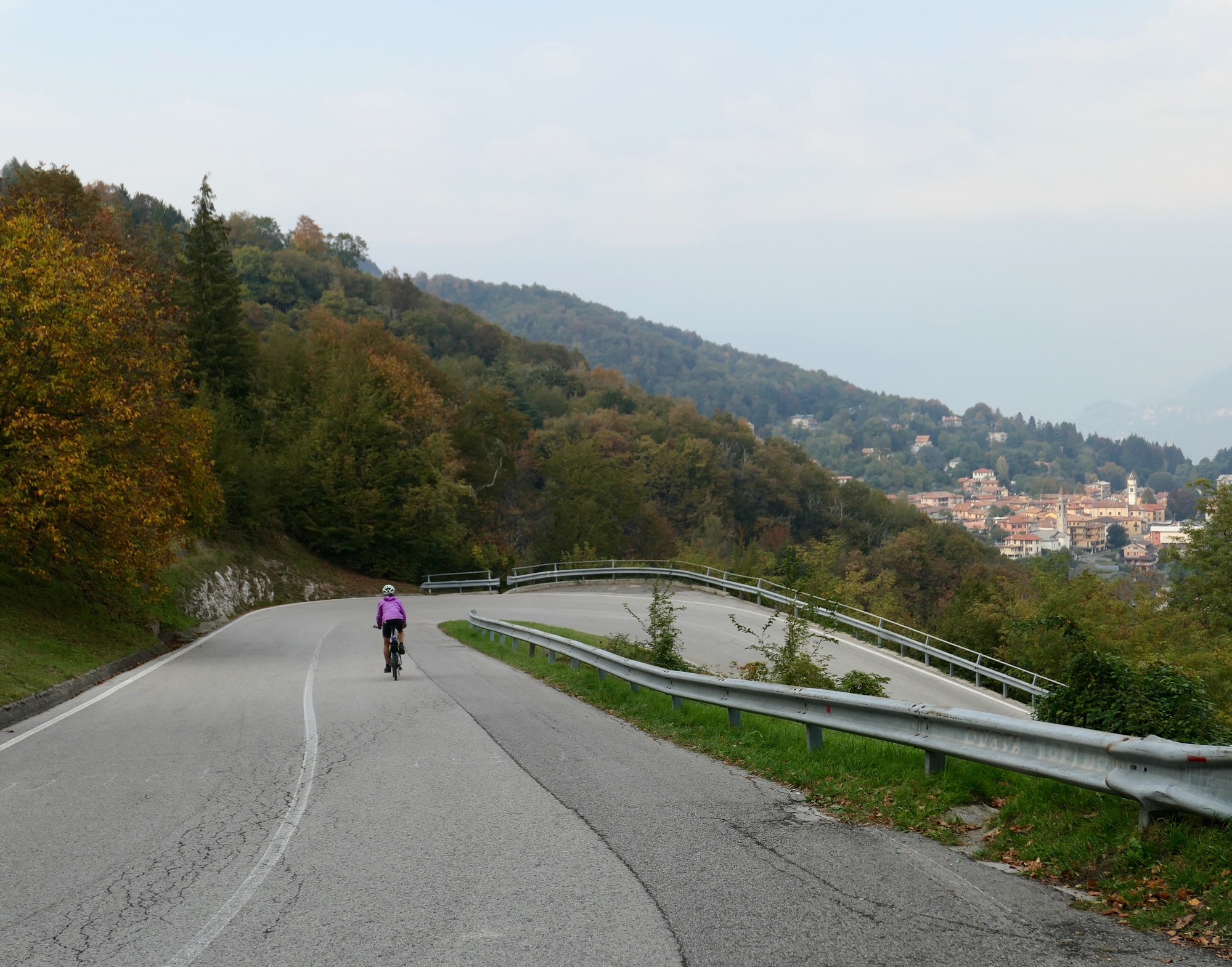 After that, the climbing begins. We could have ridden back up the east side of the lake, but we’ve decided to go over the top, through Ghisallo again. The lakeside road on the east bank looks a bit worrying, and I was sorry on our first pass through that we didn’t have time for the museum. So, up it is.