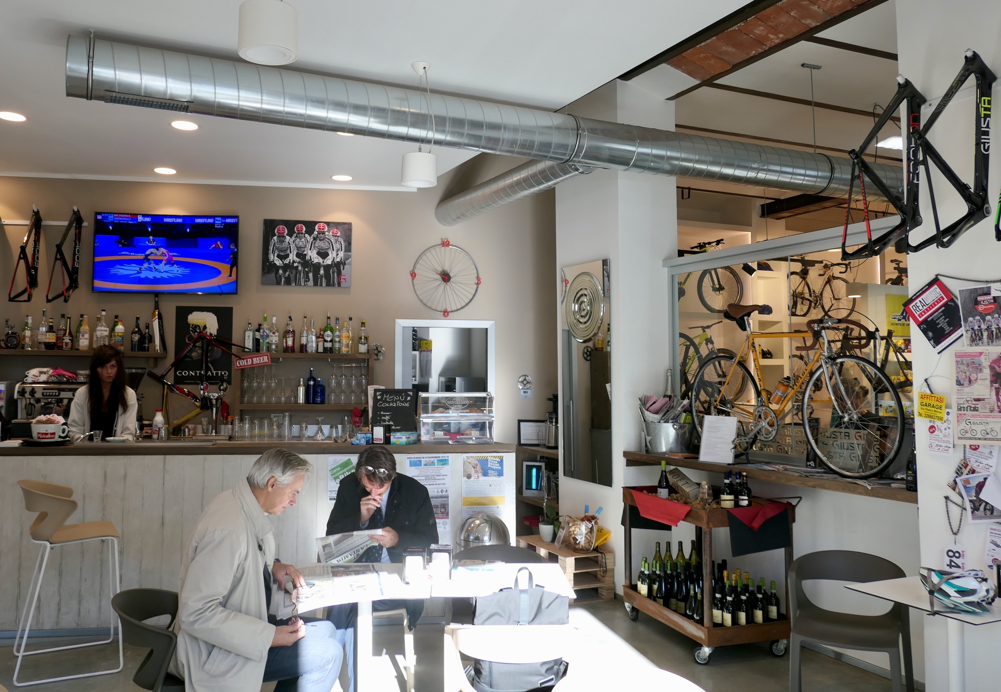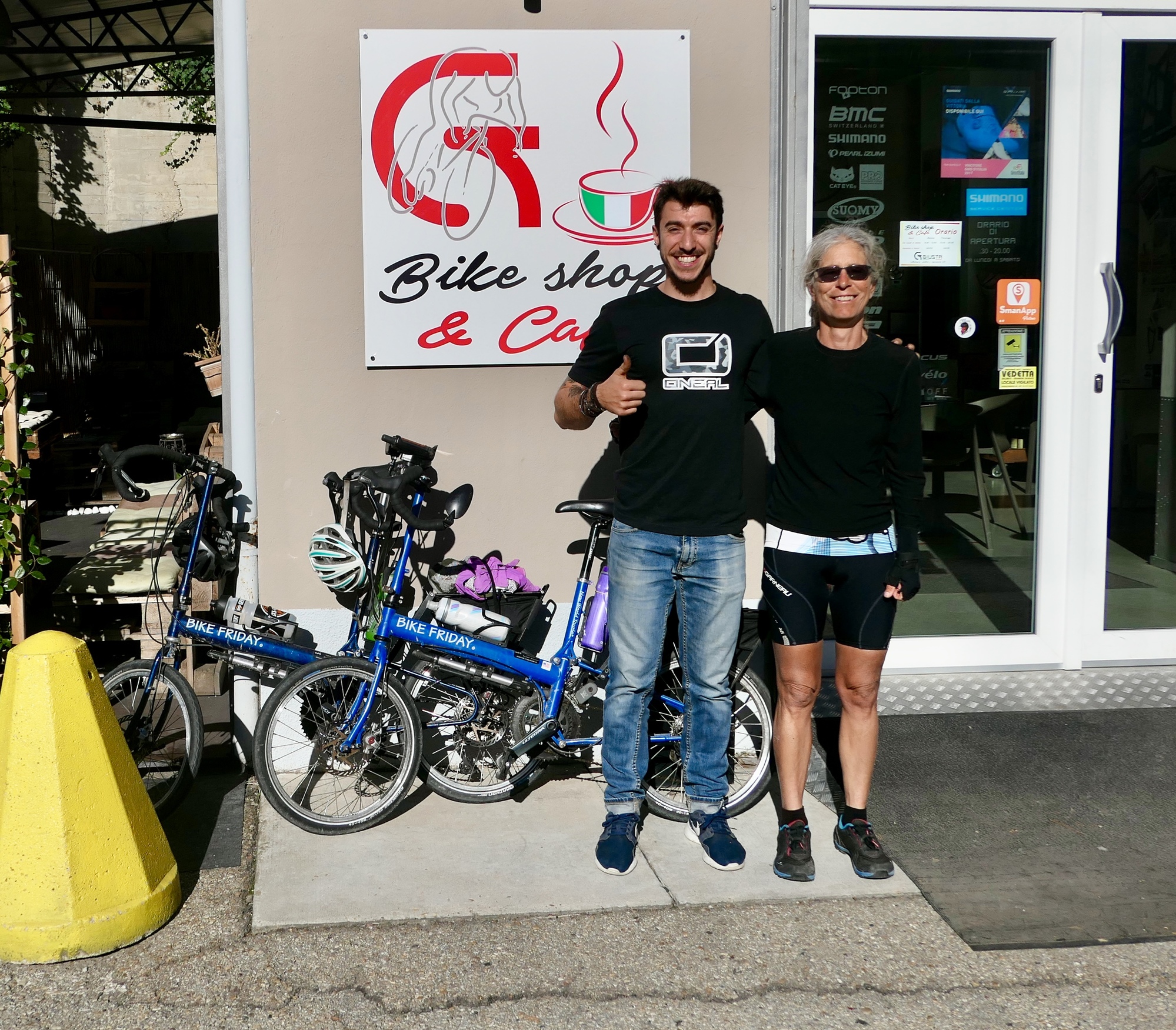 Or is it a cafe, or maybe a bar? The Giusta Bike Shop & Cafe tries to have it both ways, and two gents are hanging out having cappuccinos and reading the daily news as we roll our bikes in the door. It’s a pretty great bike store too, and our new favorite. The friendly, personable mechanic clearly does know what he’s doing (it’s a Shimano certified repair shop), takes his time, adjusts all four of our brakes, and chats us up a bit. He wants to know where we’re from and where we’re bound, and when we leave he wants us to pose in front of the shop so he can post a photo on the shop’s website. A great establishment.