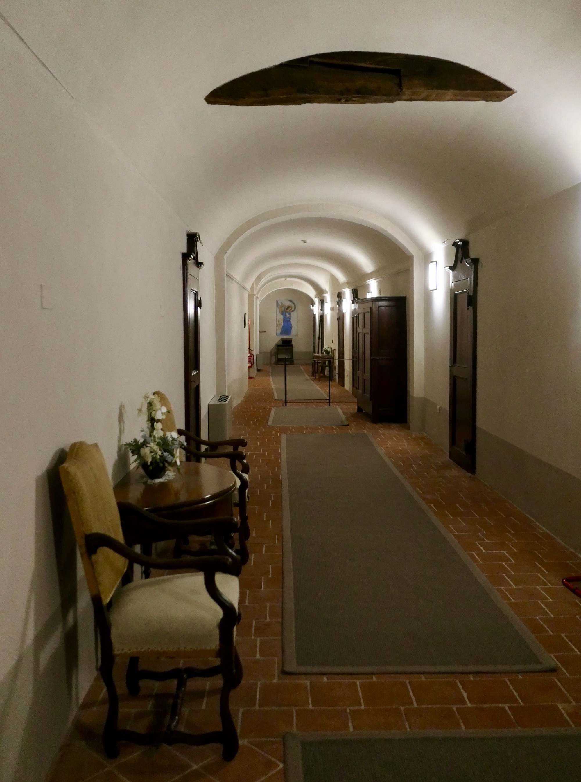 Fortunately, the very helpful hotel manager quickly located alternate lodging for us quite nearby, and further up the hill a few more blocks. And so, tonight we find ourselves in a place we would never have chosen on our own, but are happy to experience as long as we’ve been forced into it: the four star San Giovanni Resort Hotel, a conversion of a former convent. It’s an elegant place, immediately beneath a large, ancient church tower. It will be interesting to hear in the morning if churchbells from just outside our window deafen us awake.