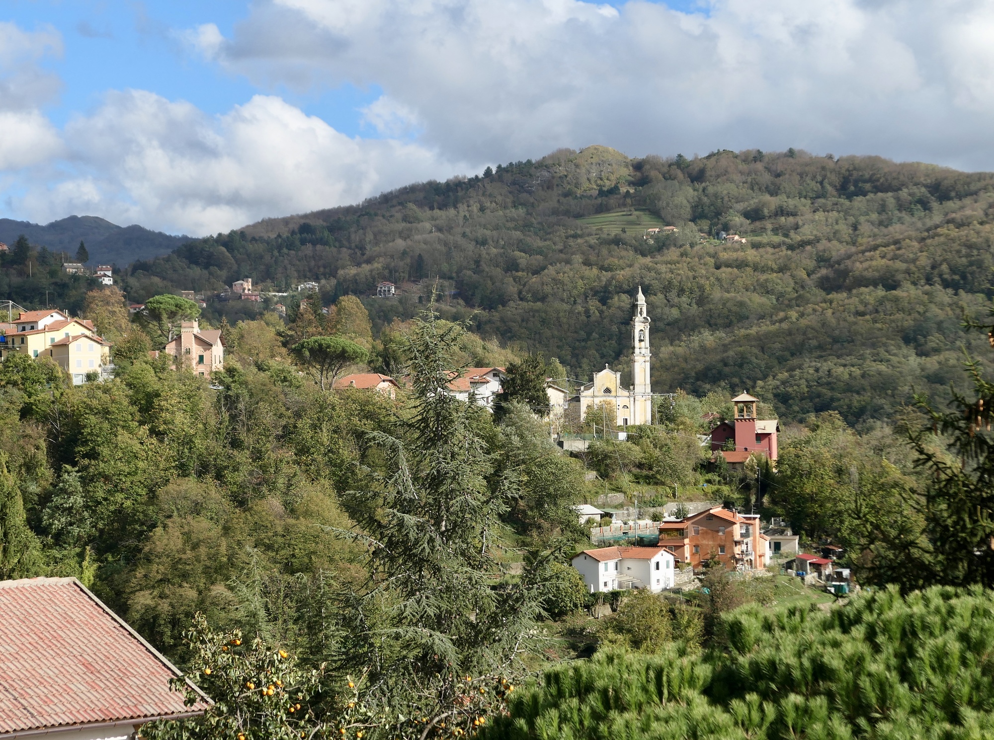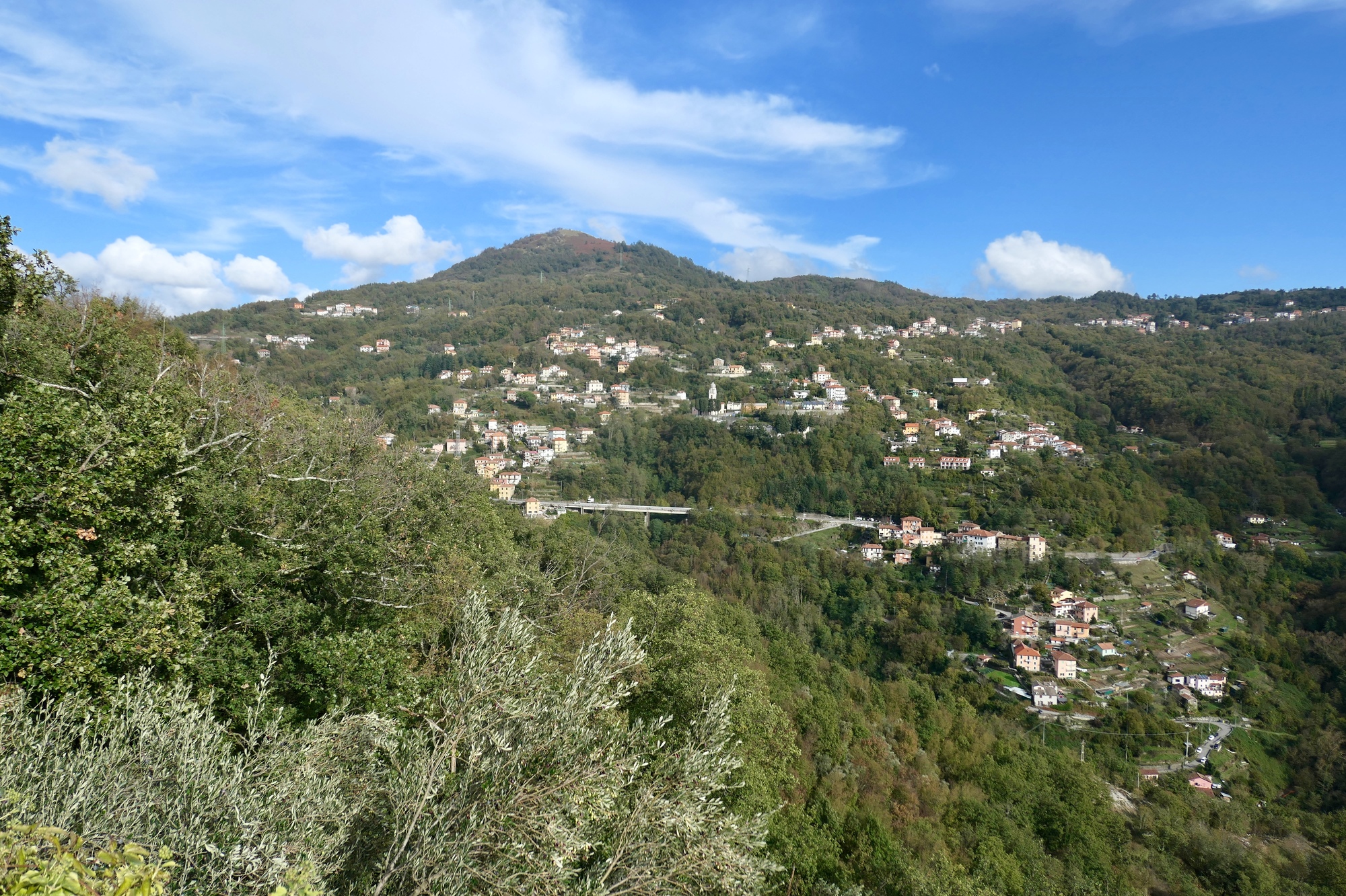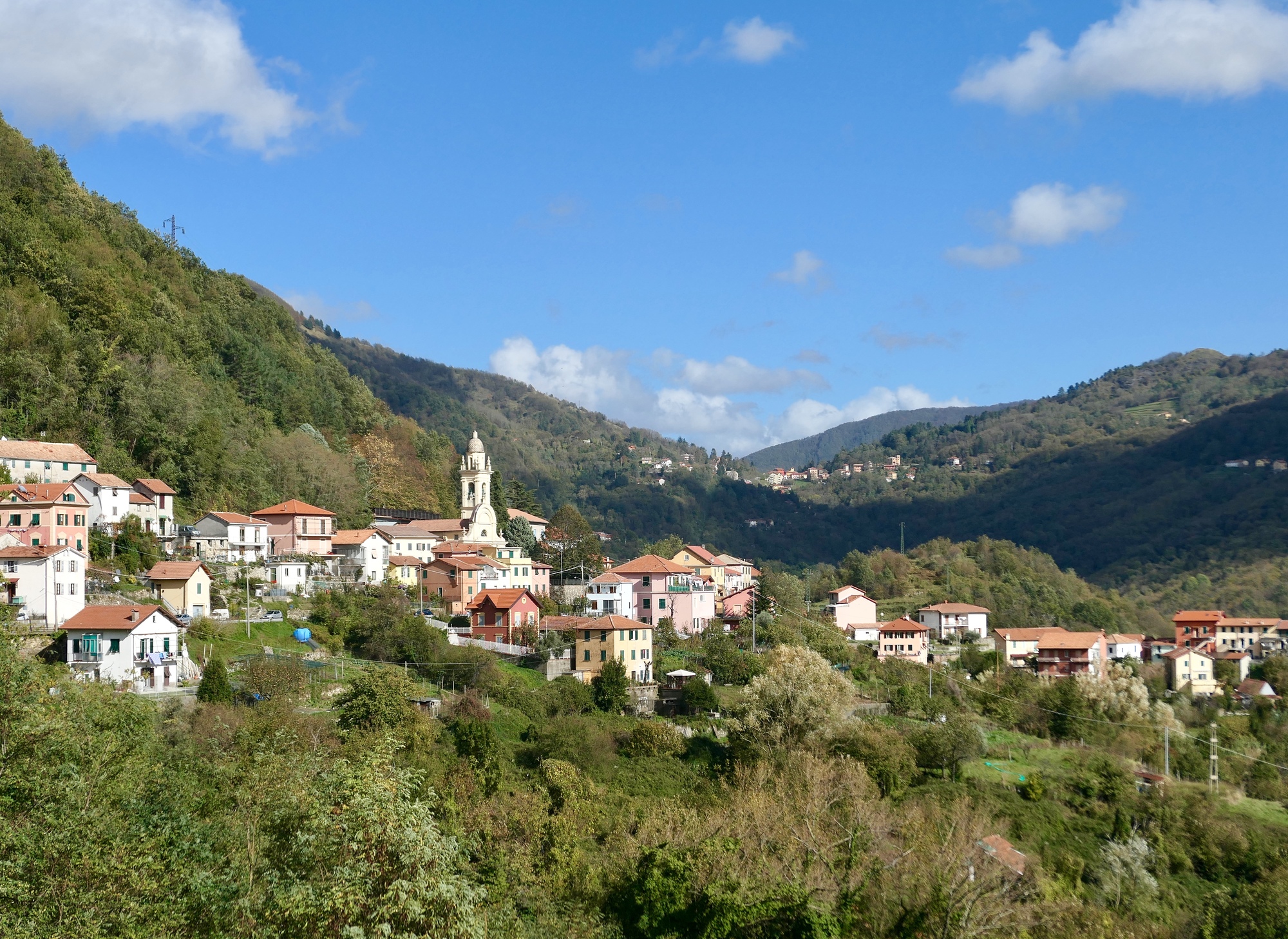 Seven miles into the ride, our road comes to an end. We cross the stream and join the main highway for about a half mile, and then turn off at Cavassolo onto a quiet side road that leaves the stream and quickly starts climbing. A few switchbacks later, we’re well up the wall of the narrow valley, and starting to enjoy some impressive views. For the next twelve miles we climb steadily, until we reach our turnback point in Scoffera.