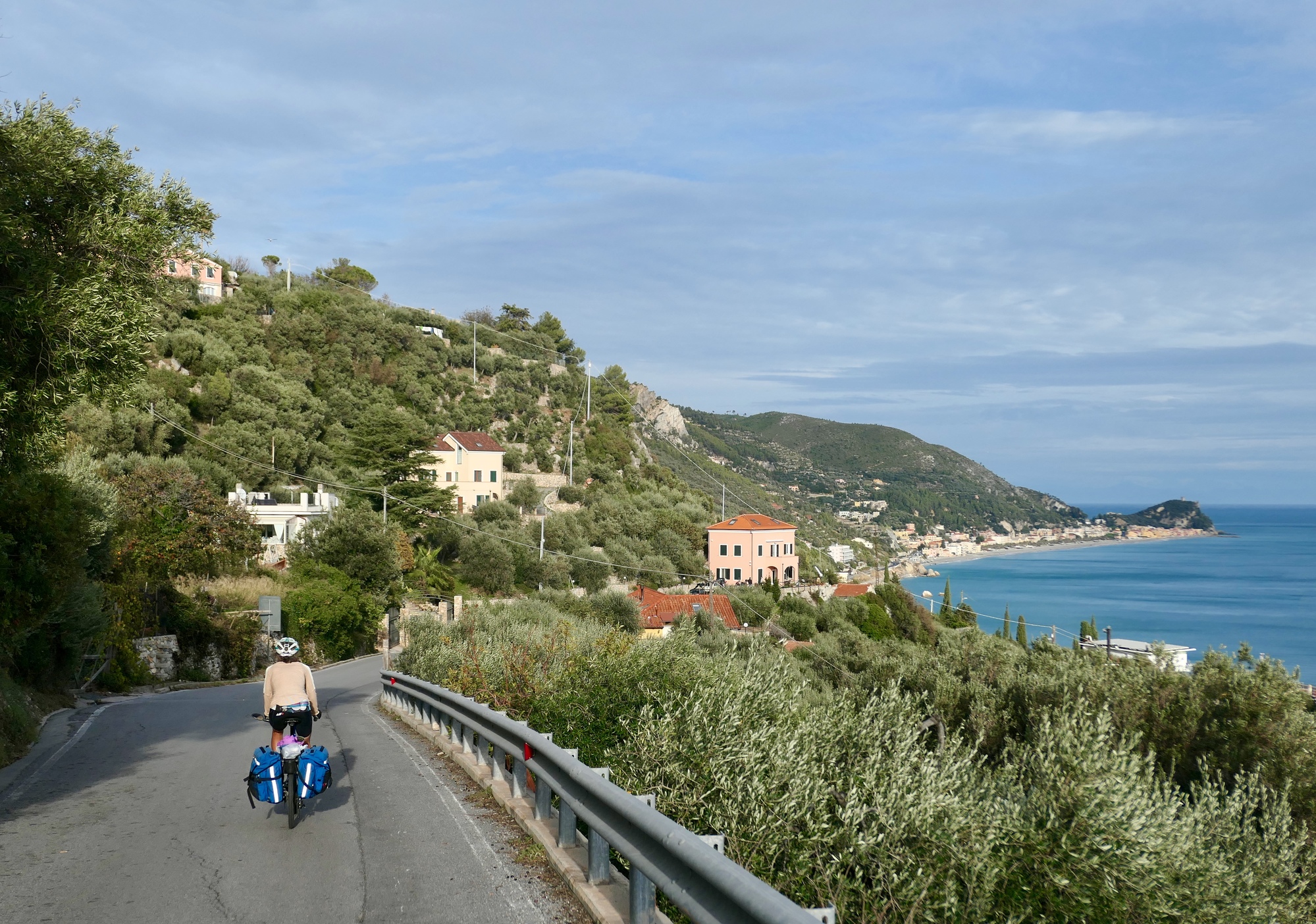 For the last half year I’ve been thinking a lot about our experiment, wondering how it would be visiting the Mediterranean coast so late in the season. Today, we have our answer. It looks like it will be brilliant. The road and the coastal resorts are quieter and much more welcoming, it’s very comfortable cycling when it’s not raining, and it’s beautiful. I love the look of the sea, so steely grey under an interesting broken sky.