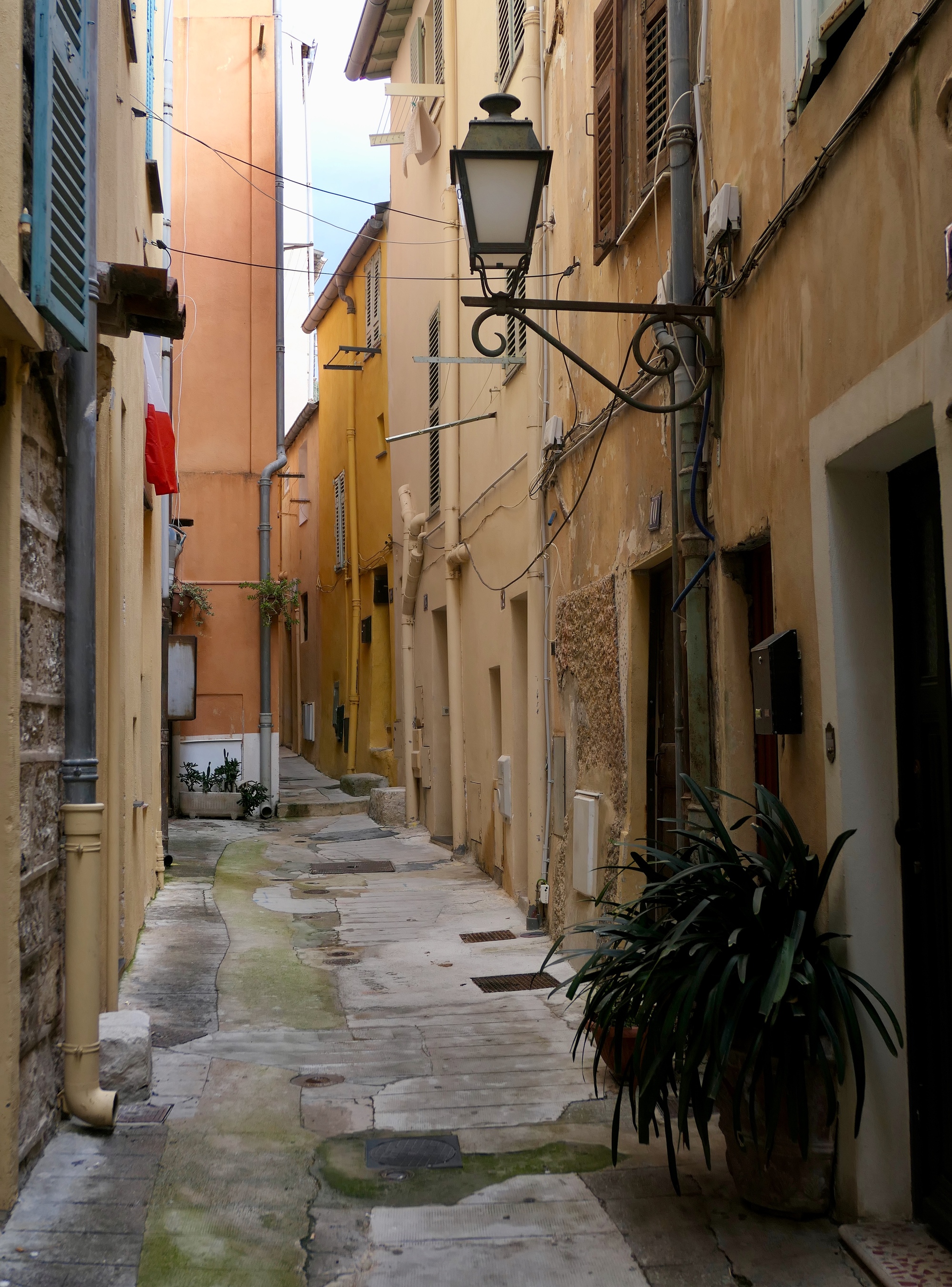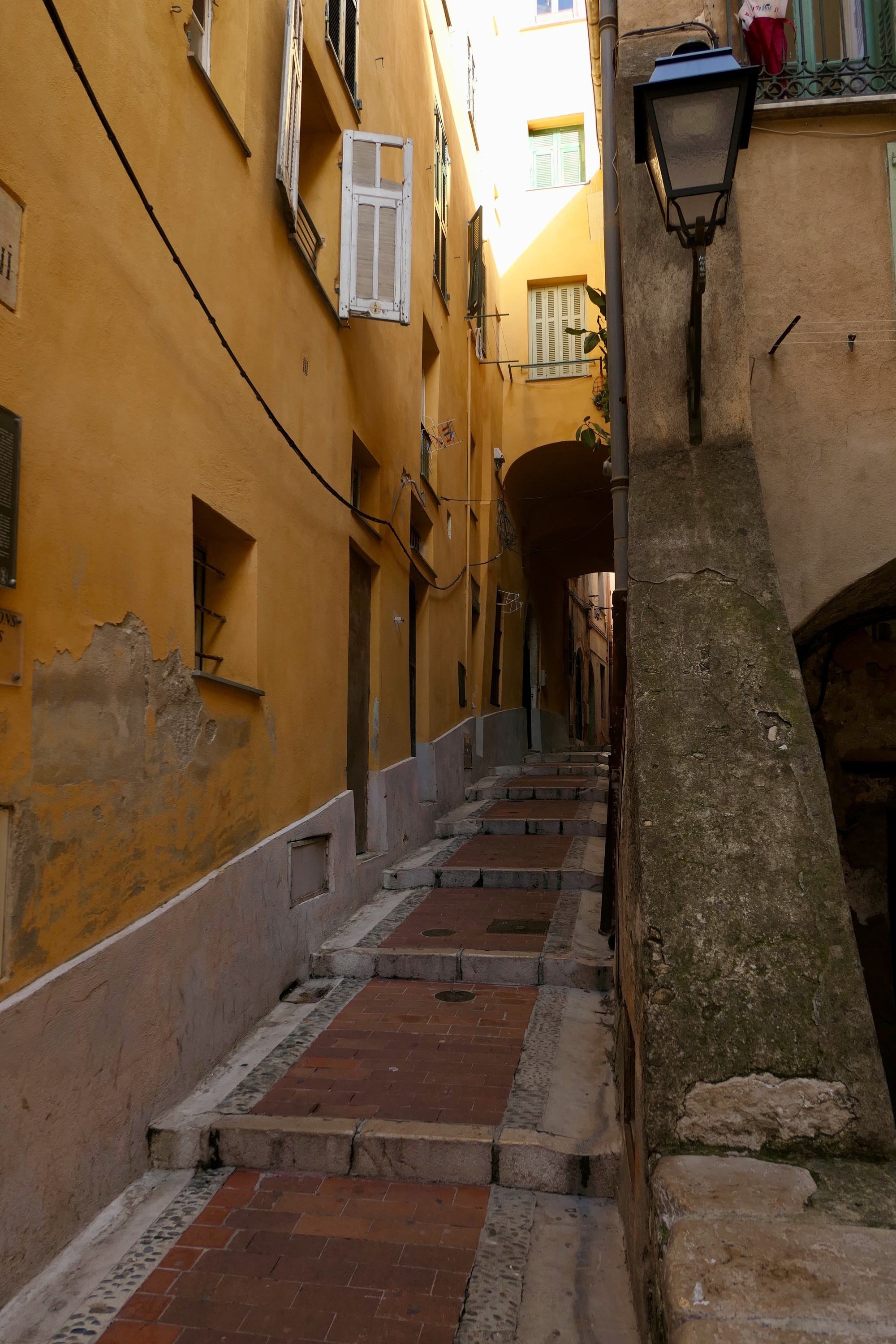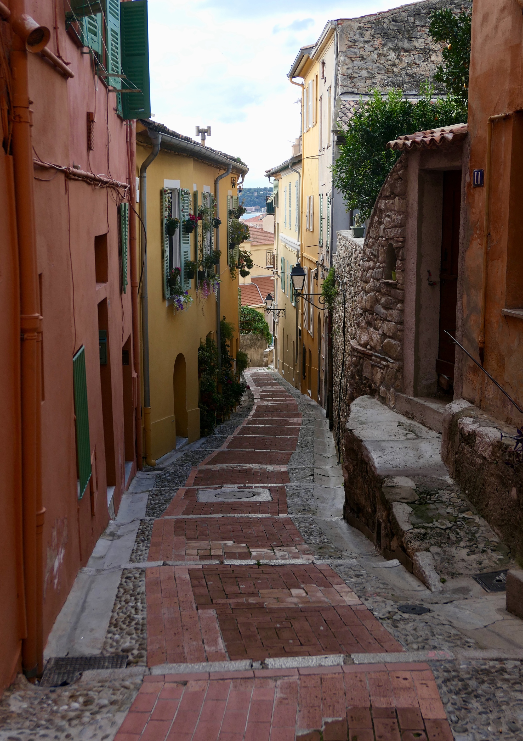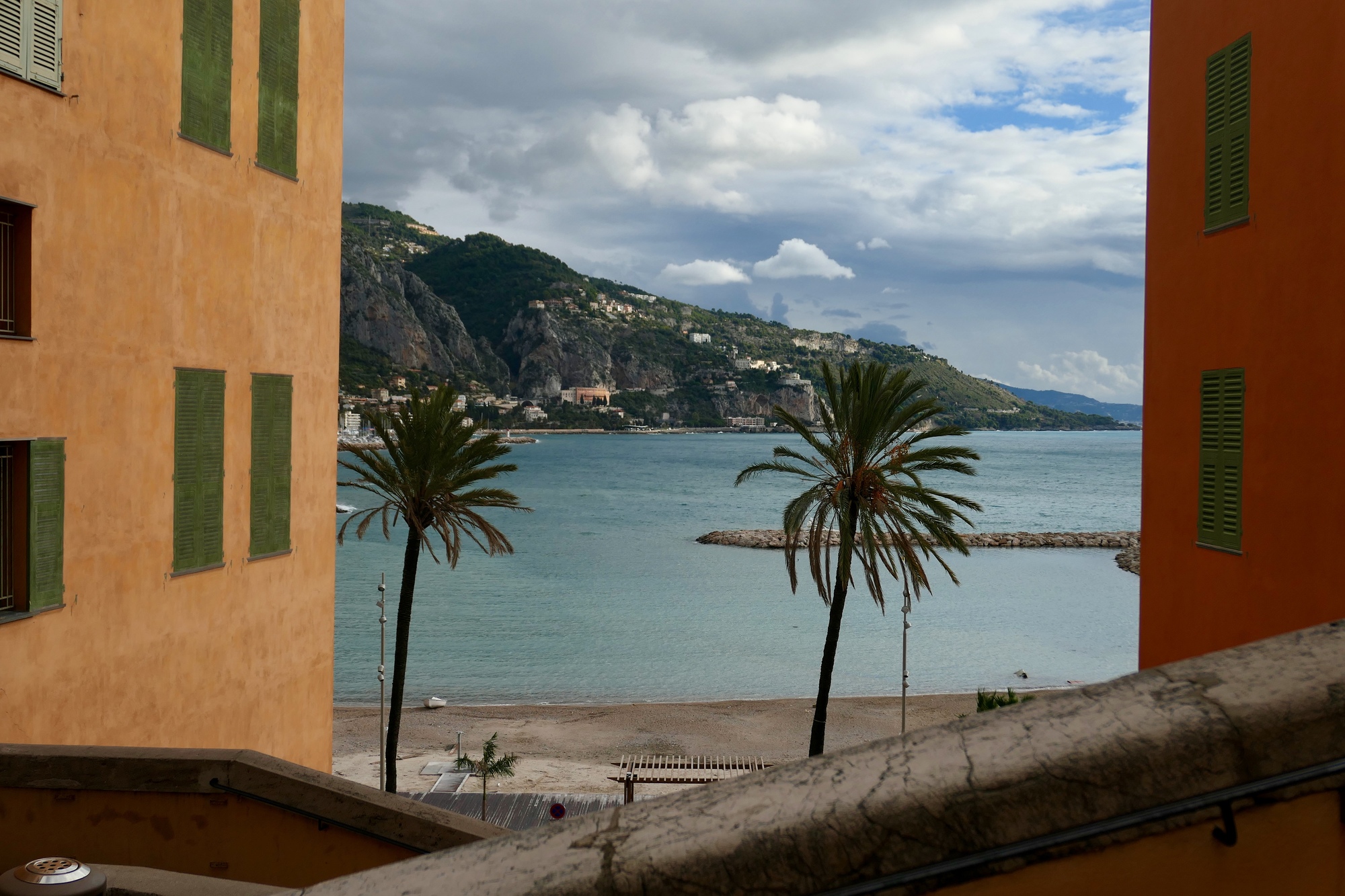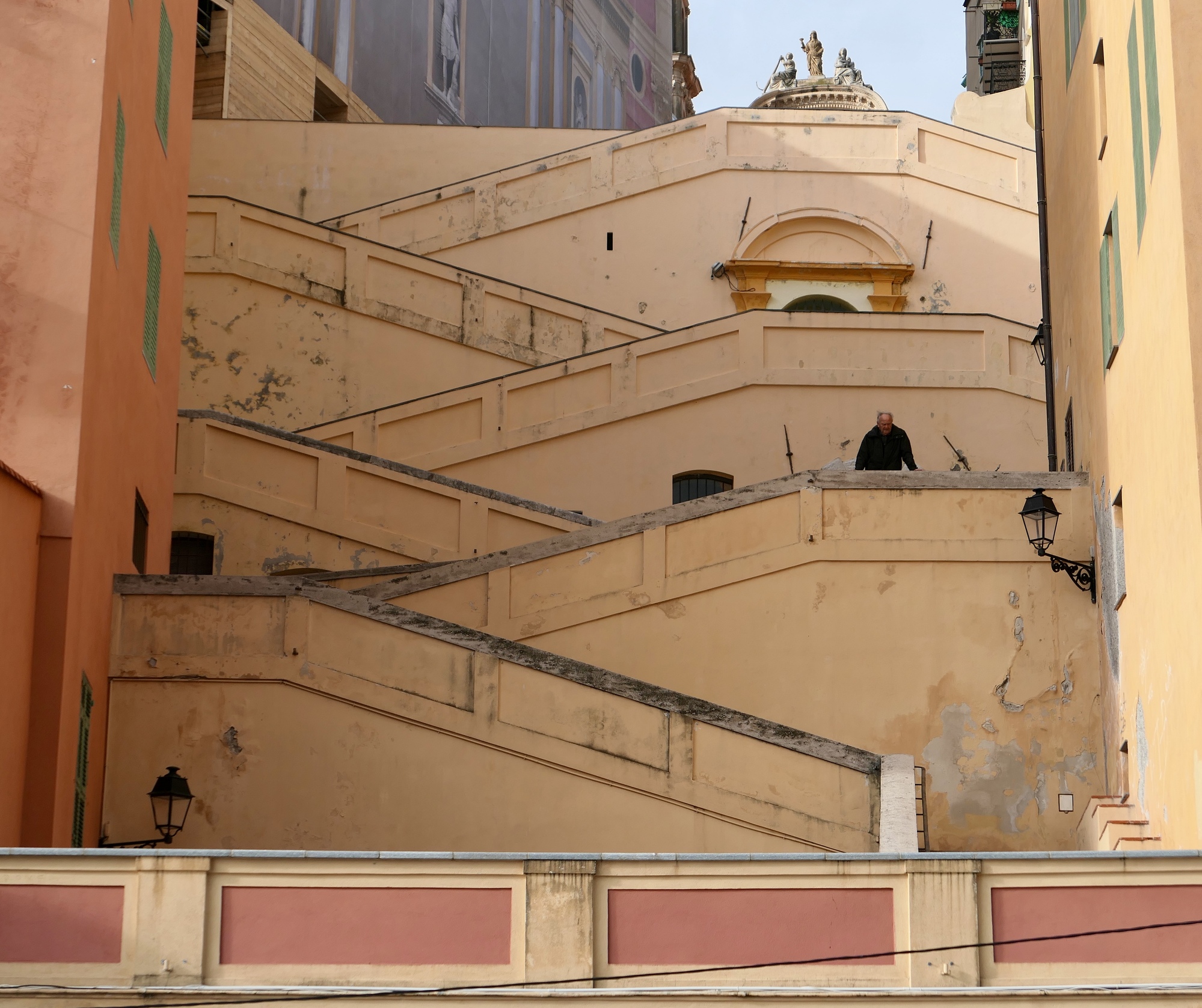 I really love Menton, at least as a place to visit and explore. I’m really drawn to its colors, its spectacular setting, and the astonishing maze of lanes and passageways that rise through the old city to the Basilica and cemetery. It has a fair claim to be my favorite city in France. This is at least our third time here, but I think it’s really the fourth. We were here for sure in the autumn of 1993 and 1994, biking west from Italy to Nice; and, obviously, now. I have an uncertain recollection of seeing it in the summer also, when there was a large amusement park set up on the waterfront. That must have been in the summer of 2003, when we visited Corsica and Provence while the lavander fields were in full bloom. We didn’t stay here, so I think we must have come over from Nice on a day ride.