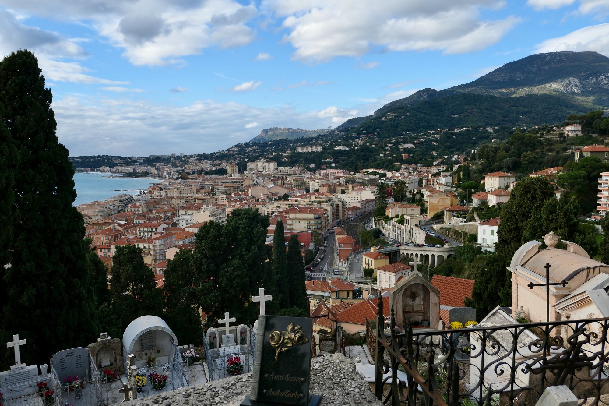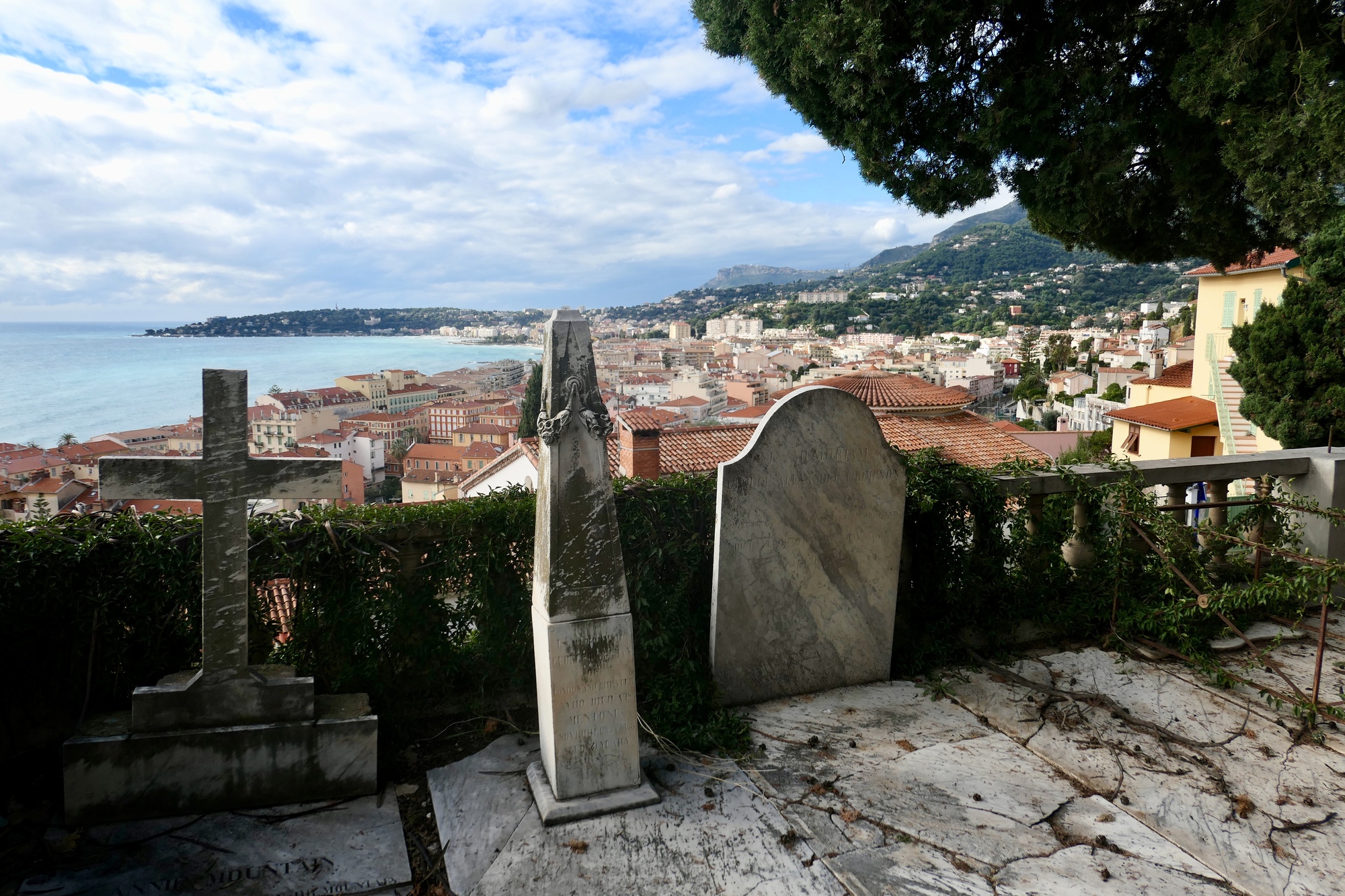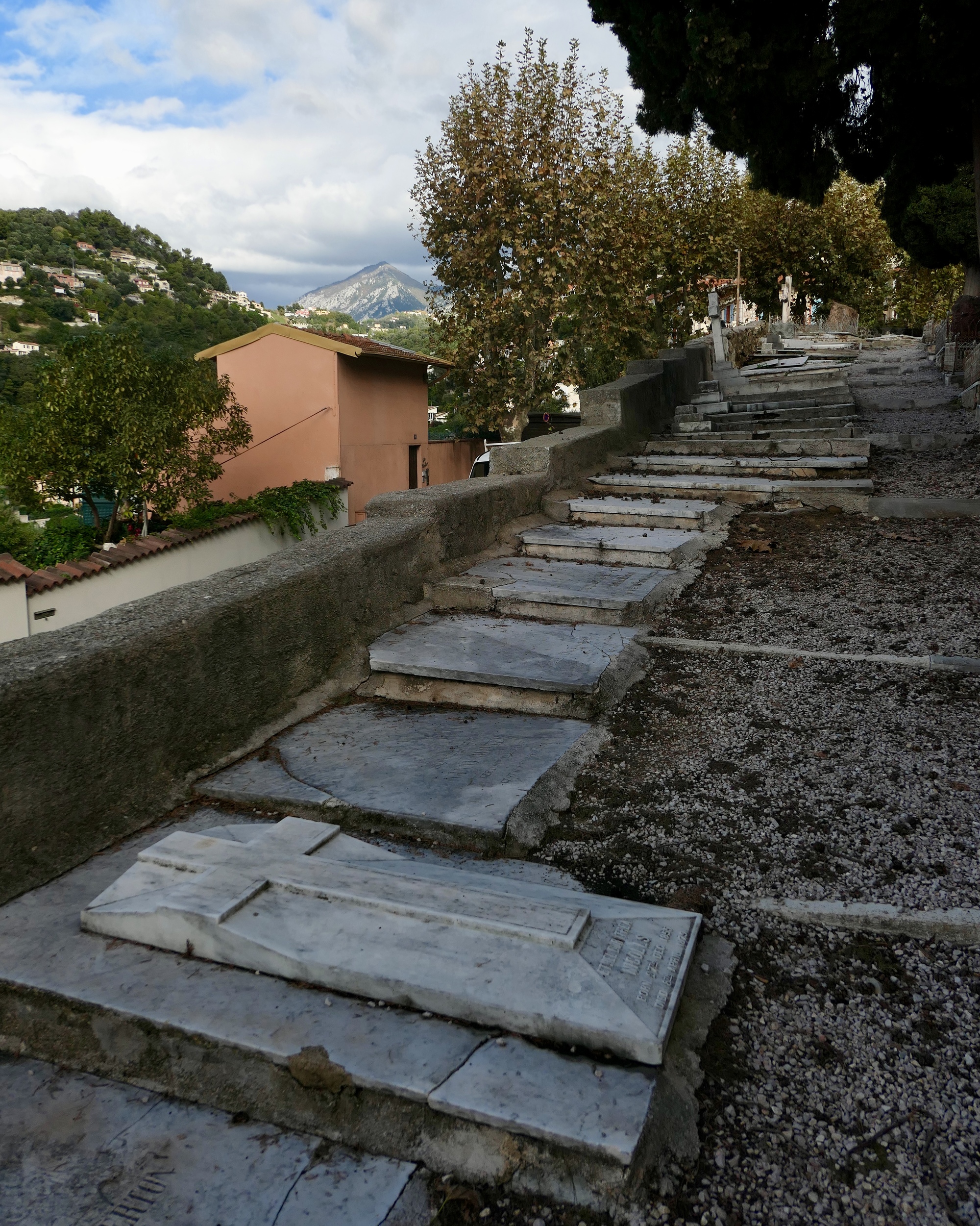 Eventually I work my way out of the maze and arrive at the base of the large cemetery that crowns castle hill (the castle itself is long gone). I’m not particularly a fan of cemeteries, but the one in Menton is very special and worth a good visit for several reasons. First, the setting is spectacular, overlooking the bay, the city, the monuments, and the mountains. It is a great place to be just for the vista it affords.