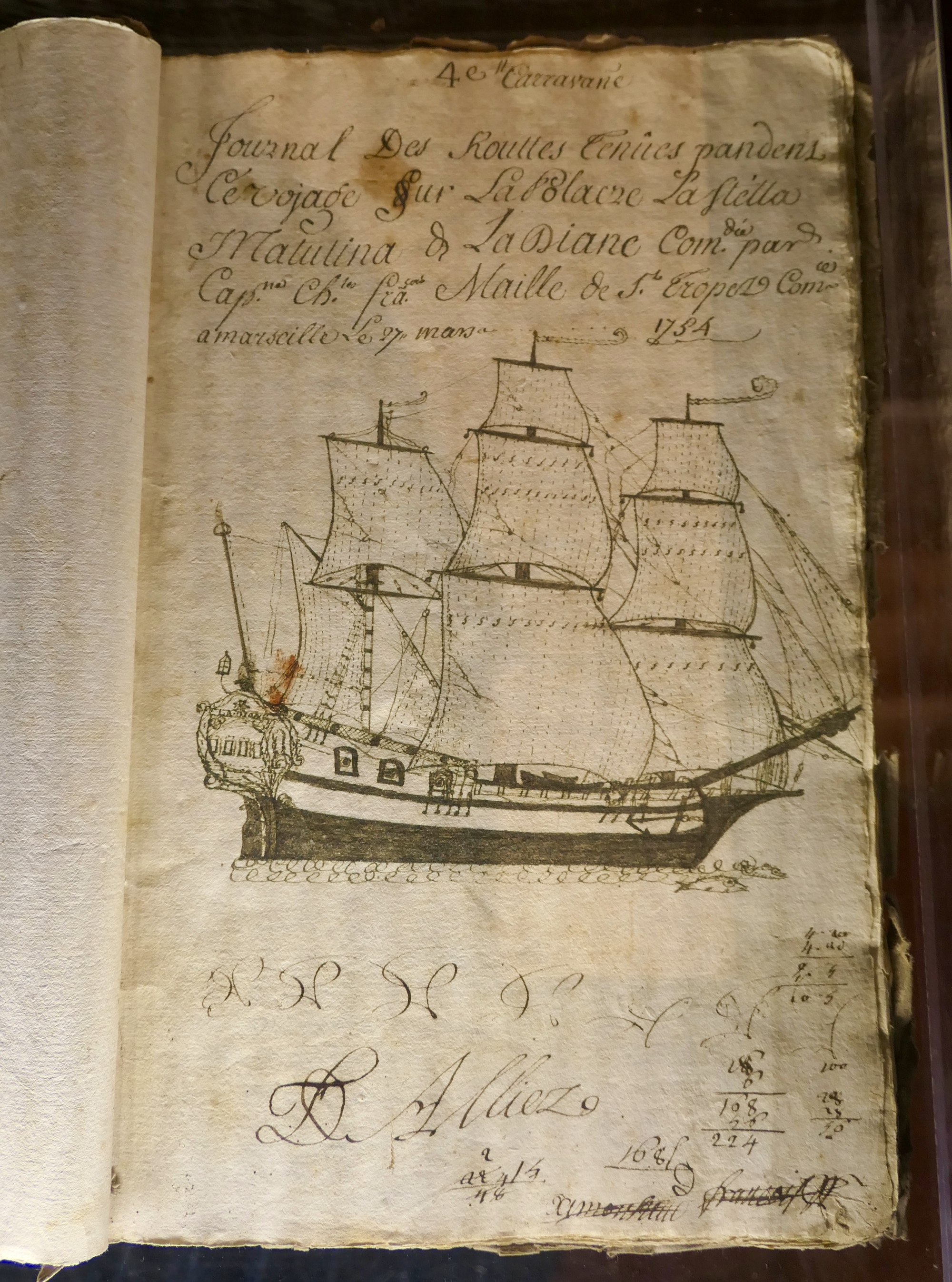 Title page of the log book from the ‘officier de plume’ (the ship’s official writer) of the Stella Maturina. According to the museum, most seagoing Levantine vessels in this era included a writer to keep a record of the expedition.