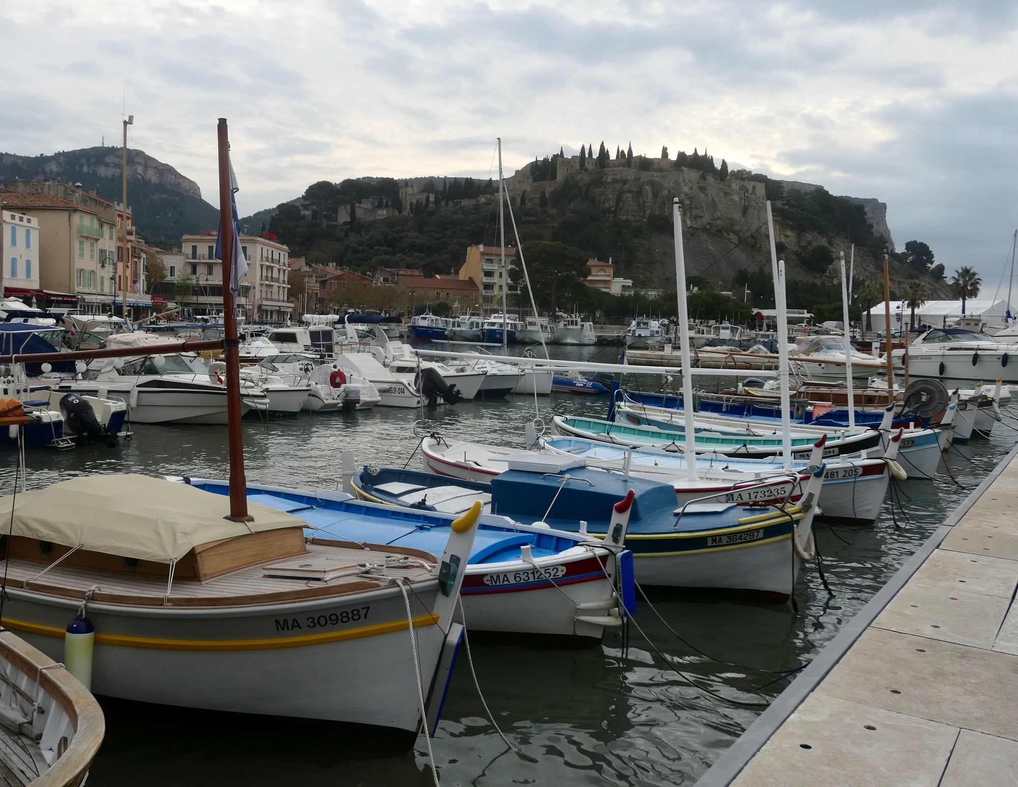On the waterfront, Cassis. The white cliff above the near ridge is one of the famous Calanques.