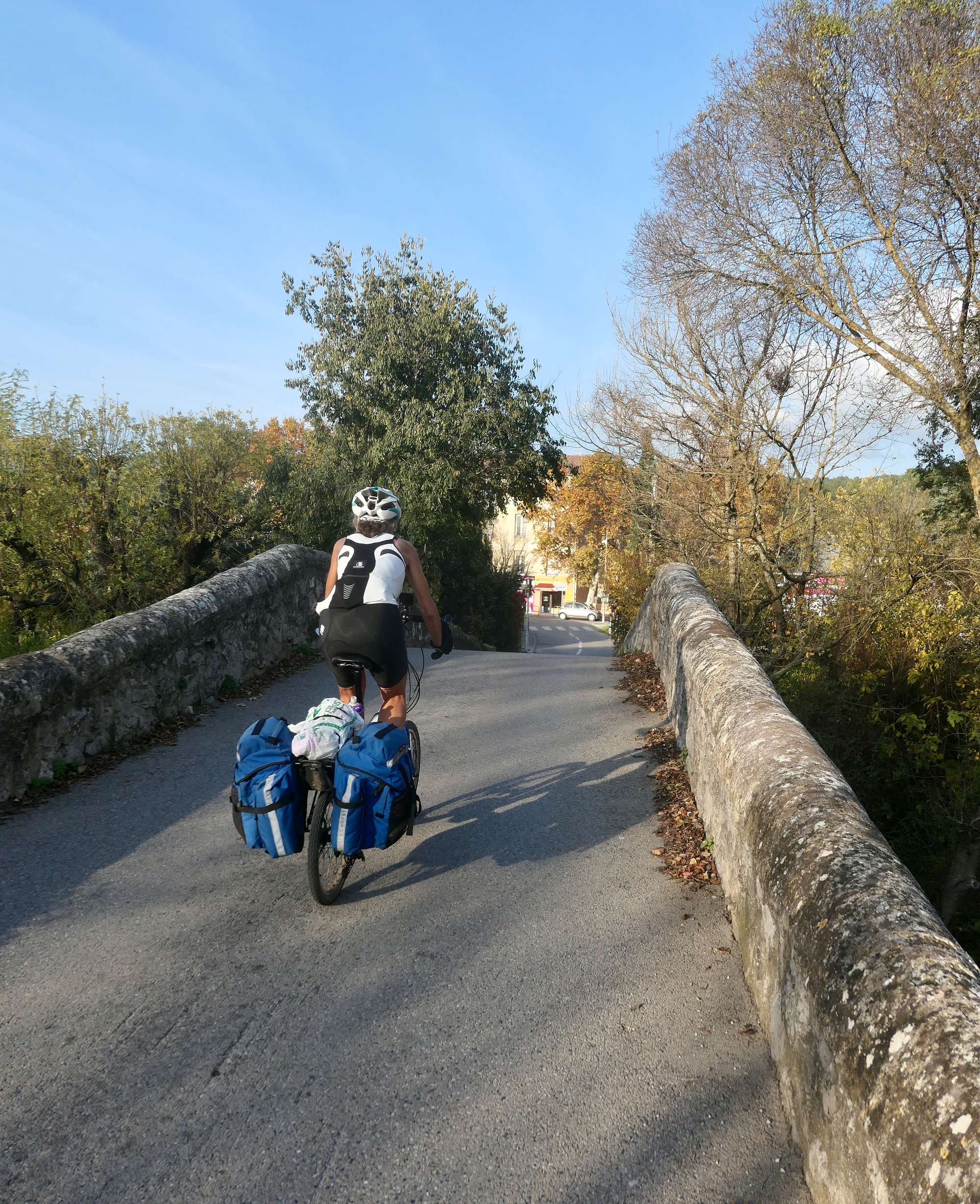 Crossing the Arc on the Trois Sautets Bridge. We agree, this is much better Han hopping across the river. Mak3s us think of our small portage a few days back.