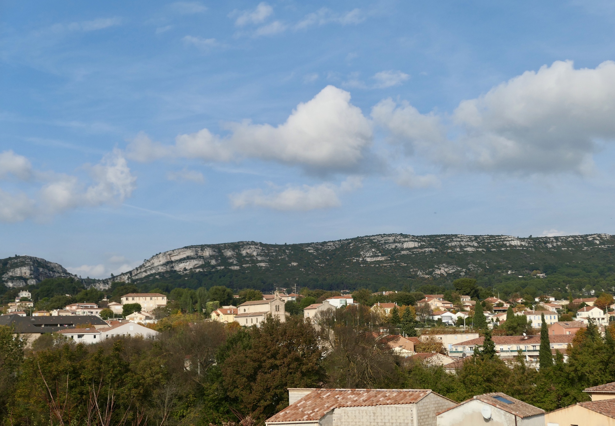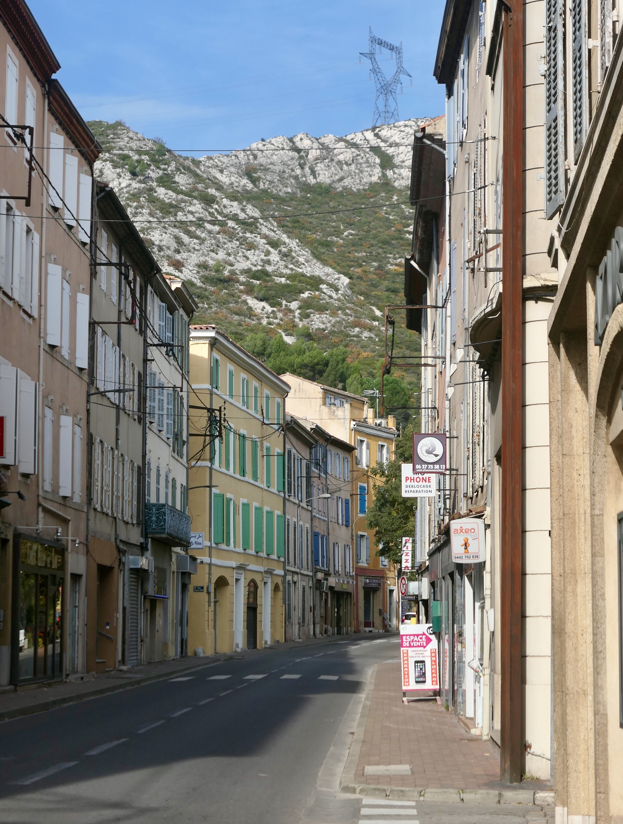 At Roquevaire, where we stopped for a sidewalk lunch. No, not a sidewalk cafe - just a sidewalk. We were ready for our break so we just sat down on the first clearing we came to. A hundred yards later we came to a clearing and park with nice views, but the deed was done.
