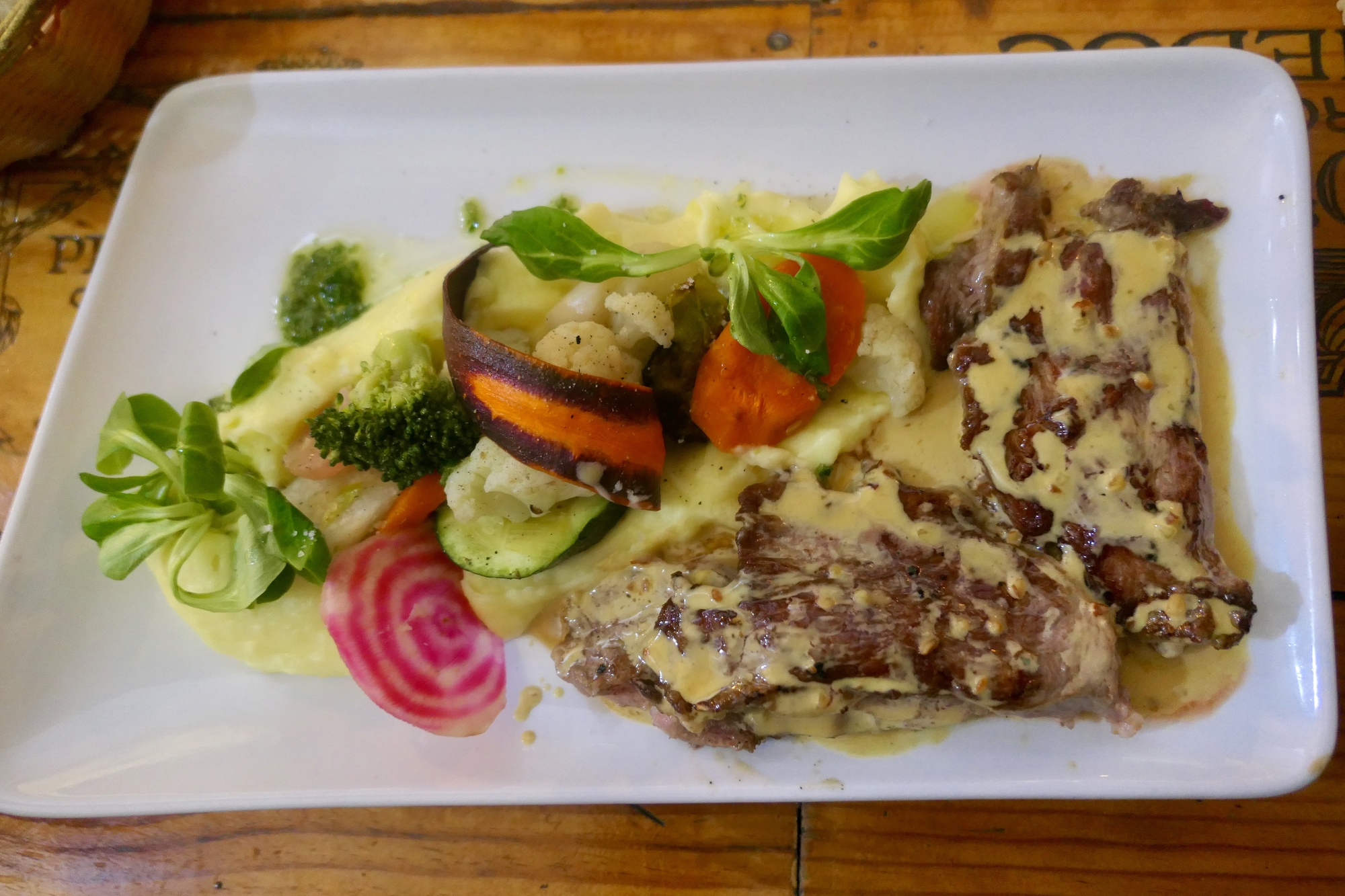 A restaurant and meal we’d like to remember. Le Petit Verdot, an intimate and warm restaurant in the pedestrian zone; and a Spanish pork dish with mustard and onion sauce, mashed potatoes, and a colorful array of vegetables. I love the look of the radish slice and carrot strip.