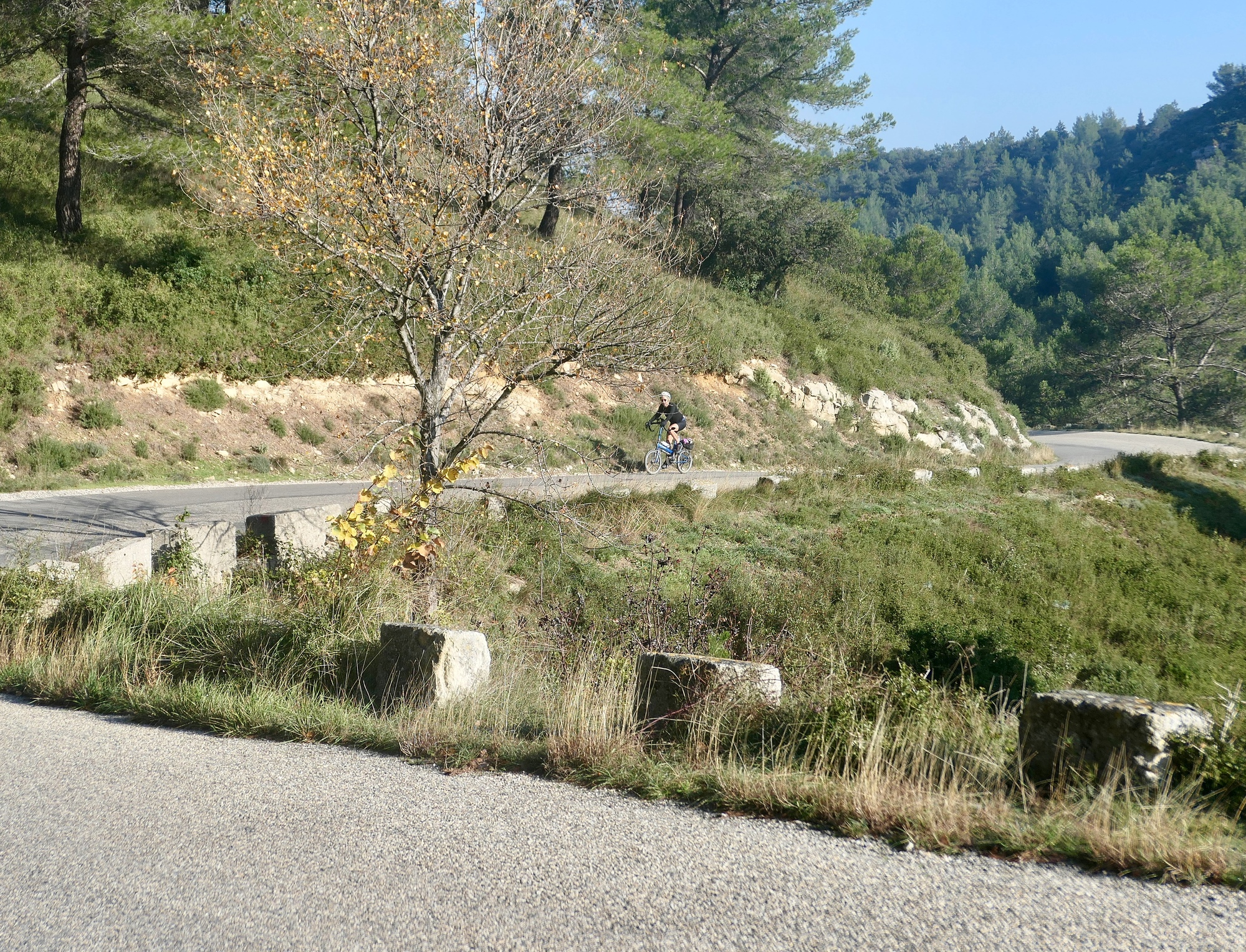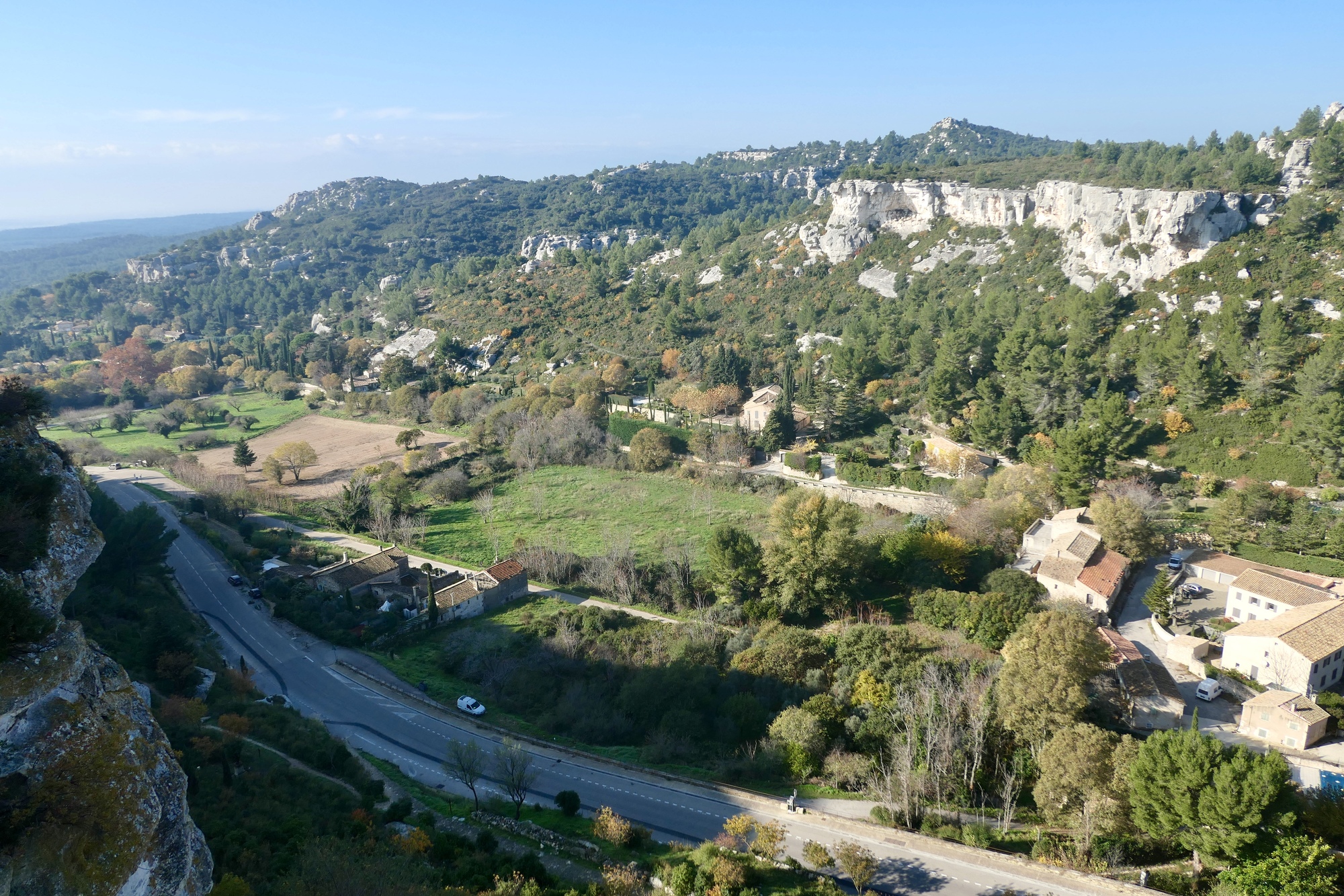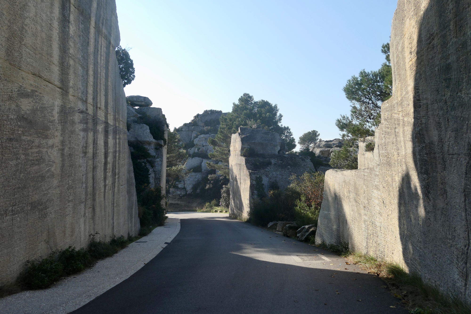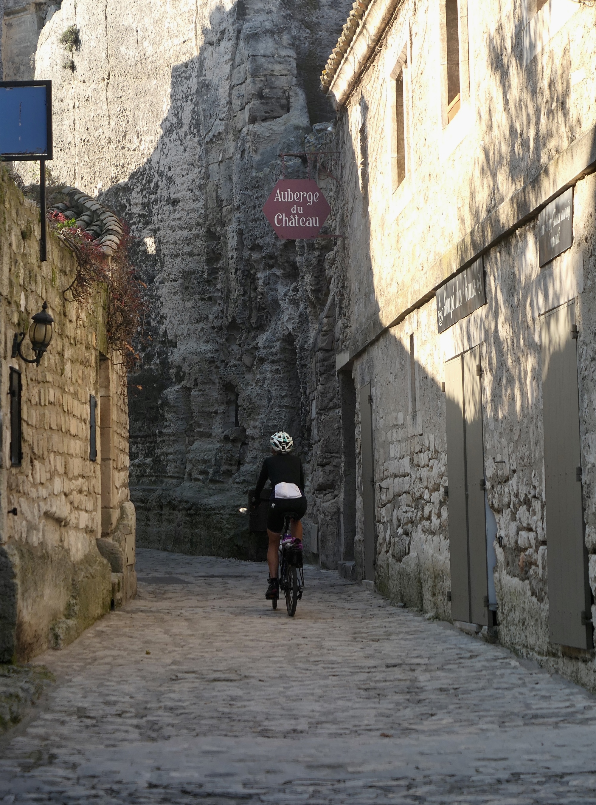 It is a short, not difficult climb up to Les Baux. It is a very attractive climb, snaking upward beneath limestone cliffs with Le Baux intermittently visible just ahead. The road is very quiet, which reflects the season - I imagine it is quite busy in the warmer months. The video gives a good feeling for this ride.