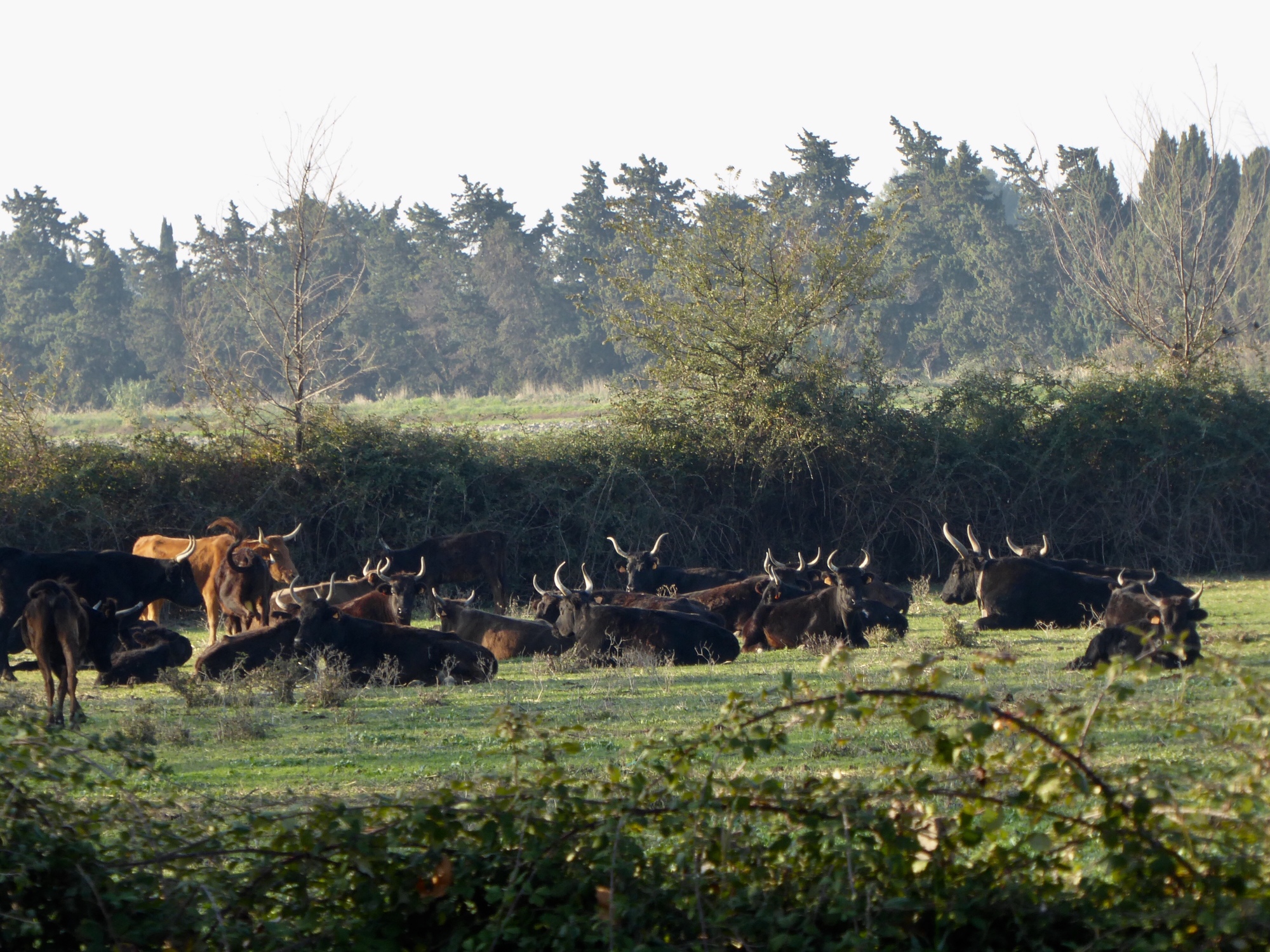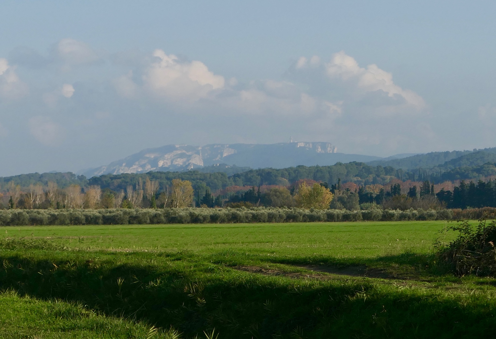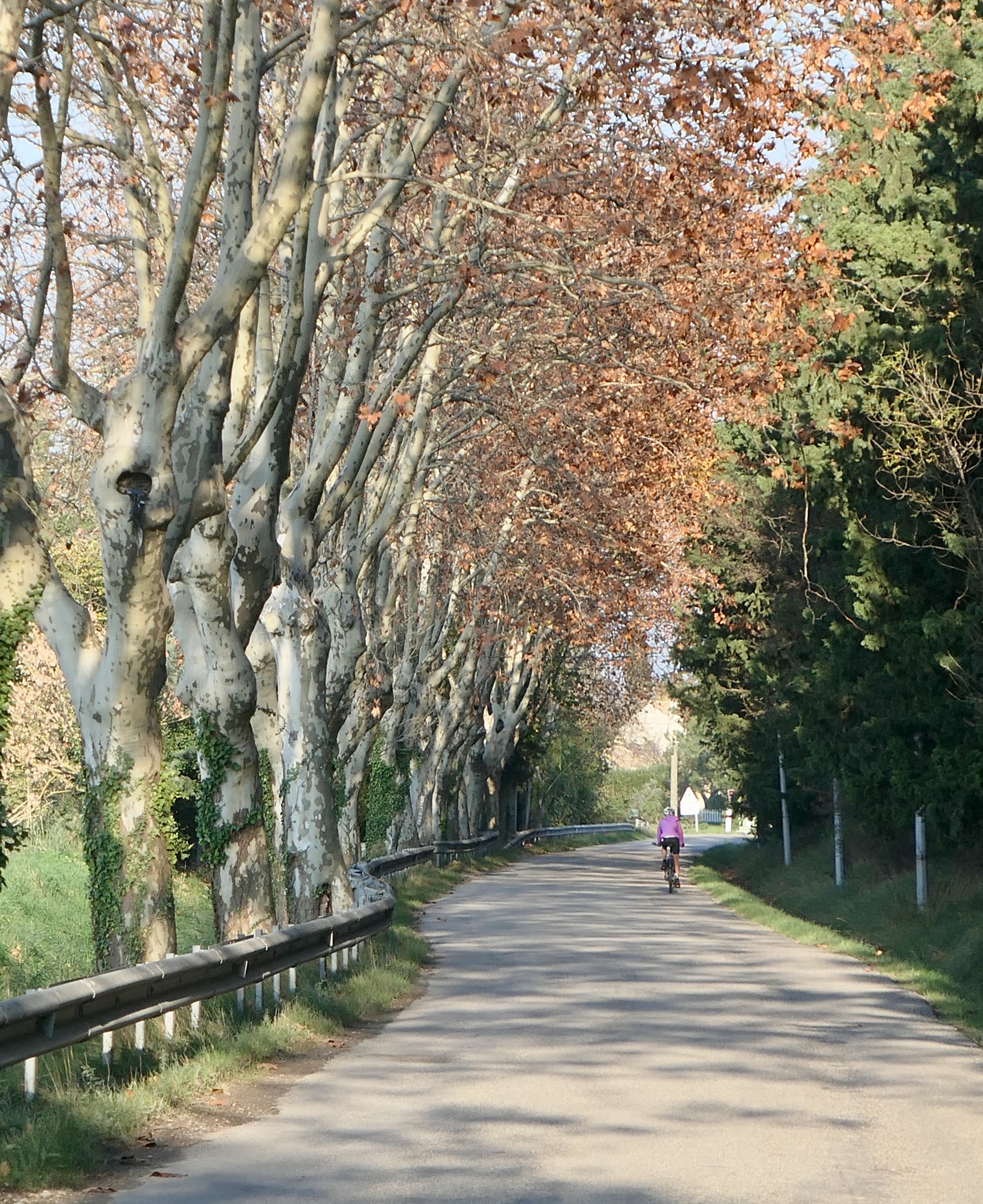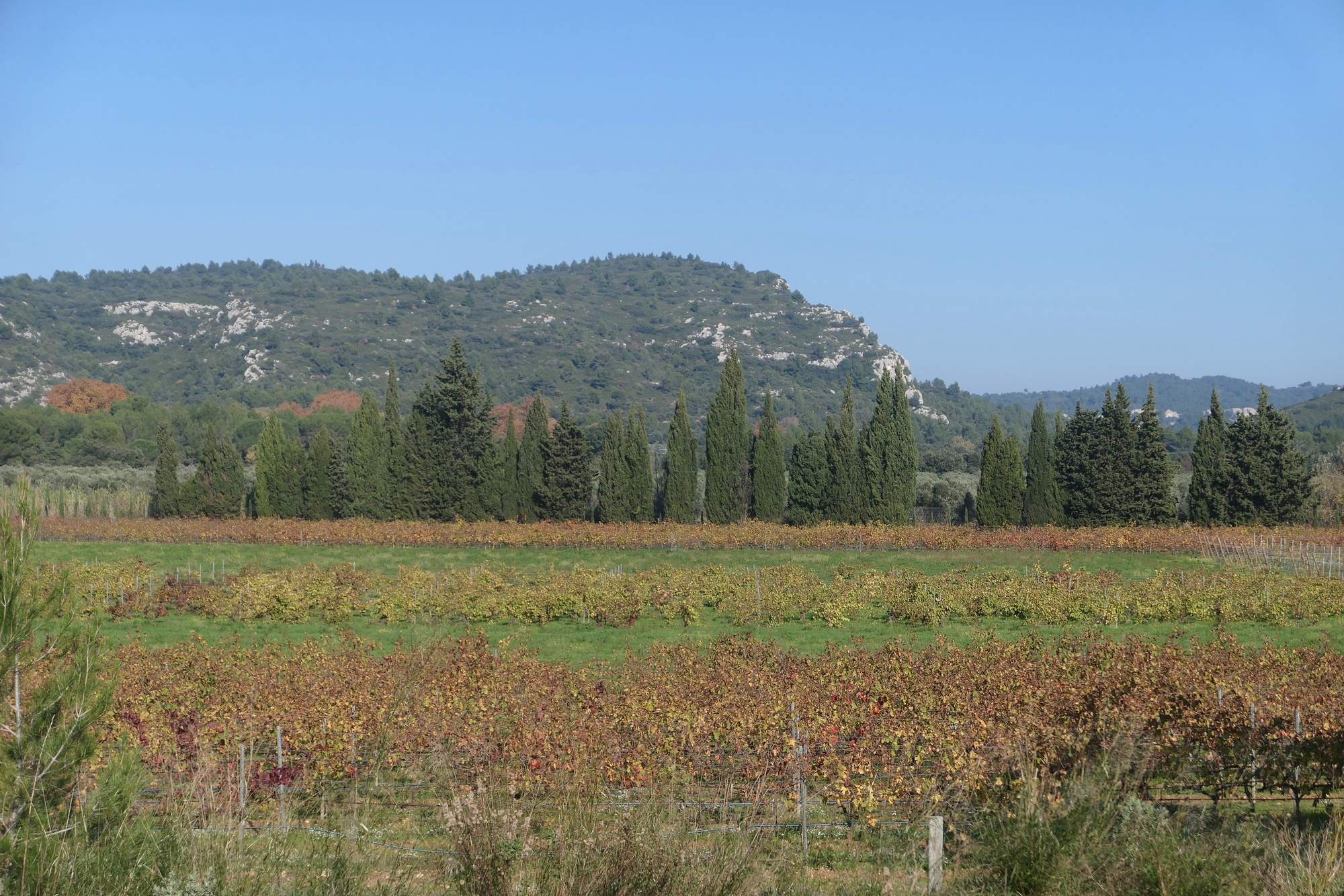 Dropping down from Les Baux, we biked the rest of the day at low elevation, alongside agricultural fields with the Alpilles on the horizon.