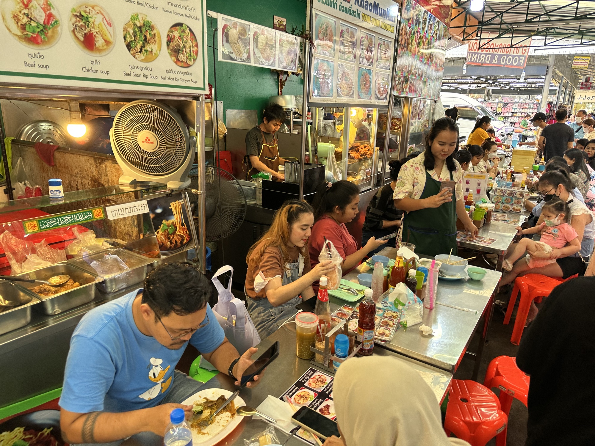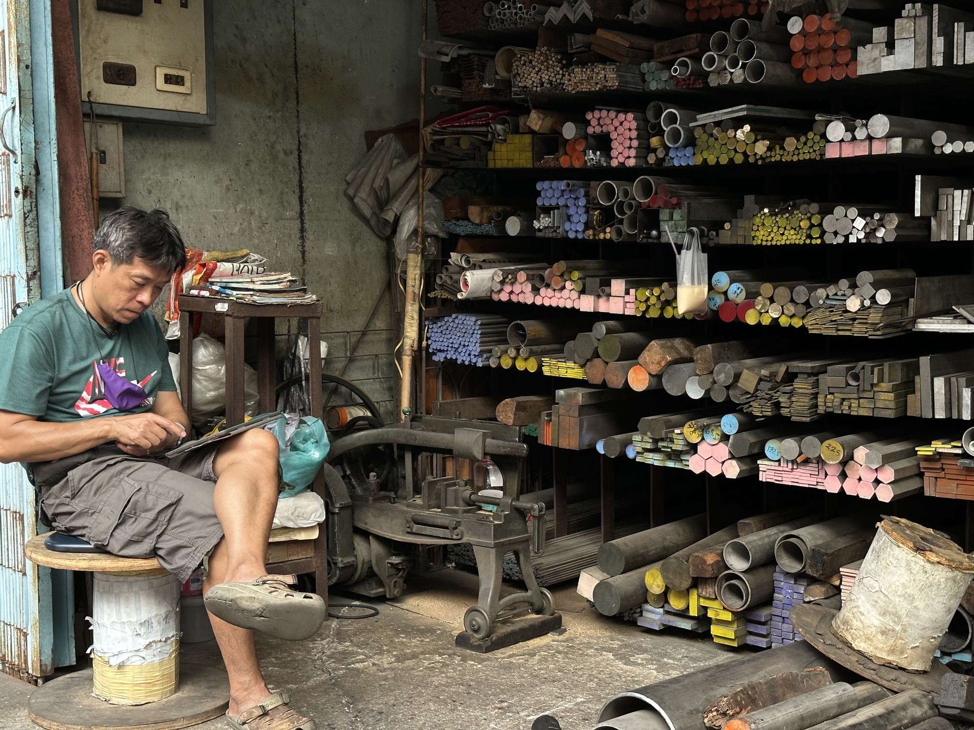 Everything happens on the streets: From men cutting metal rods - sparks flying - to fish drying on racks, to people selling anything, pearls to face masks and everything in between. Food is prepared, fried over red hot coals, fans blowing greasy smoke skyward, food everywhere and people eating at tables set up down little alleyways, blocking sidewalks and even in the street., Kind, happy, people everywhere munching on something or other, some rushing off to work in their pristine and pressed clothing, children in their natty school uniforms, and guys covered in black grease from working on motorbike engines; everyone seems to be eating something.