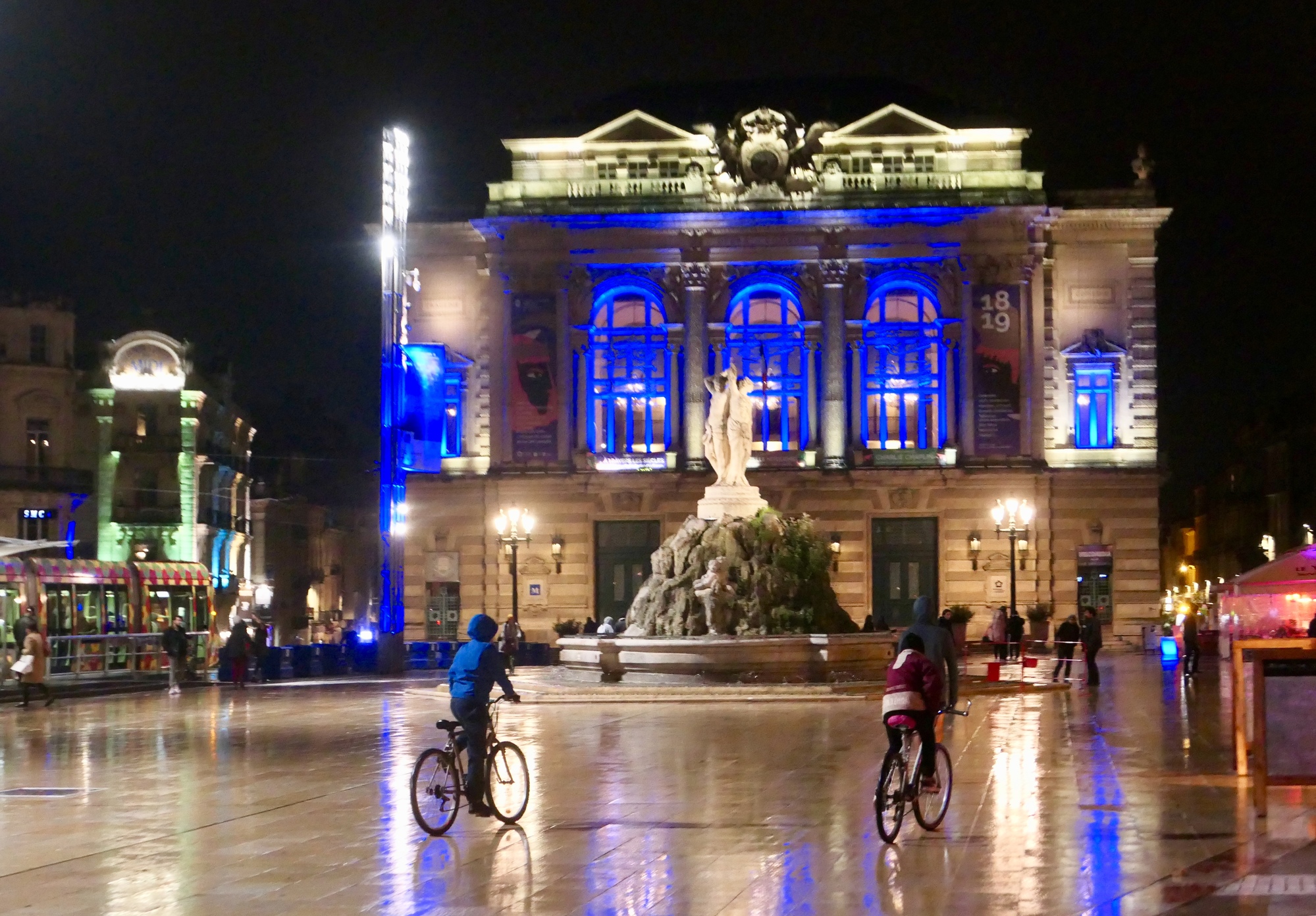 Beyond Sommieres, most of the fun is gone from the ride. In a few miles we lose our quiet lane and merge into busier roads that carry us the last fifteen miles to Montpellier. This is a big city, one of the largest in France, so we face the usual several miles of unpleasantness until we reach the core, which is well supported by a network of bike paths. We arrive at our apartment in the heart of the large, pedestrianized center cold; a bit wet, because it began lightly raining soon after reaching town; and a bit later than usual, arriving at 4:35.