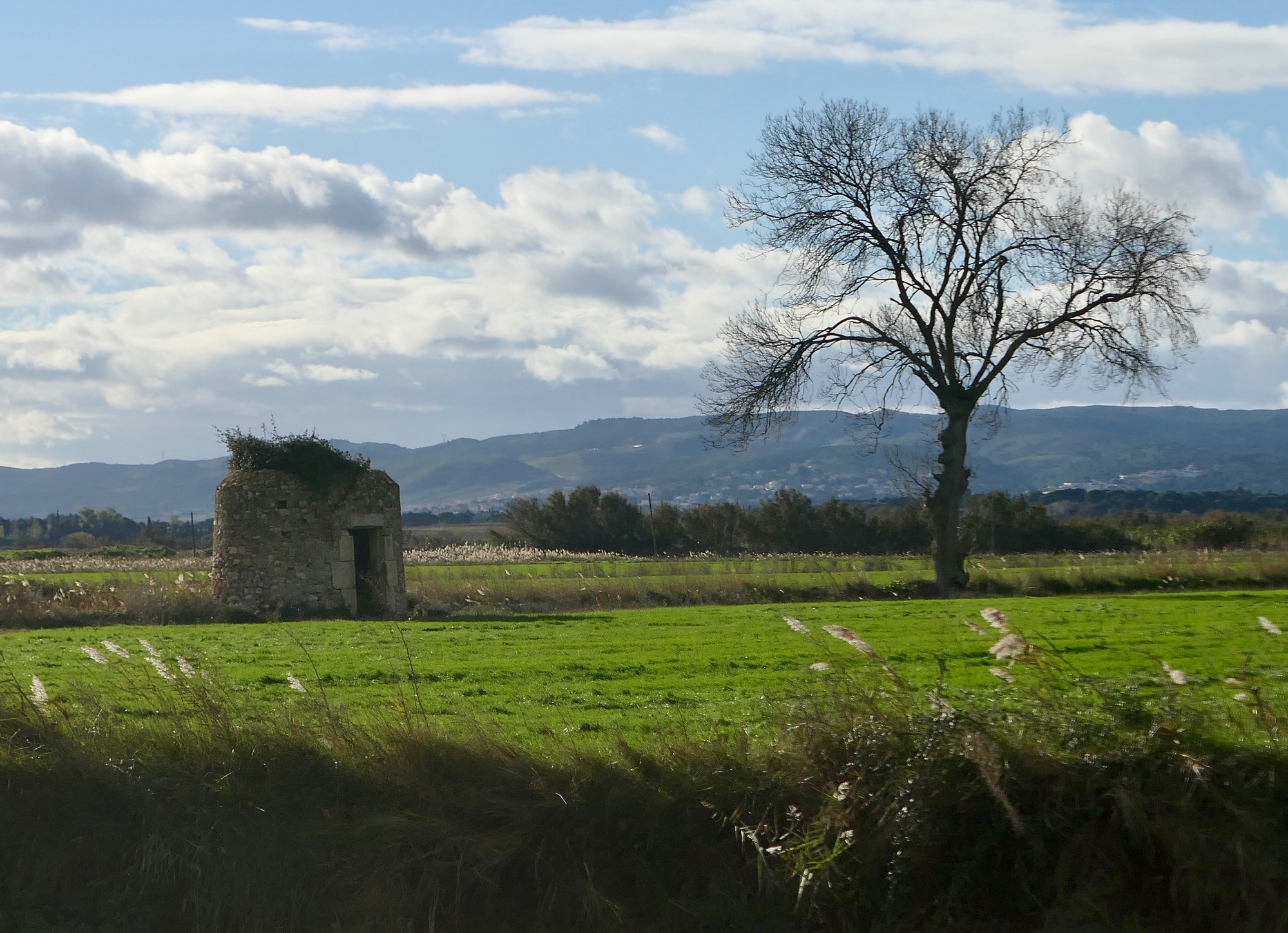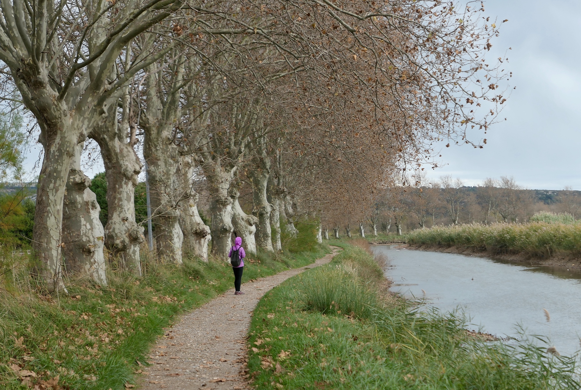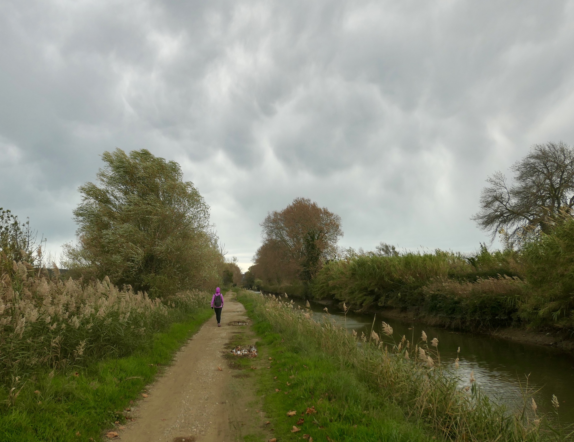 So, we scrap the bike ride idea and decide to take a walk instead. We wait a bit longer, and once the showers stop we set out along the canal de la Robine, the canal that runs from Narbonne nine to the coast which we biked along in the way to town yesterday. We have the idea that we’ll walk south a ways and then climb up into the hills a bit, hoping for a view of the mountains. We never get the views though, because there are no paths from the canal into the hills without going far south.