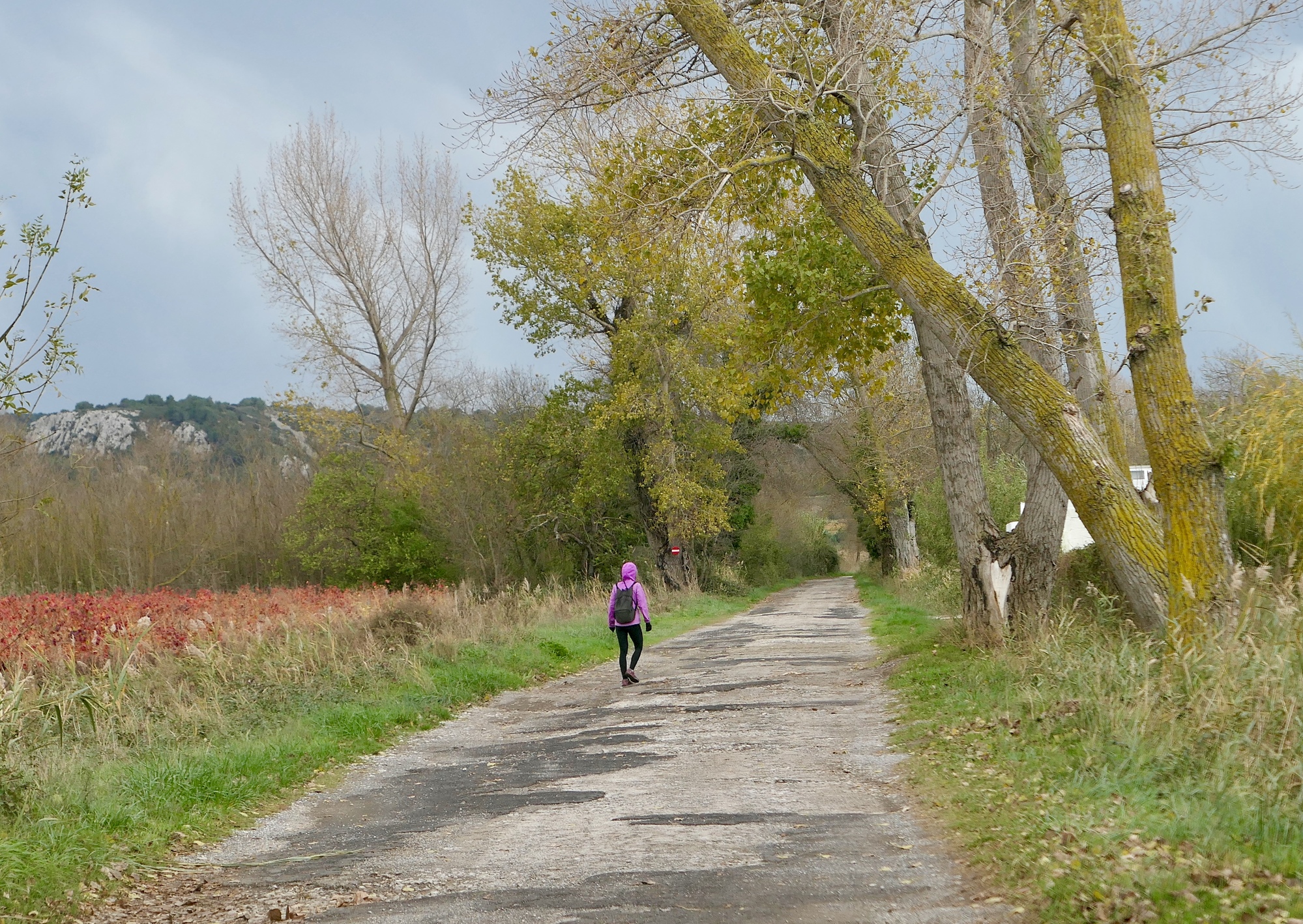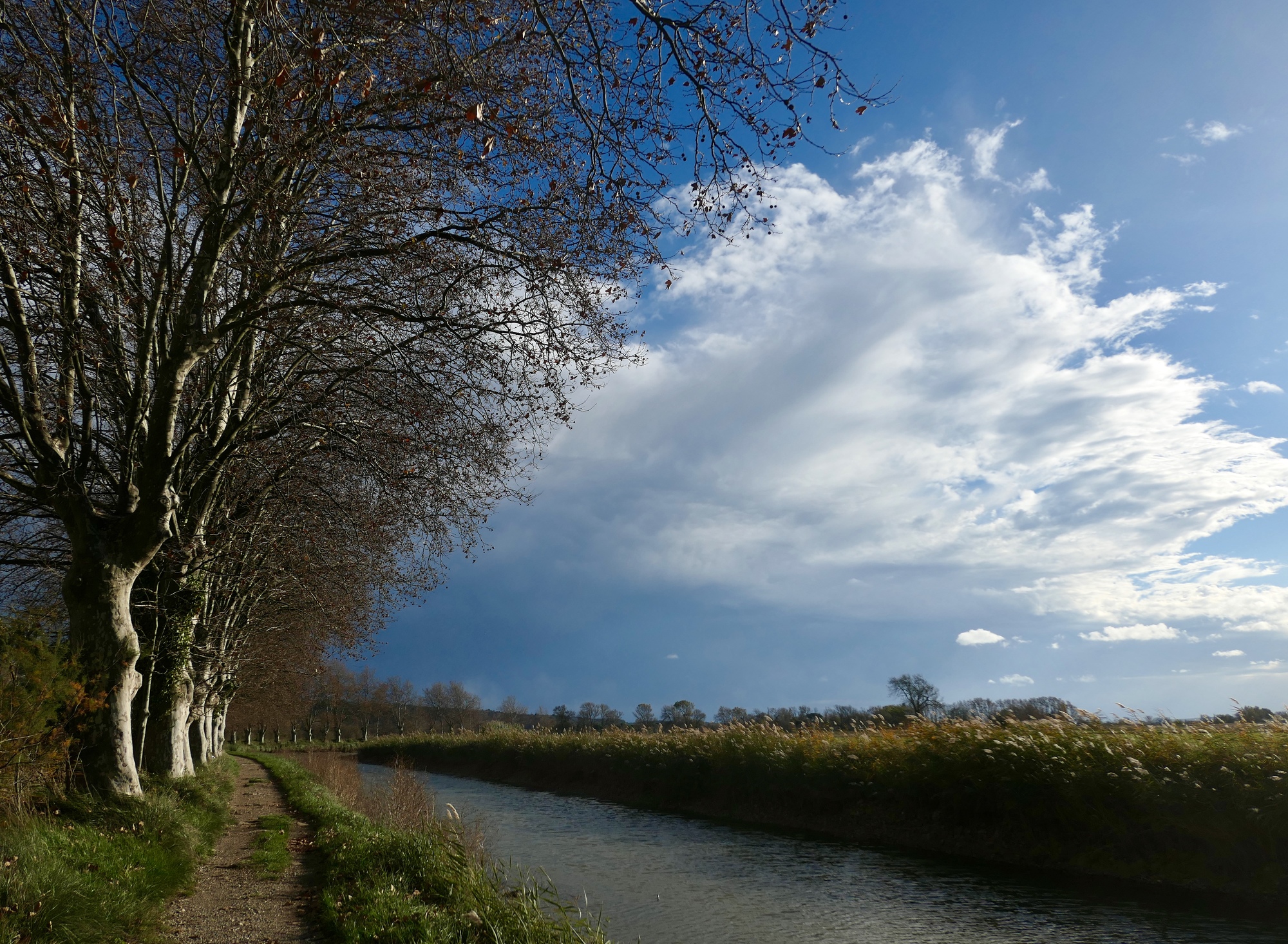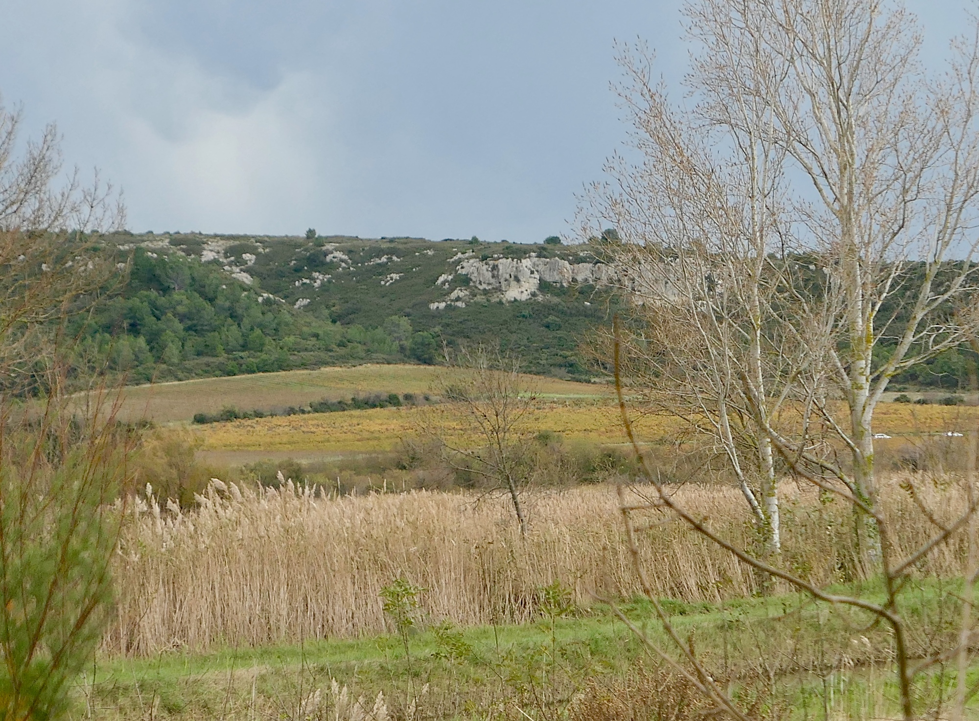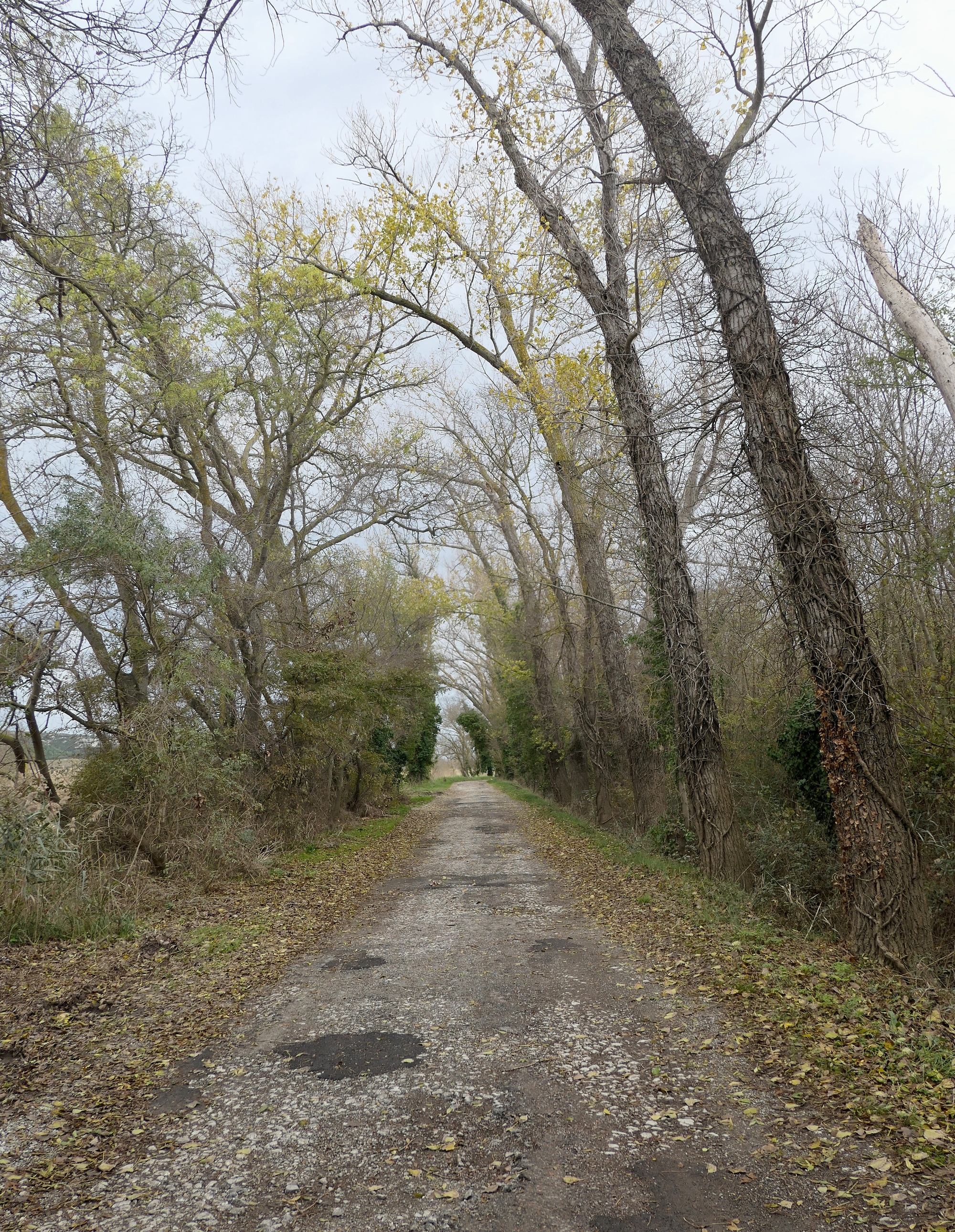 So, we scrap the bike ride idea and decide to take a walk instead. We wait a bit longer, and once the showers stop we set out along the canal de la Robine, the canal that runs from Narbonne nine to the coast which we biked along in the way to town yesterday. We have the idea that we’ll walk south a ways and then climb up into the hills a bit, hoping for a view of the mountains. We never get the views though, because there are no paths from the canal into the hills without going far south.