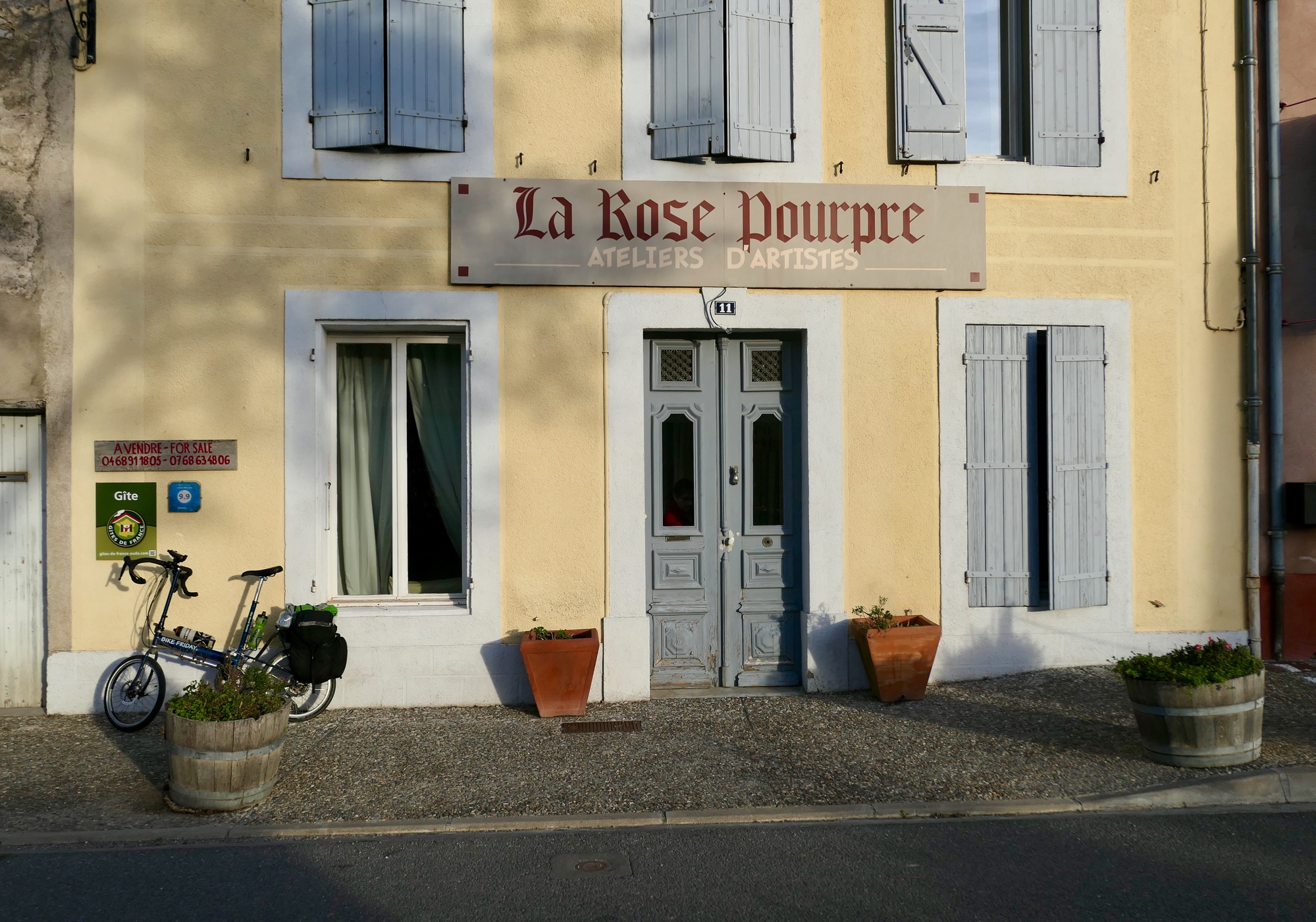 At our lunch stop, I think in Saint-Laurent-de-la-Cabrerisse. I don’t know why I look so frownu-faced here. I asked Rachael to take this photo, as a reminder of how wonderful it felt sitting here in the sun, leaning against the warm stone wall.
