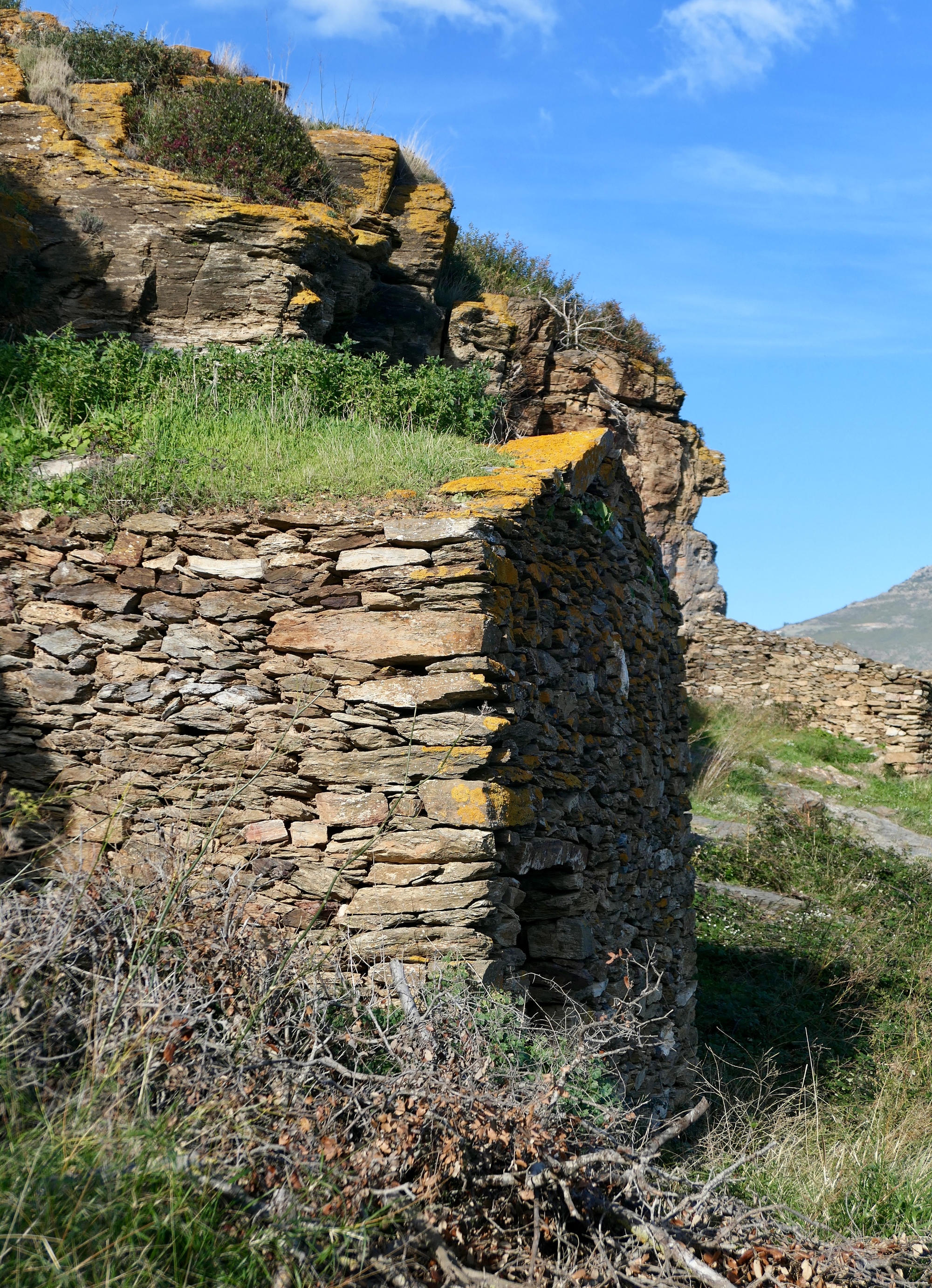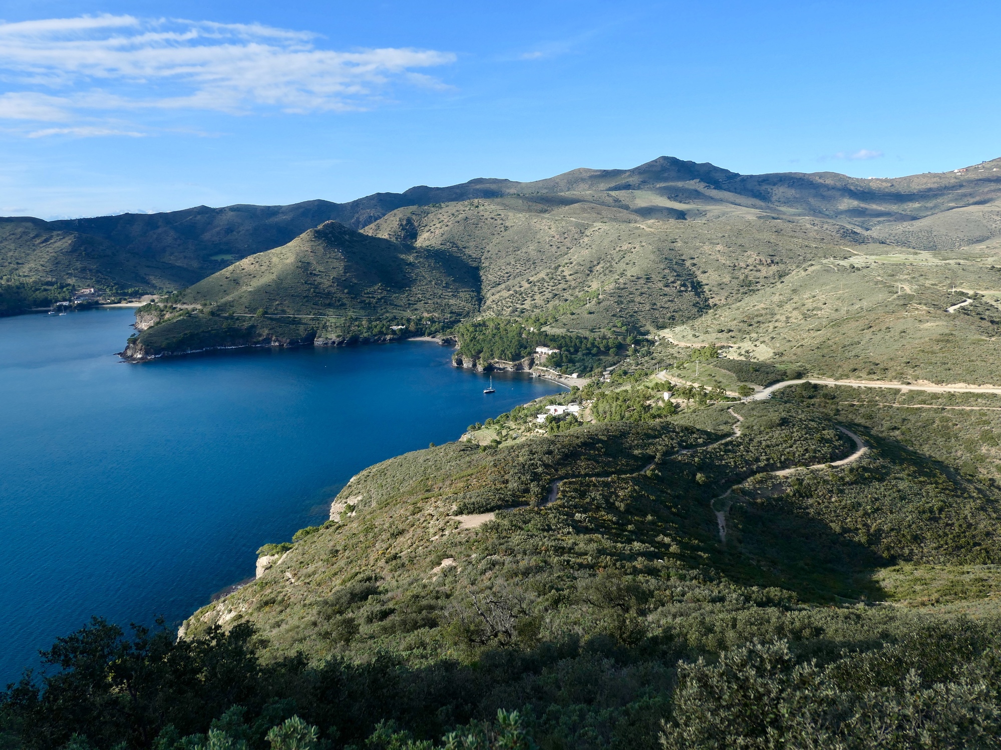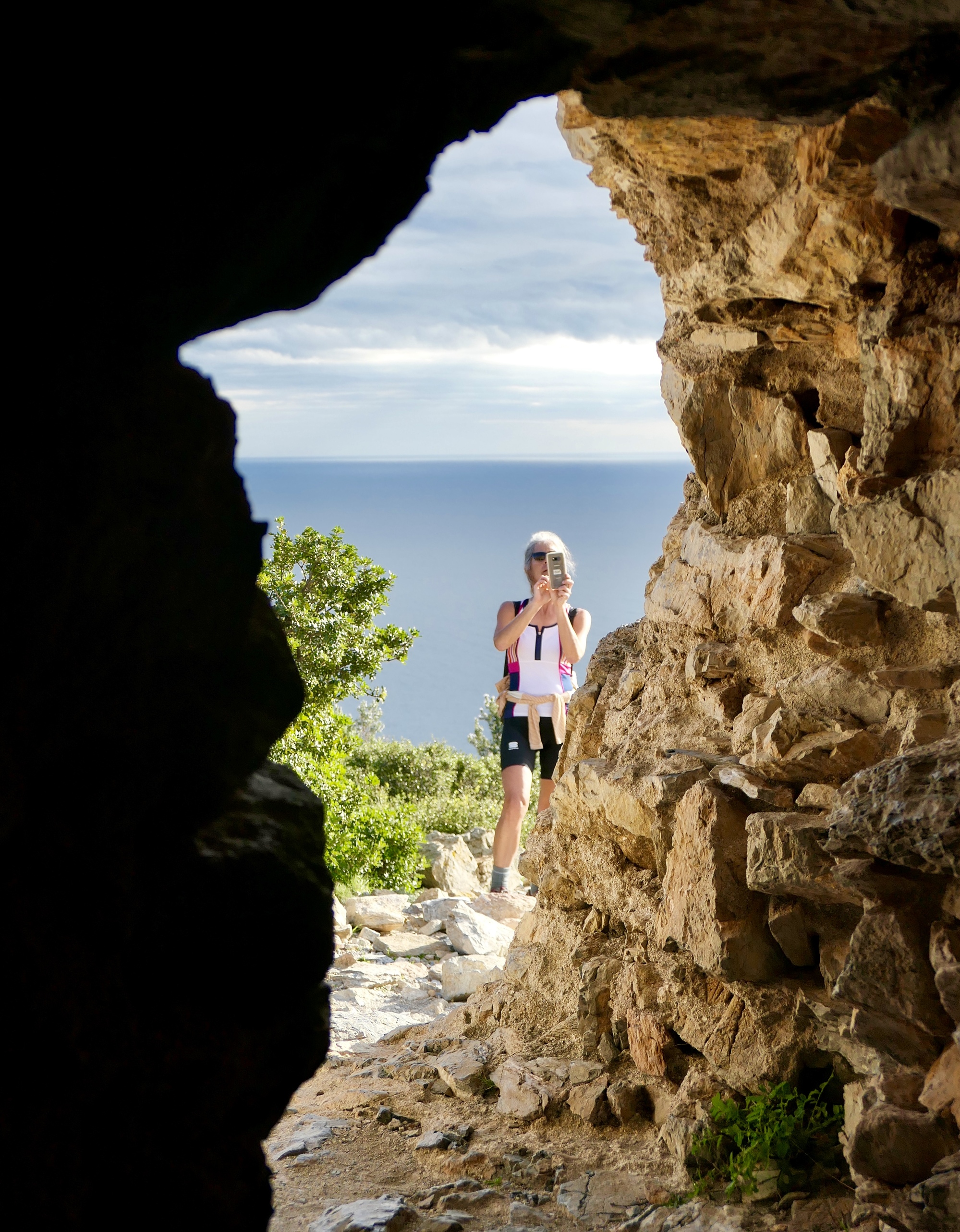 We found ourselves just a bit confused at the orientation sign. We intended to walk out to the end of th cape, but with four roads or paths to choose from we couldn’t quite orient ourselves and picked the wrong one, finding ourselves walking up the south side of the cape on a short trail that dead ends at the hermit’s cave. It was a lucky mistake, because we got some fine views south along Cap Creus, and the cave was very interesting to explore. It’s a bit remote and Cred, but I think we could mak3 it work for us. Since our plans for the flat in Ceret fell through, we’re considering making a bid on the cave.