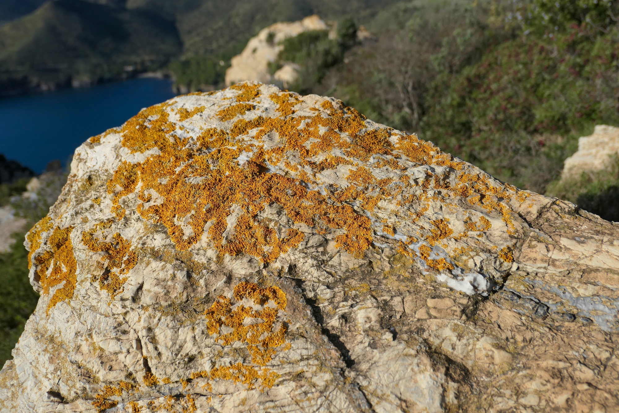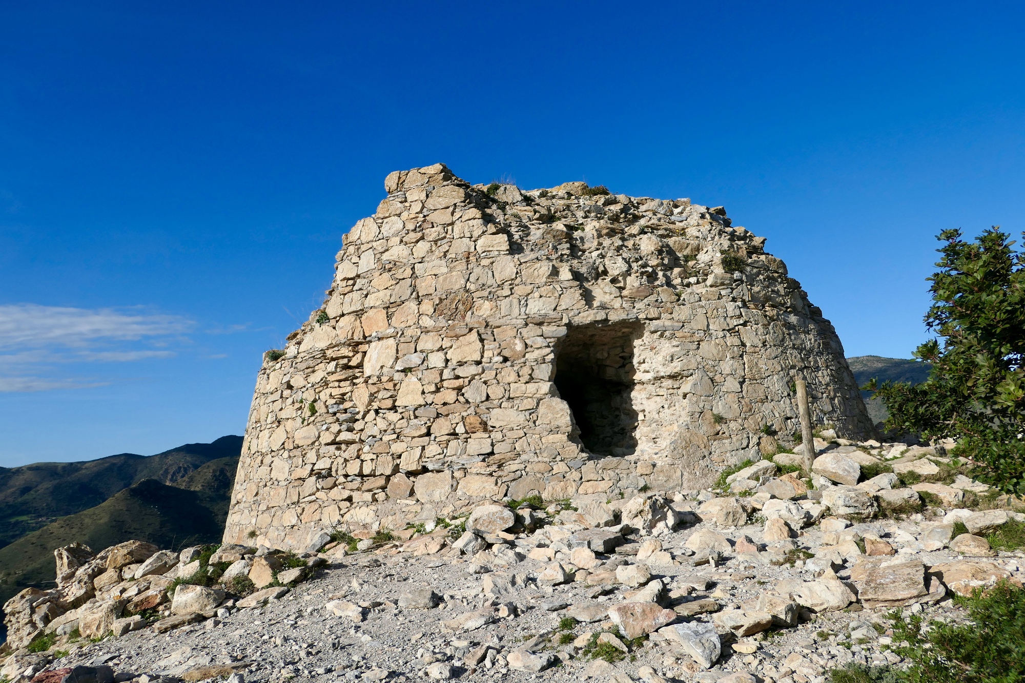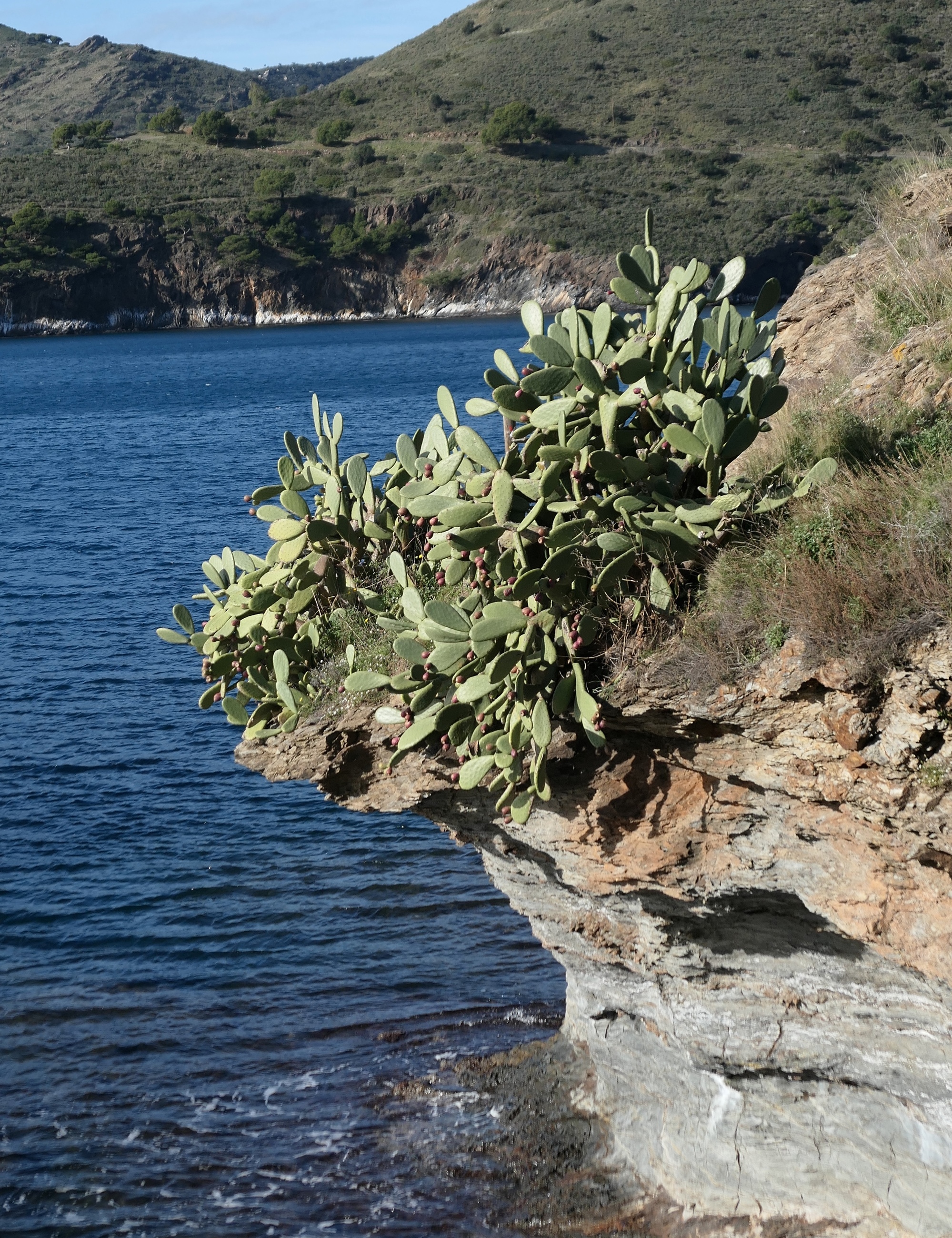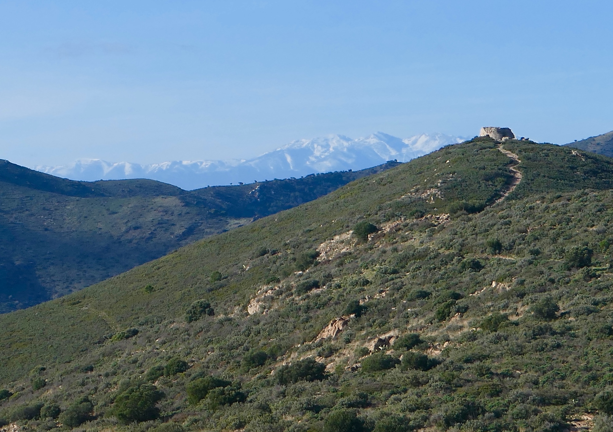 We found ourselves just a bit confused at the orientation sign. We intended to walk out to the end of th cape, but with four roads or paths to choose from we couldn’t quite orient ourselves and picked the wrong one, finding ourselves walking up the south side of the cape on a short trail that dead ends at the hermit’s cave. It was a lucky mistake, because we got some fine views south along Cap Creus, and the cave was very interesting to explore. It’s a bit remote and Cred, but I think we could mak3 it work for us. Since our plans for the flat in Ceret fell through, we’re considering making a bid on the cave.