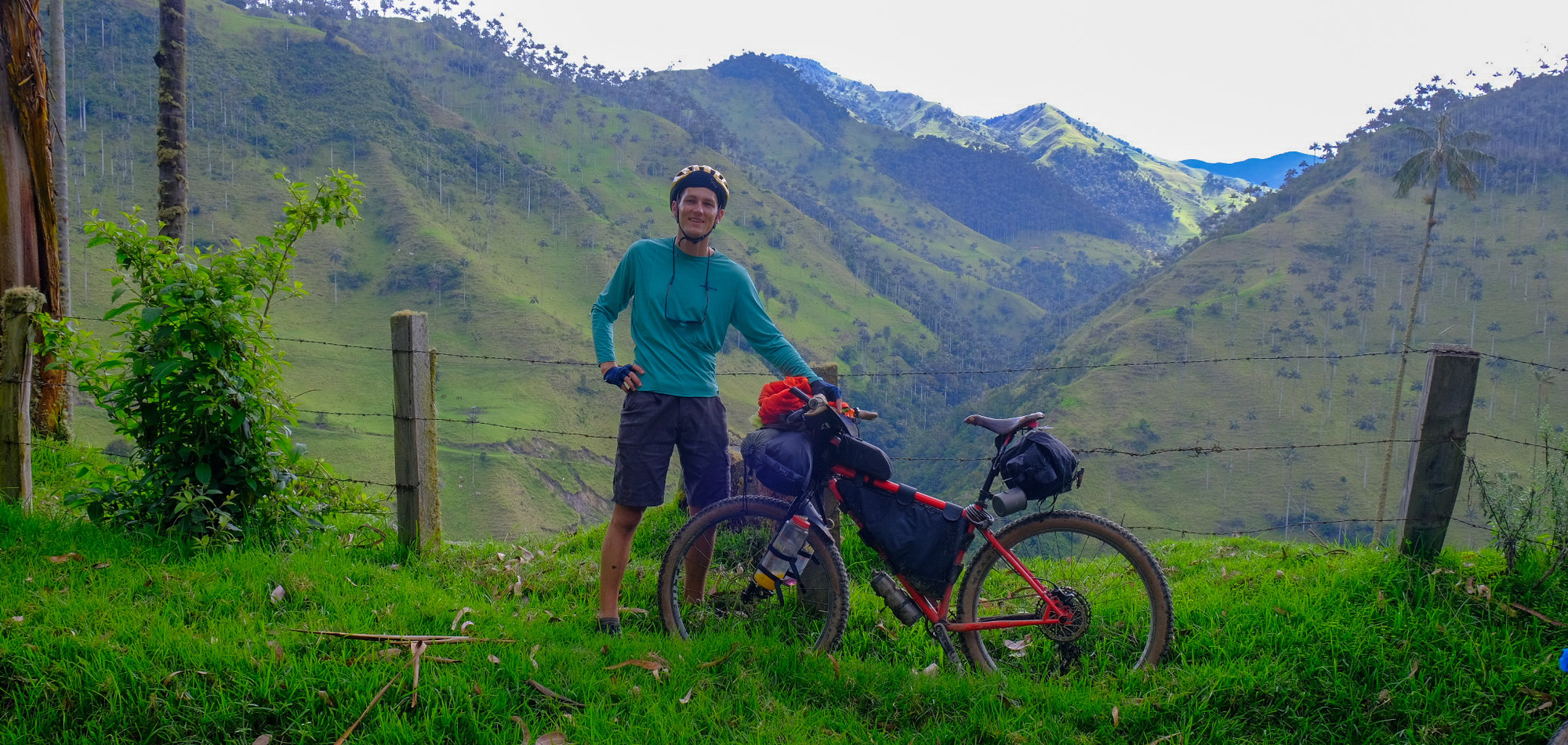 There was something so peculiar about seeing pine trees intermixed with palm and eucalyptus trees, although they all thinned out as we crested 11,000 feet. It was cold, and as we reached the summit a steady rain began to fall. It was time to dust off my Kermit green rain suite and dawn it for the coming descent. We stopped at a roadside stand for a hot cup of aguapanela before beginning our first of two descents into Toche.