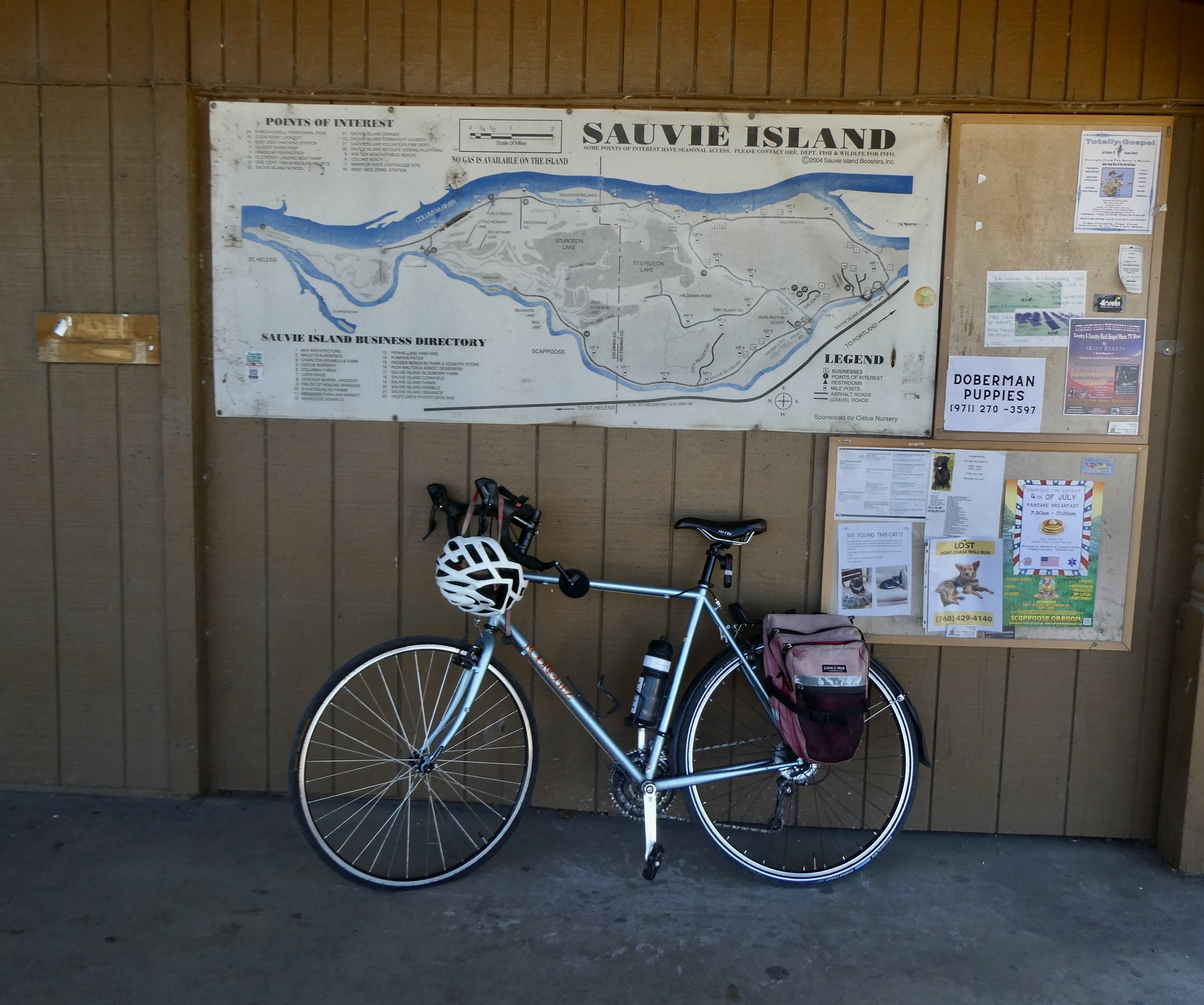 It’s a fine morning though, and we follow pretty much the identical script as the last two times: we ride the core loop counterclockwise again, Rachael pulling ahead as usual and then waiting by the rest stop at its north end; and then we take the spur north up the west side of the island. Rachael, ahead again, rides it to the end of the pavement and back, far enough that she’ll claim 48 miles by the time she makes it home.