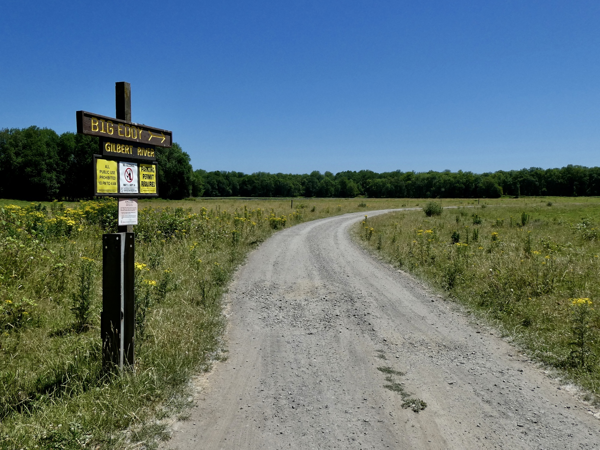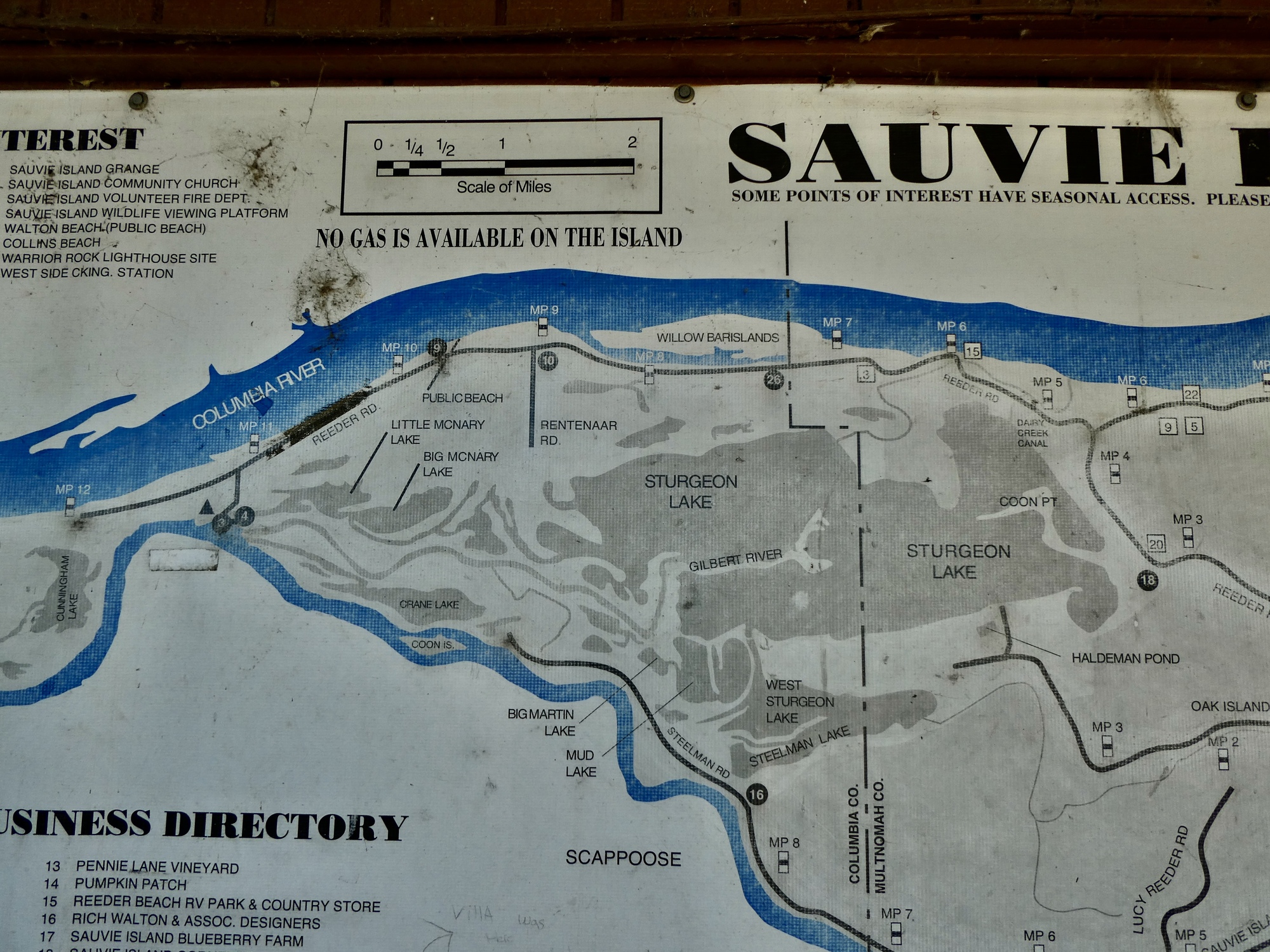 About a mile past pavement’s end I come to a fork in the road, and take it. I could keep going straight north for other views of the channel, but I’m intrigued by the sign. Big Eddy? Gilbert River? I didn’t know Sauvie even had a river, so let’s take a look.