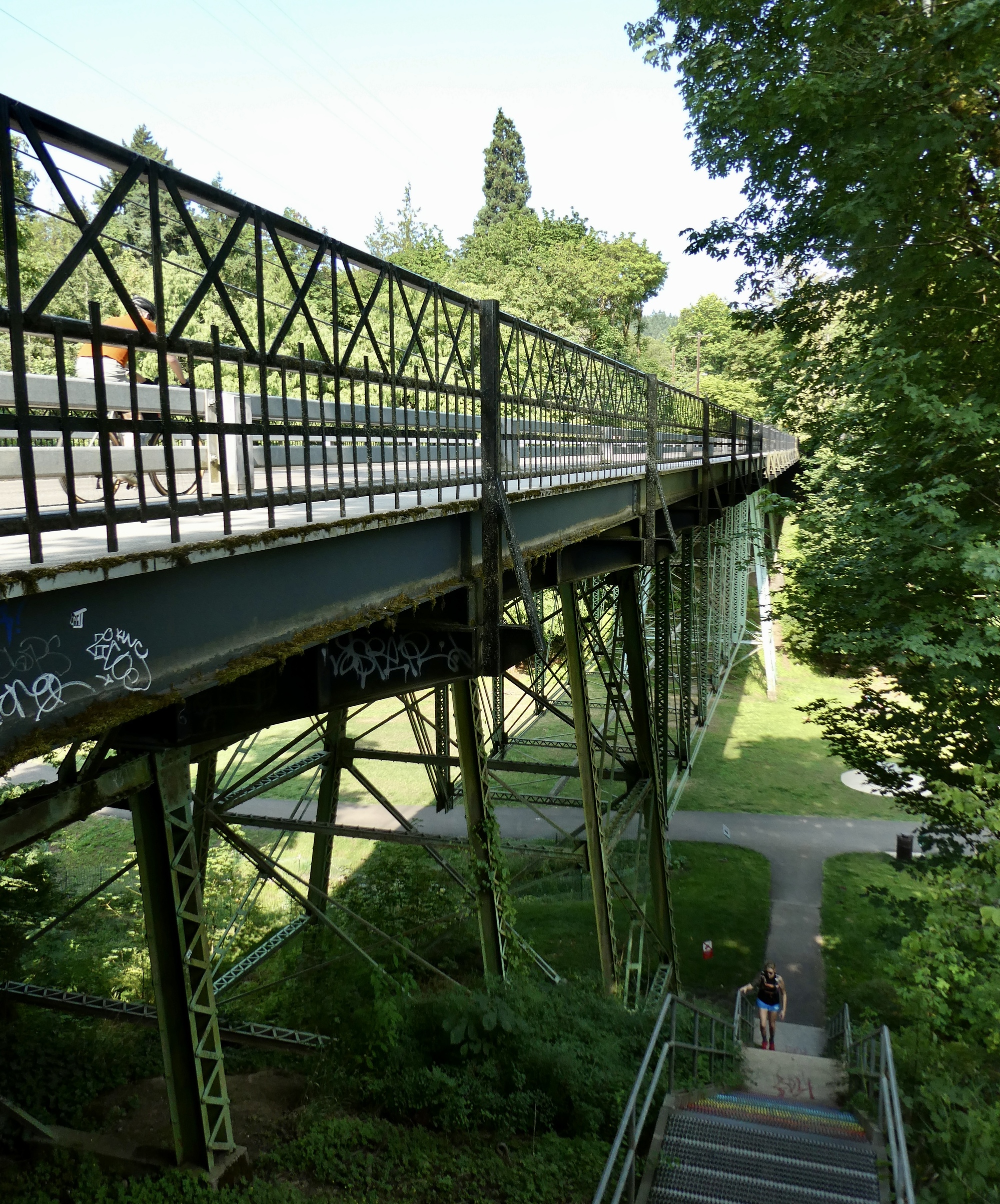 Whatever. It’s the beginning of a hopefully brief heat wave and the day is supposed to top out at 100, so we both get an early start. Rachael’s out the door by eight, and I leave about 20 minutes later. My walk plan is a nine mile loop up into the west hills: through the Alphabet Blocks to Lower Macleay Park and the entrance to the Balch Creek Trail; up Balch Creek to its junction with the Wildwood Trail; follow the Wildwood past Pittock Mansion and the new Barbara Walker footbridge across Burnside, and then down through Washington Park past the Rose Garden.