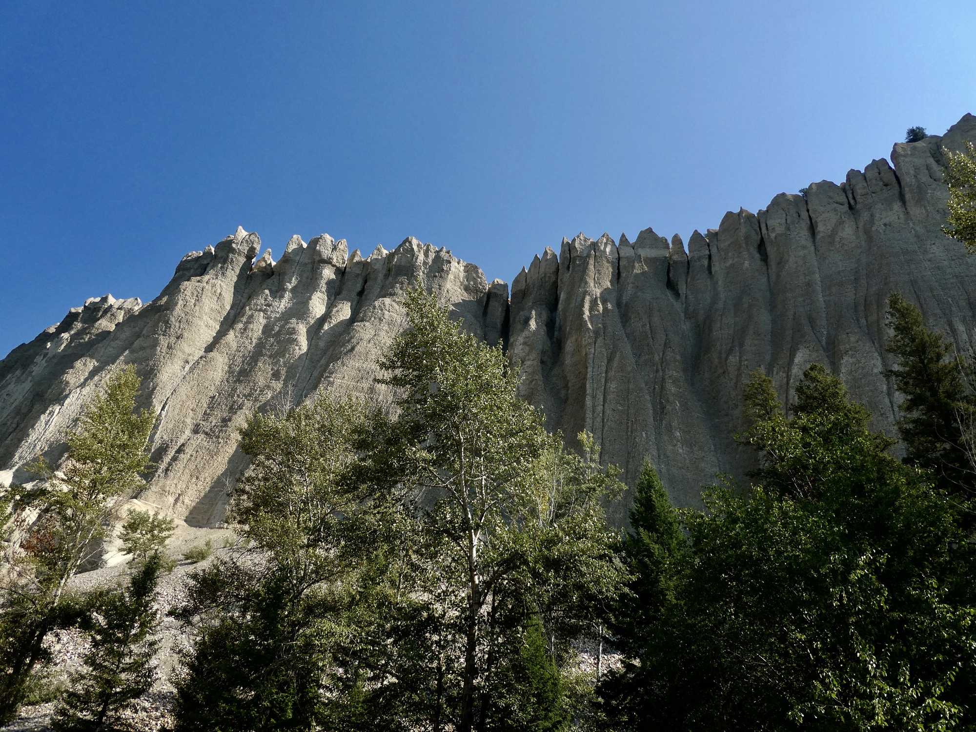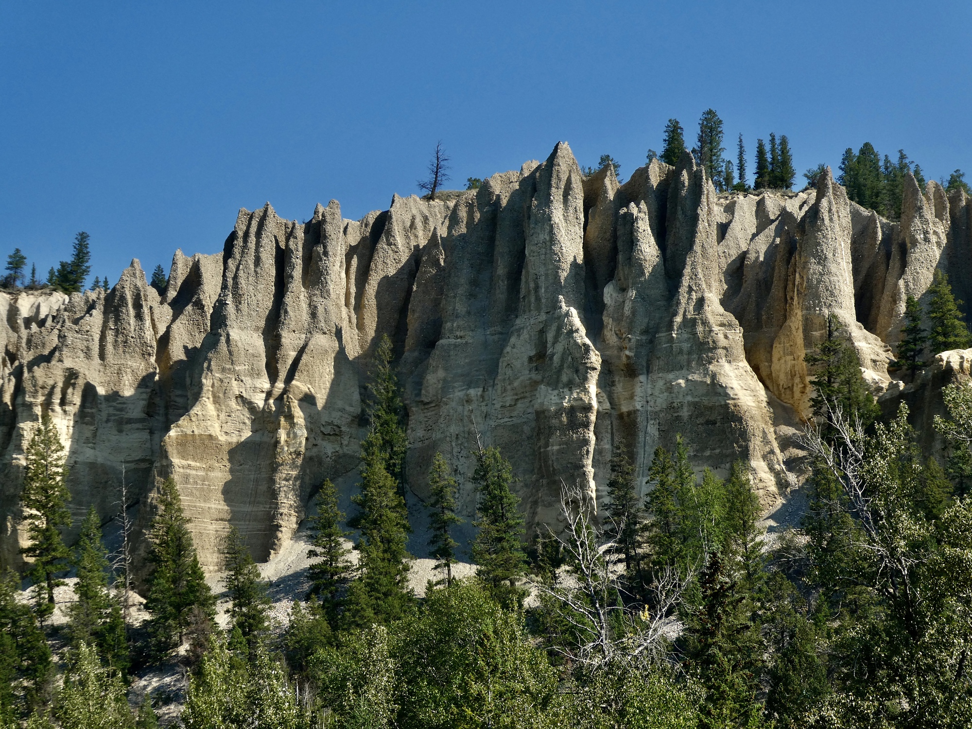 The trail ends at Highway 95. Not long before we arrived I zoomed in on the Garmin and was surprised to see that we’d hit the highway just west of Dutch Creek. Dutch Creek! That’s the spectacular spot with the hoodoo cliffs we drove past on our drive up from Cranbrook. I’ve been regretting failing to stop for a better look at the time, but now we’re unexpectedly getting a do-over opportunity. Of course we accept the option.