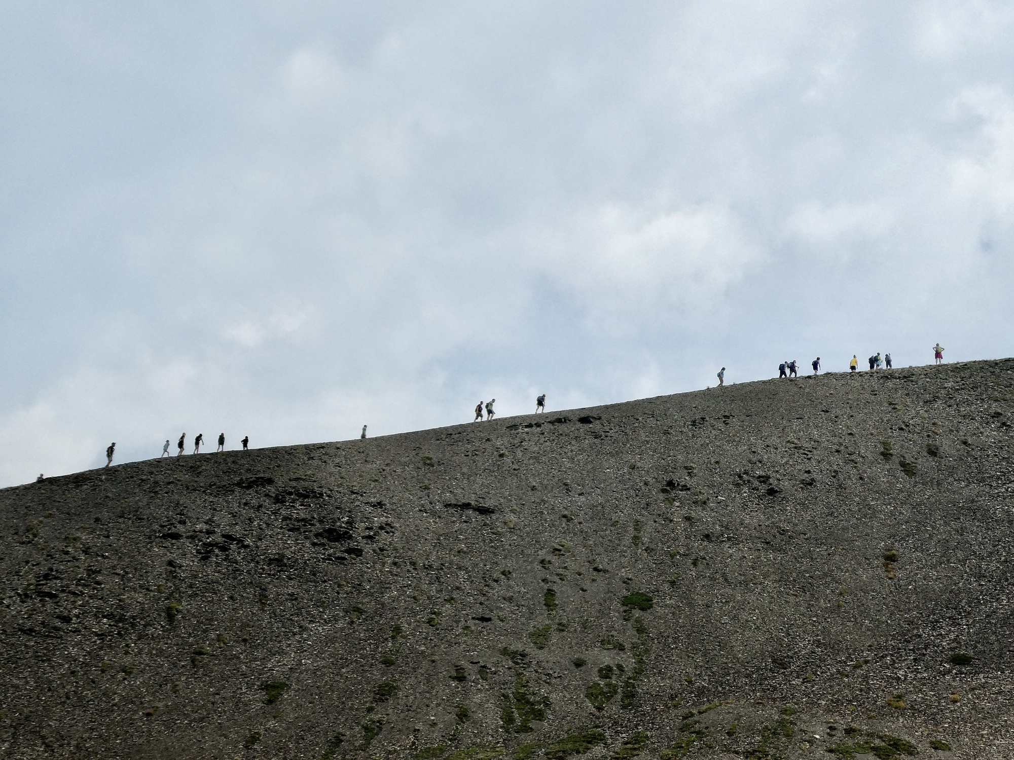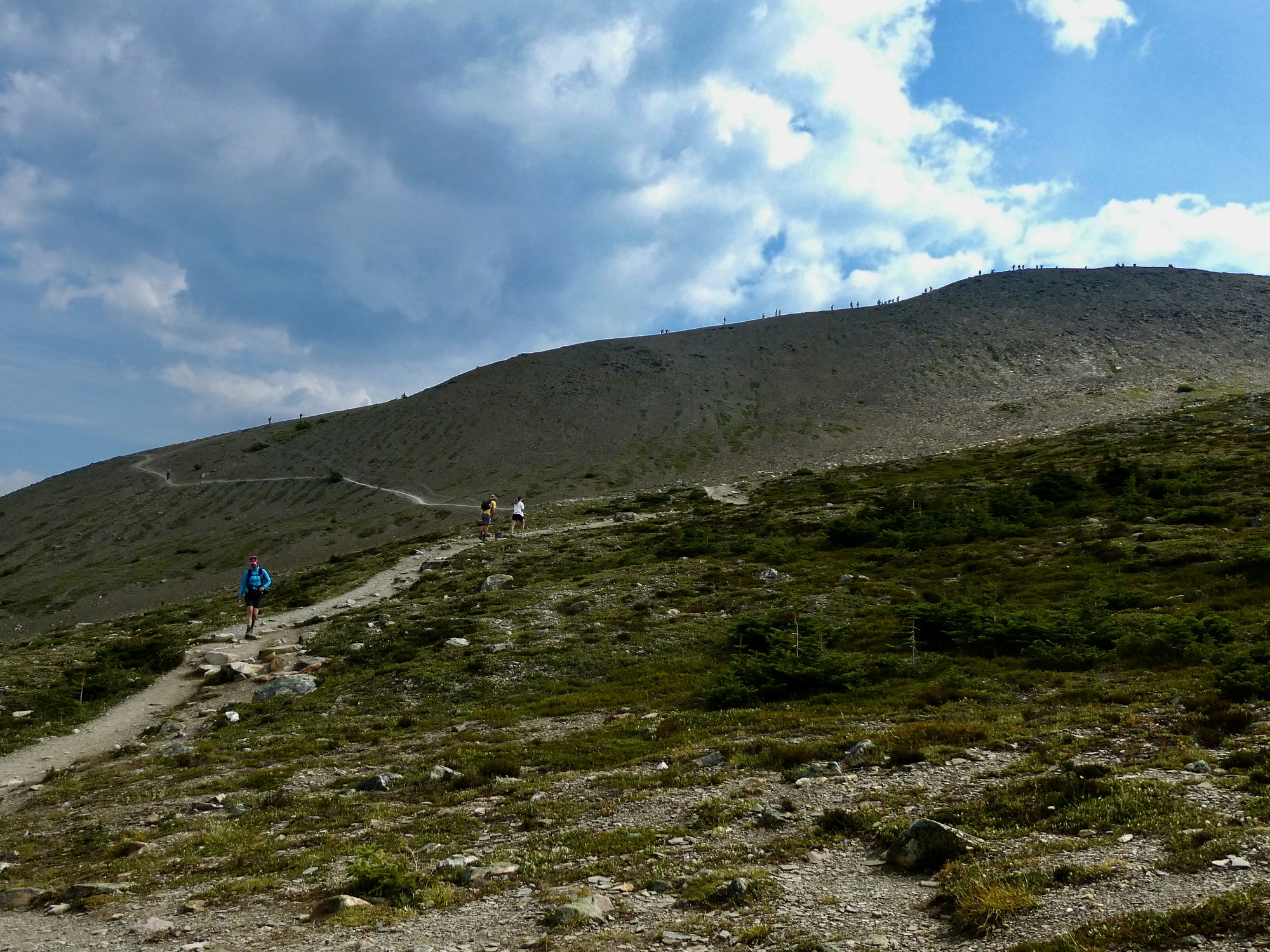 We turn back at 7,100’ at a junction in the trail, but with more interest and drive we could have continued climbing for perhaps another half mile to a local summit. Looking up at the stream of hikers slowly trudging upward, neither of us feels tempted. The views are fabulous enough right where we were.