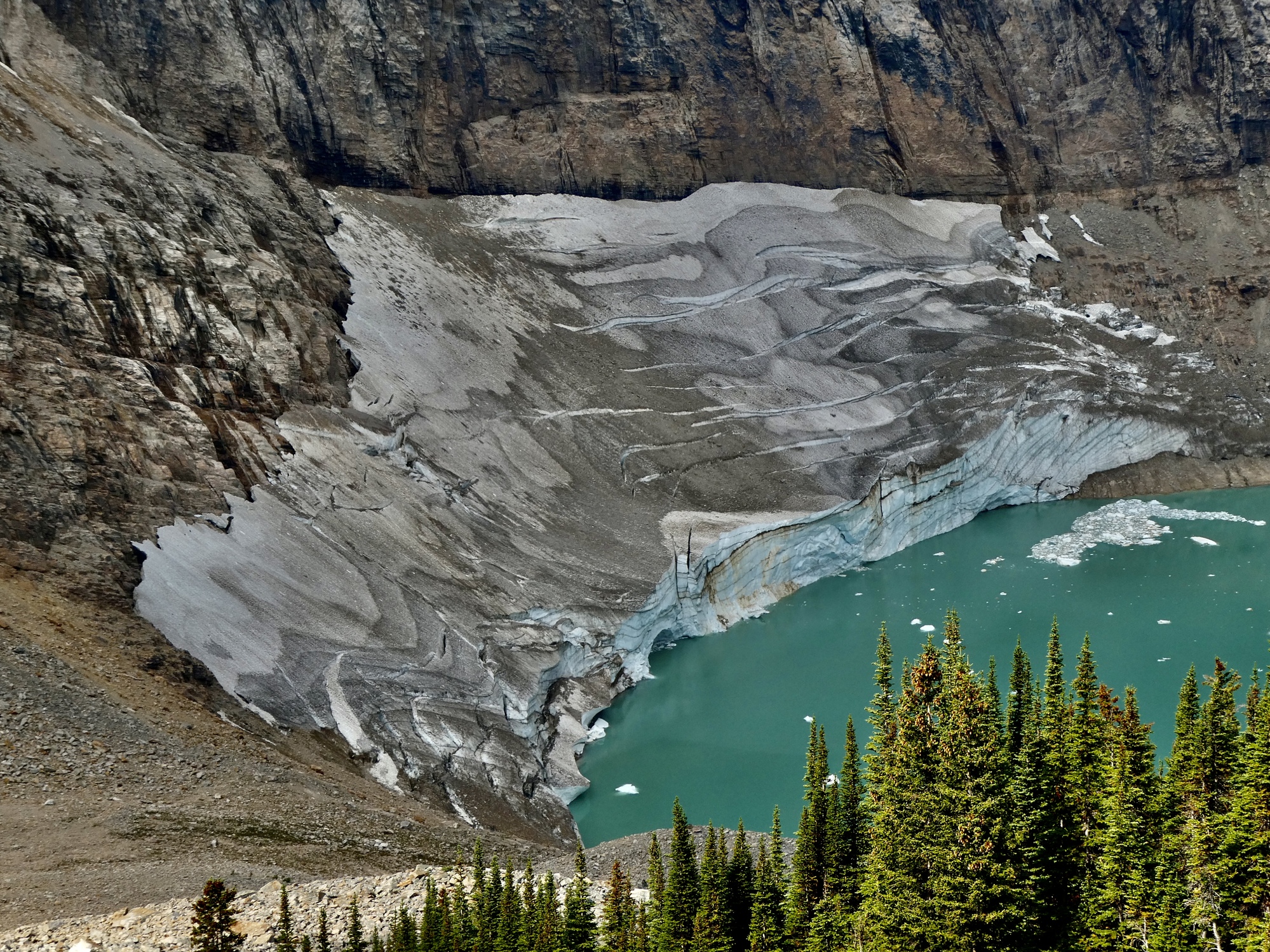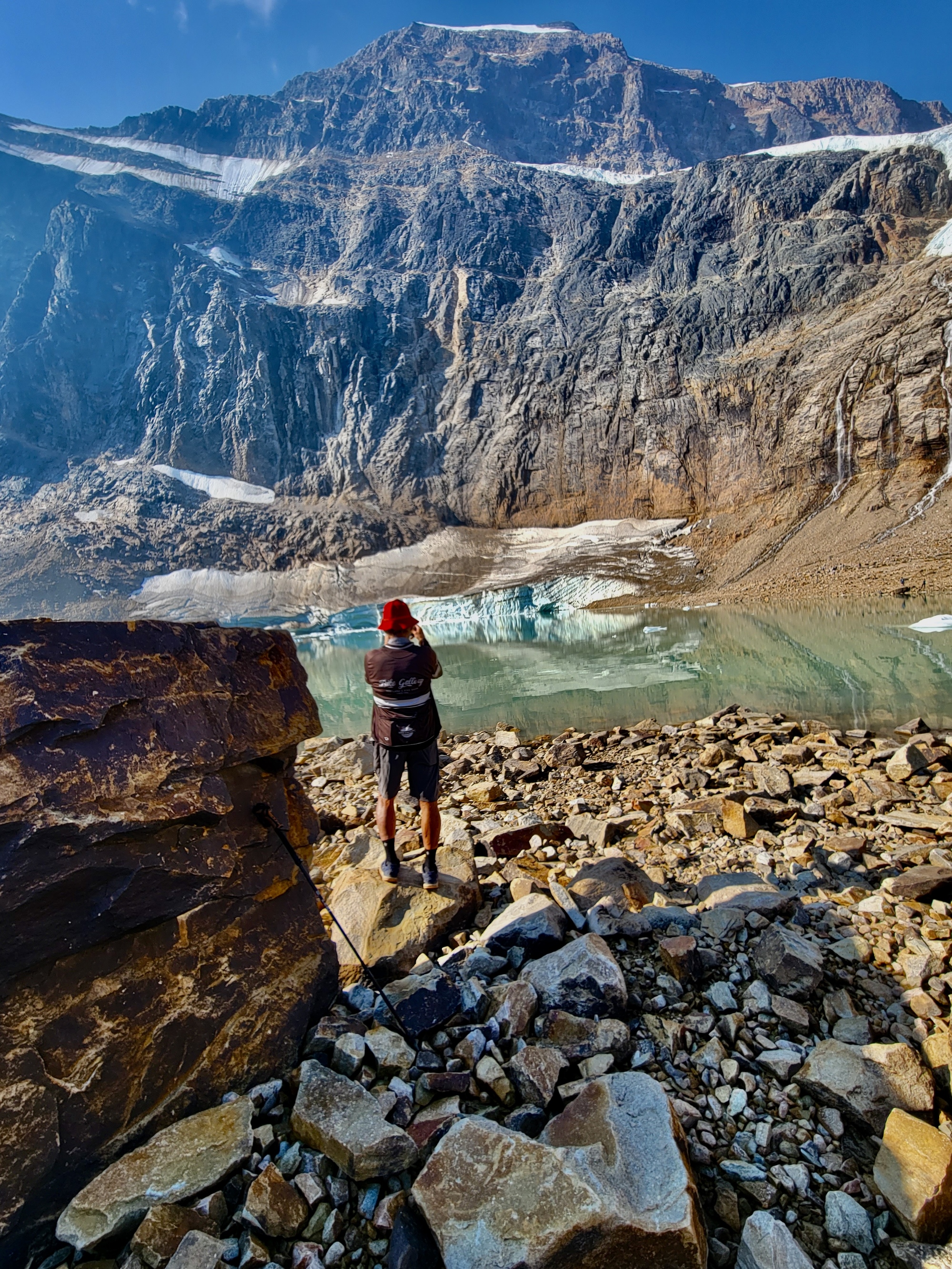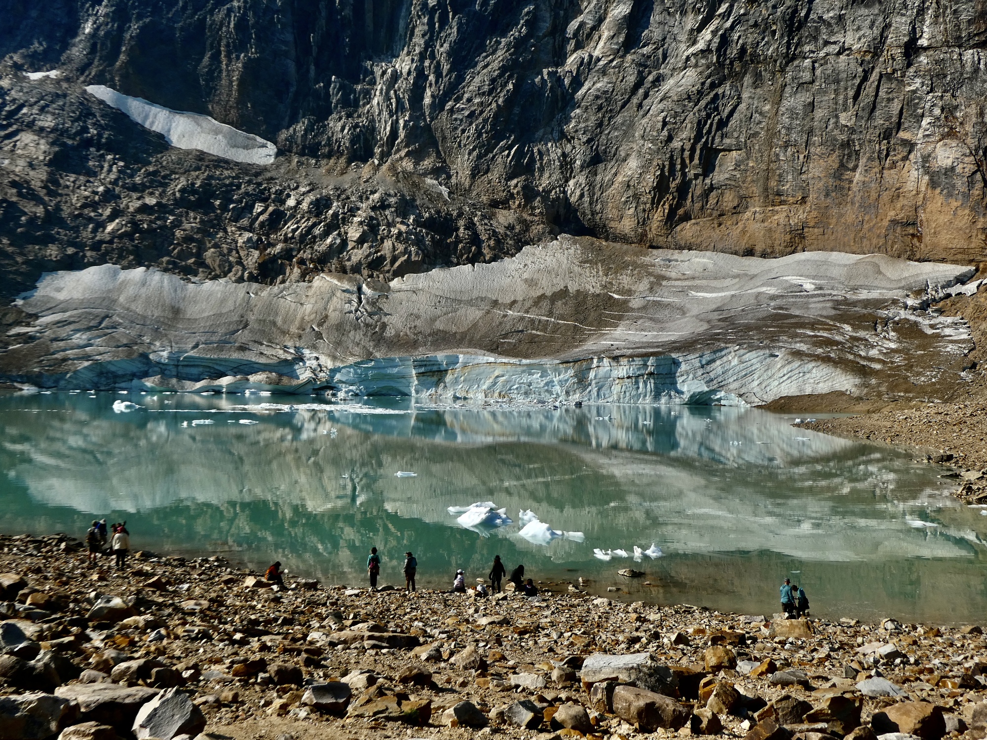 It’s only about twenty miles to the parking lot and trailhead, but it’s a forty minute drive. Nearly all of the drive time gets consumed in the last eight miles after you leave 93A and drive the rest of the way up Mount Edith Cavell Road, a steep, narrow, winding two lane affair. It’s no place for a bicycle really, and as I’m driving I’m thinking back on the first time I was here 35 years ago, biking up with my ex-spouse. It was an over-the top challenging day, that began in Jasper and I think ended up with us wild-camping somewhere further south on the Parkway. When we got to the turnoff for Edith Cavell we ditched our panniers in the woods, biked up this steep and scary road, took the short hike in to Cavell Pond and back, and coasted back down. A very tough day, and when I think back on it now I’m in awe of my younger self (and of my partner at the time of course) and the fact that I had the enthusiasm and drive to take that much effort and go that far out of the way to see a feature I just read about in the guide book. I wouldn’t even be tempted, these days.