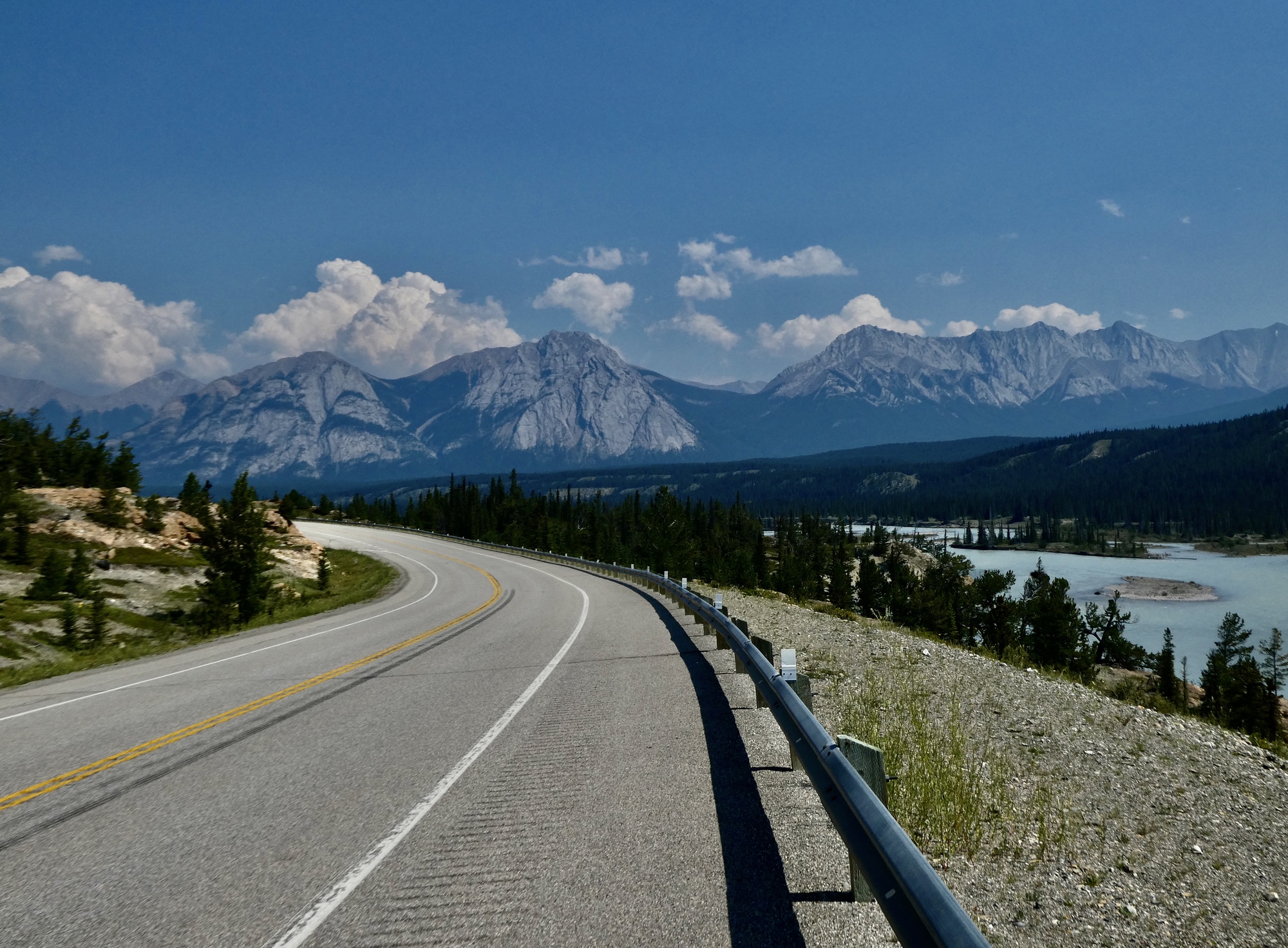 The other one is a ride east along the North Saskatchewan River on Highway 11, the David Thompson Highway. We’ve never ridden this road, but just from zooming in on the map view it looks tempting. So I asked my local domain experts Lyle and Kirsten for their thoughts. Lyle reported back that they’d never ridden it themselves, but they had driven it in the car and he thought it would make a fine ride: scenic, good shoulder, and quieter than the Parkway.