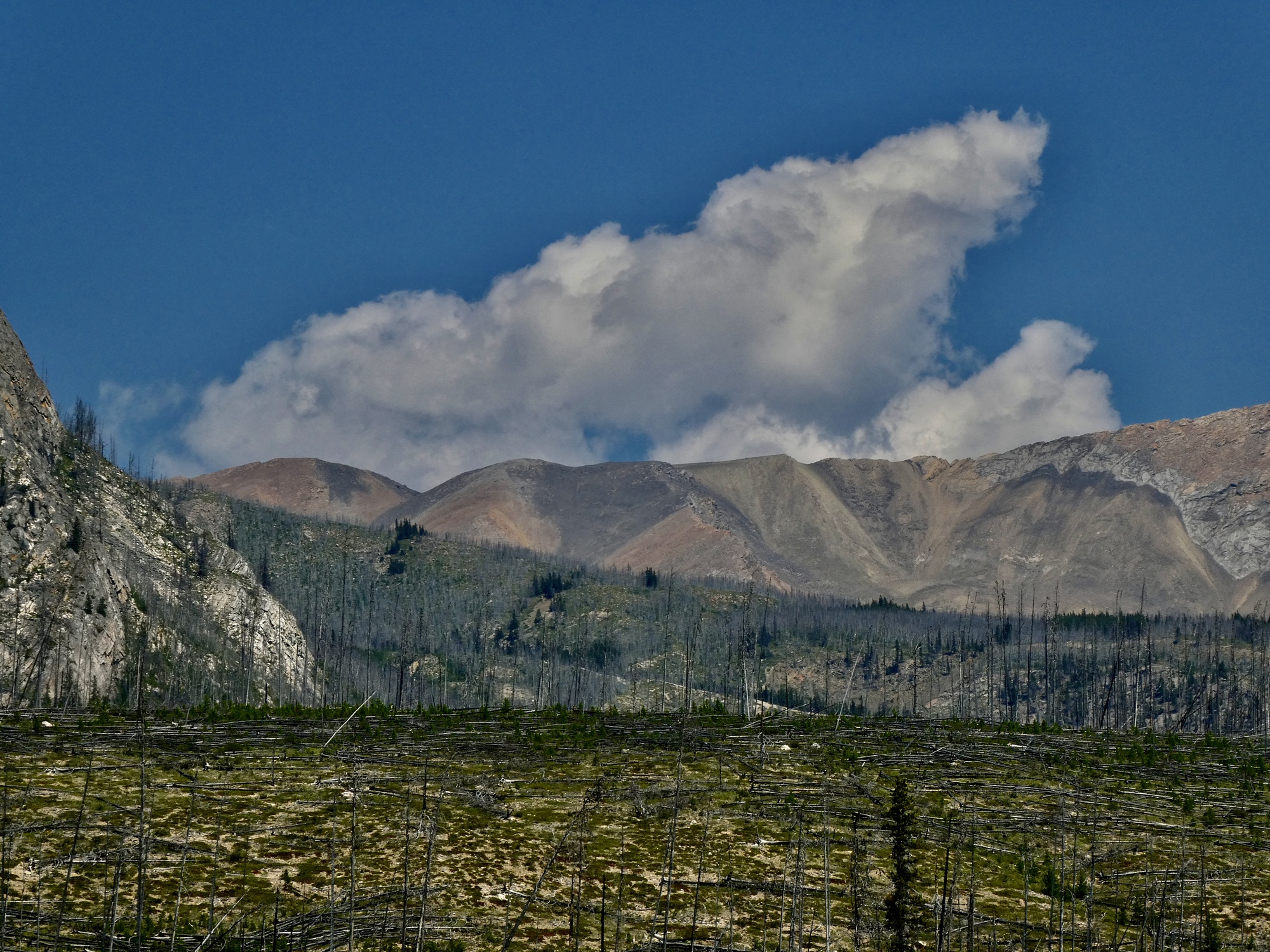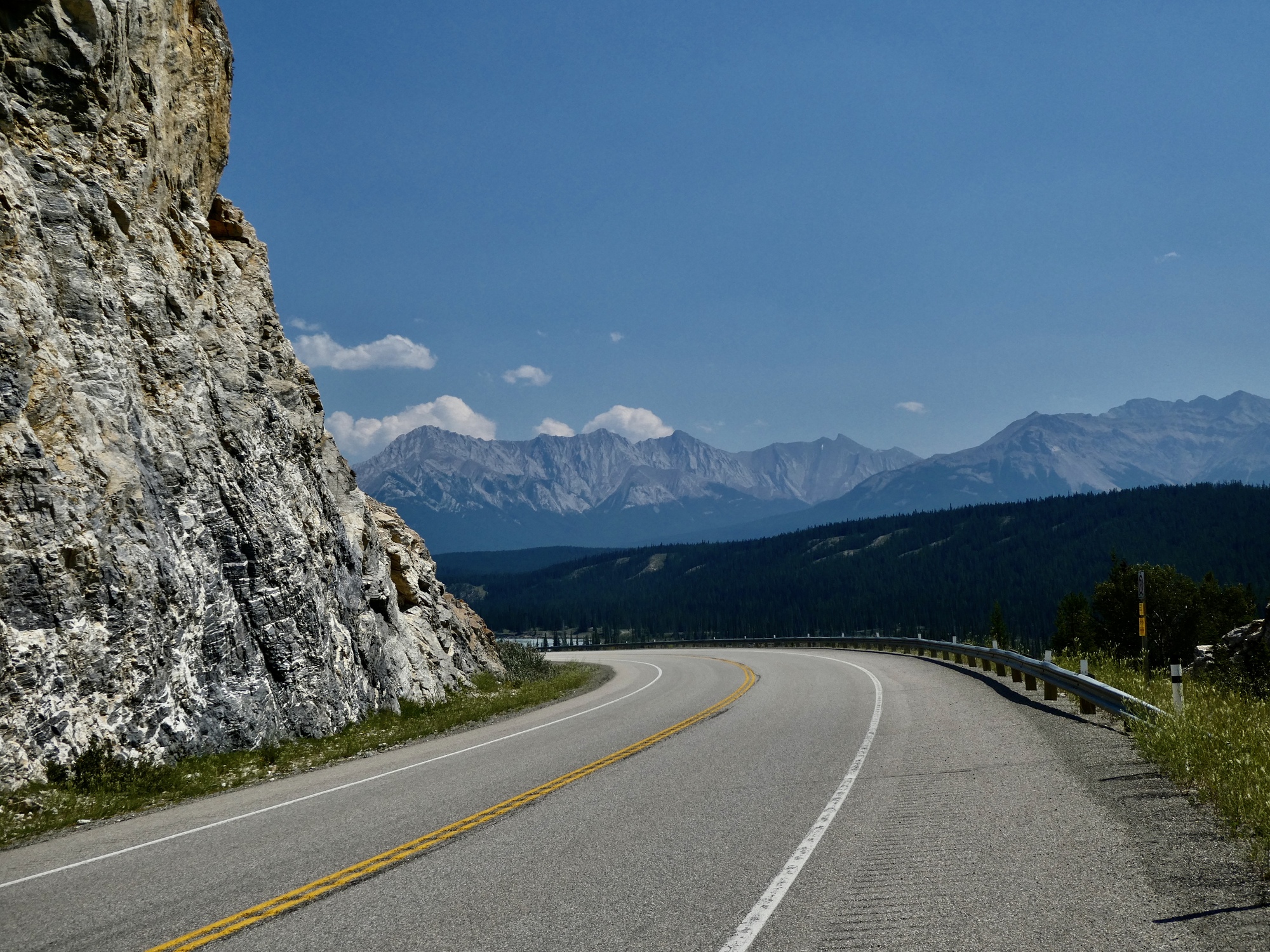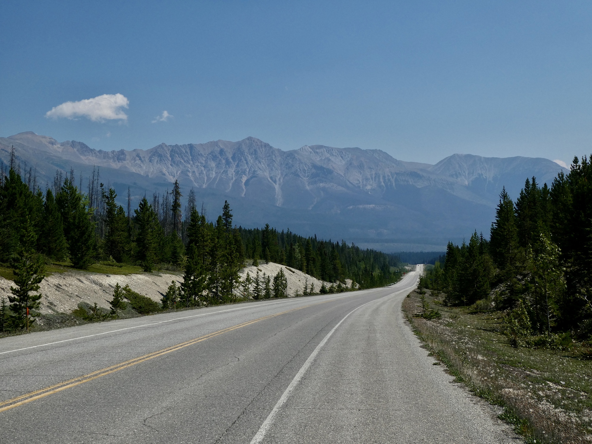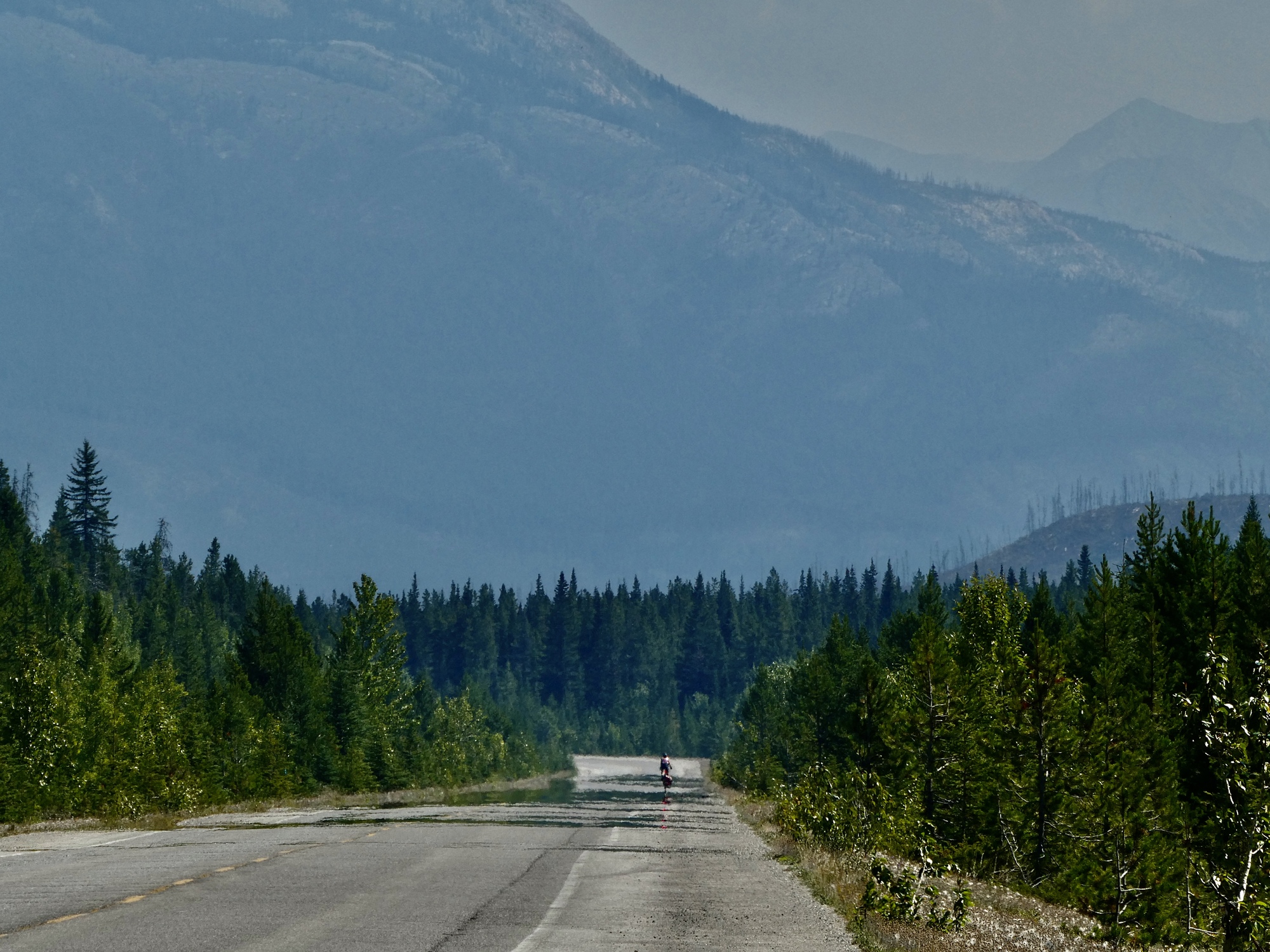That crisis resolved when I arrived with the cash, we’re soon on the road again headed south. Back on the parkway, it’s hazy or smoky the rest of the way to Canmore so we aren’t tempted to stop for photos until we’re forced to by an interminably long train when we enter Canmore itself. Finally though it passes, and soon we’re knocking on Levi’s door for a furry head to pet and offering the exposed toes in our sandals suitable for licking as a fair trade.