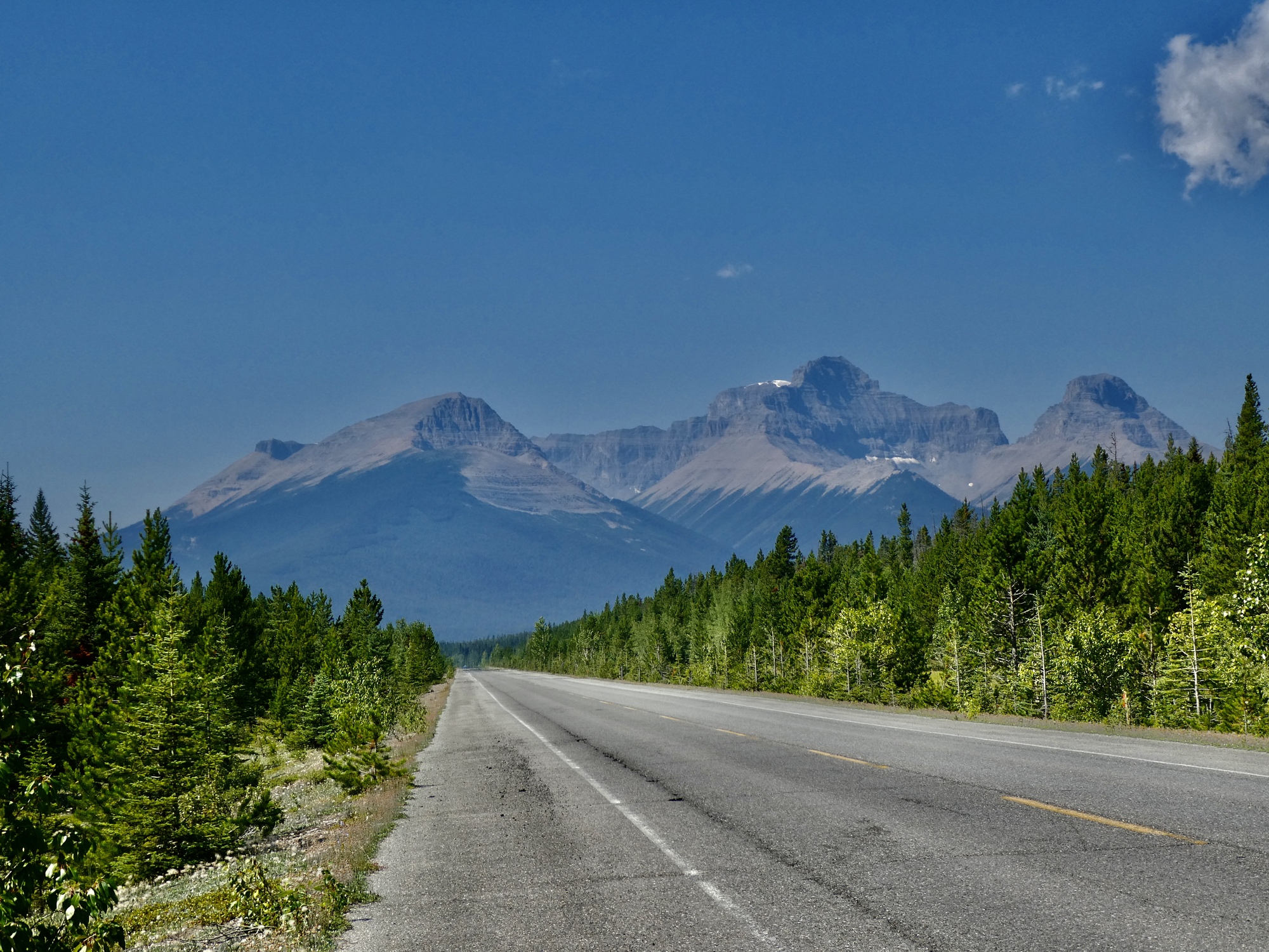 On the drive south, between watching out for vista points and wildlife sightings I have my mind on which ride to take to break up the drive today. We have two mapped out and loaded to the Garmins, both starting at Saskatchewan River Crossing. One backtracks up the Icefields Parkway to the base of the Big Loop, the long, gradual climb up Parker Ridge. We biked this route (and then some) five years ago, and for a change I thought ahead of time to reread our post of that day and was tempted to repeat the ride because we enjoyed it so greatly the first time.