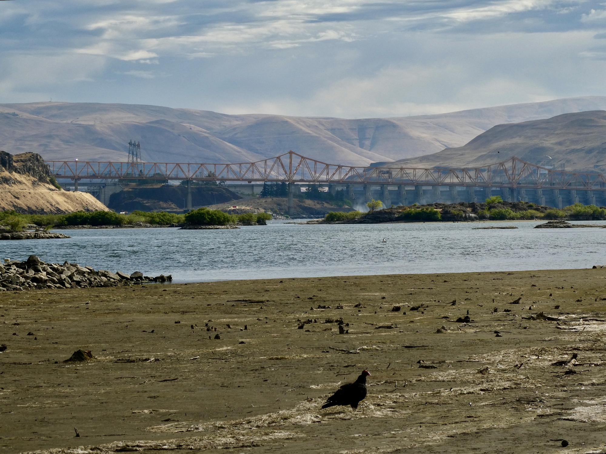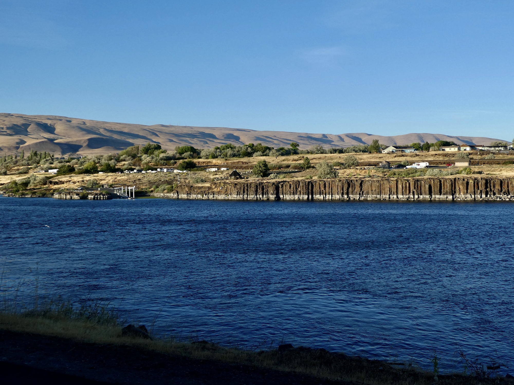 Even with those two breaks it’s still only about two when we arrive in The Dalles after picking up an hour when we cross the time zone for the sixth time. Too early to check in to our room, so we head down to the waterfront for lunch as our main meal of the day, enjoying the view of the bridge and dam and being amazed at the number of pelicans gathered out in the middle of the river.