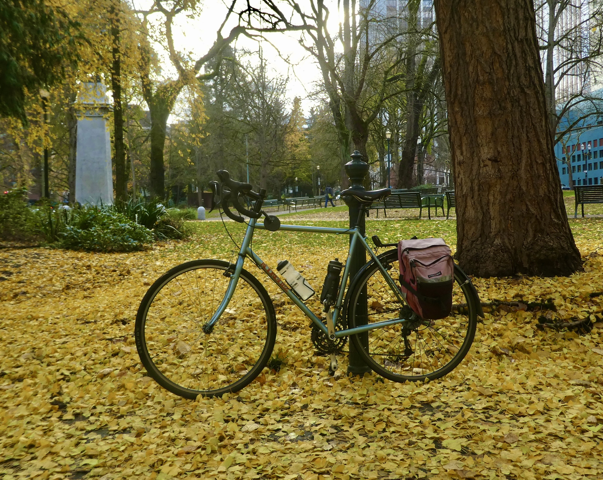 And, it’s the first time I’ve been on the Rodriguez for over nine months. That’s long enough that I’ve almost forgotten how to ride him. That 700cc front wheel looks huge after staring at the 20” wheels of the Bike Friday for most of the year, and the handling feels strange for the first few miles. And the bike’s taller! After leaving our apartment I stopped by Elizabeth’s to pick up her key to the Raven before leaving town so we’ll have a backup in case we lose one. After our brief chat on the sidewalk I started to get back on the bike and promptly fell down on my back when my leg didn’t clear the cross-bar. So that was embarrassing. If I’d been quicker-witted I’d have handed the camera to Elizabeth to take a photo.