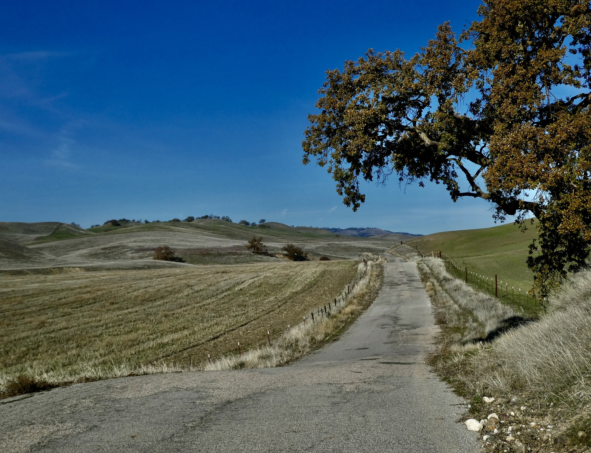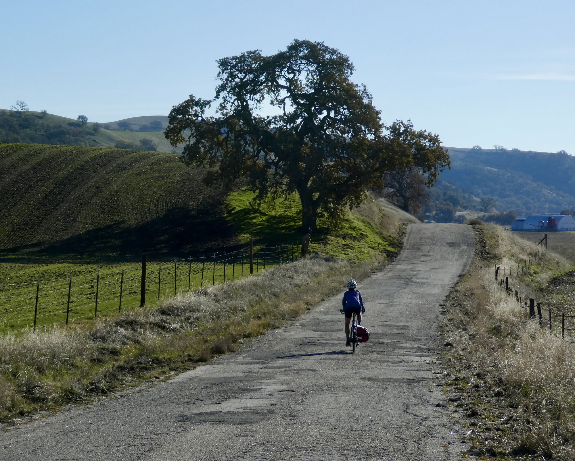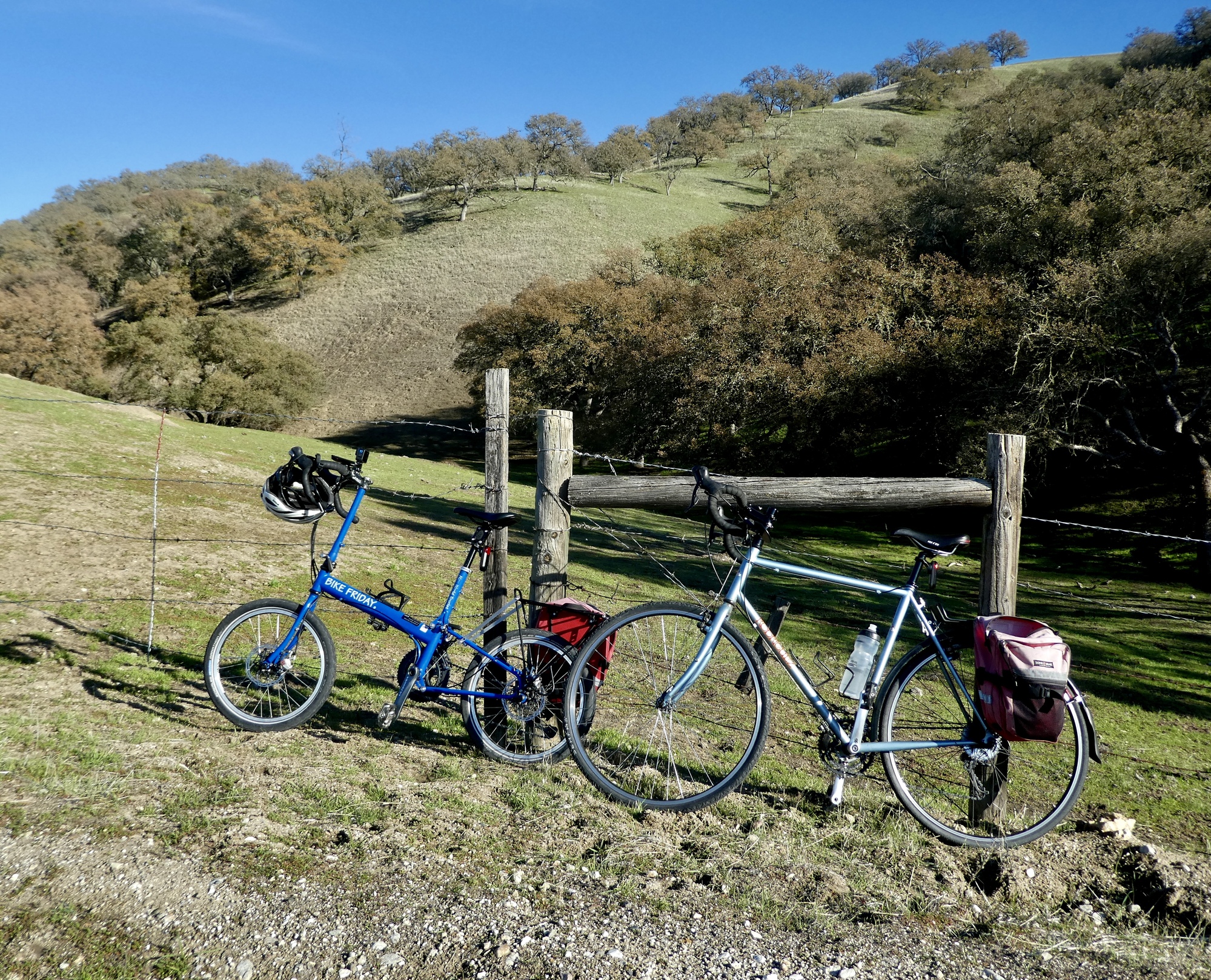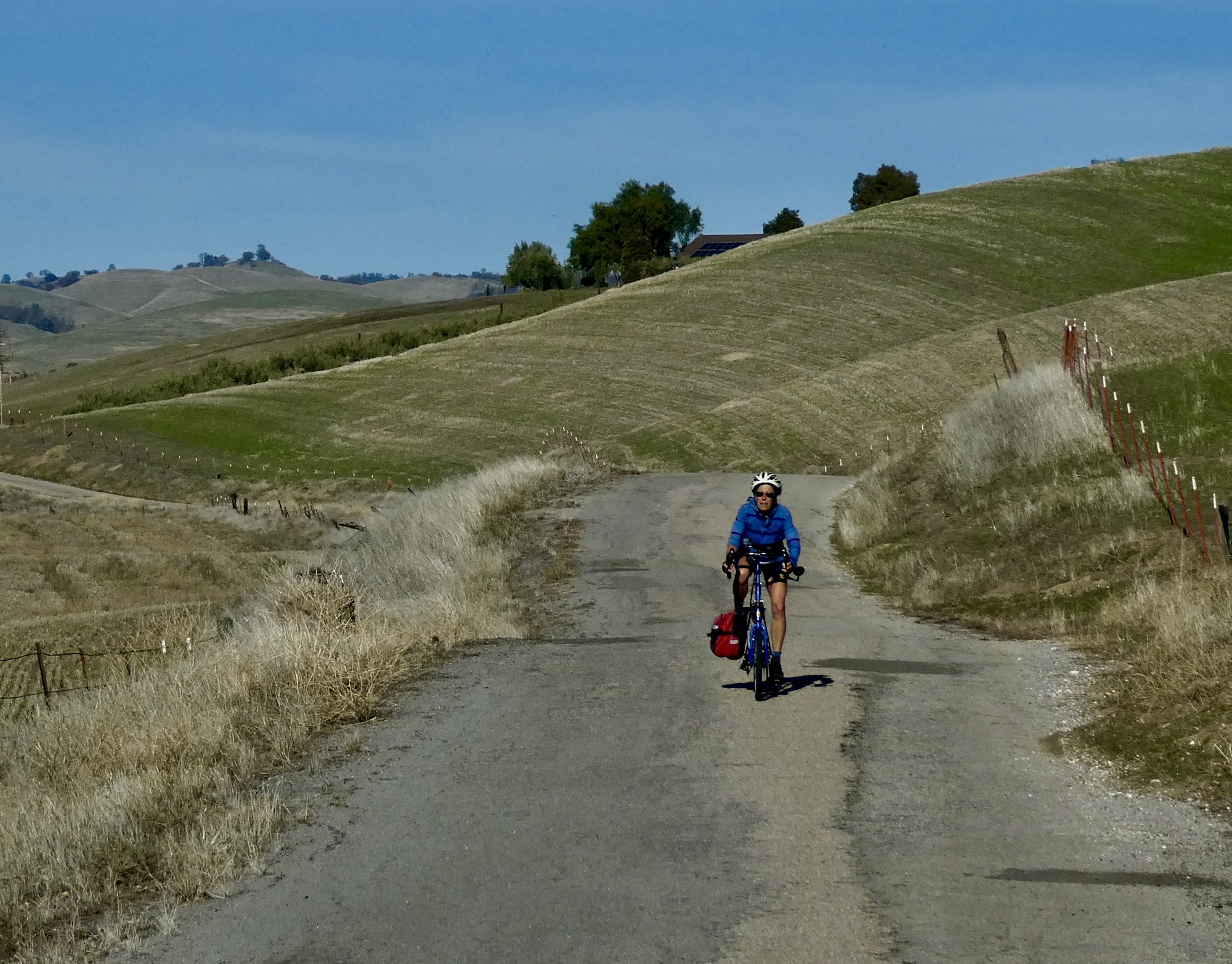 We rode up Hog Canyon last December on our drive south, and were stunned by its ethereal beauty. The conditions were perfect that day for seeing it at its best, with a partially overcast sky setting off the shimmering hills and fields to their best effect. It was an excellent ride today also, but with a cloudless sky the colors were all just a bit washed out. Even with that though it was definitely the best of the rides from our stay here. Also, it was easily the best birding day of the set. In addition to the two shown here there were meadowlarks, hawks, ravens, quail, western bluebirds, a brilliant blue mountain bluebird, and a mockingbird being harassed off the scene by a pursuing blackbird.