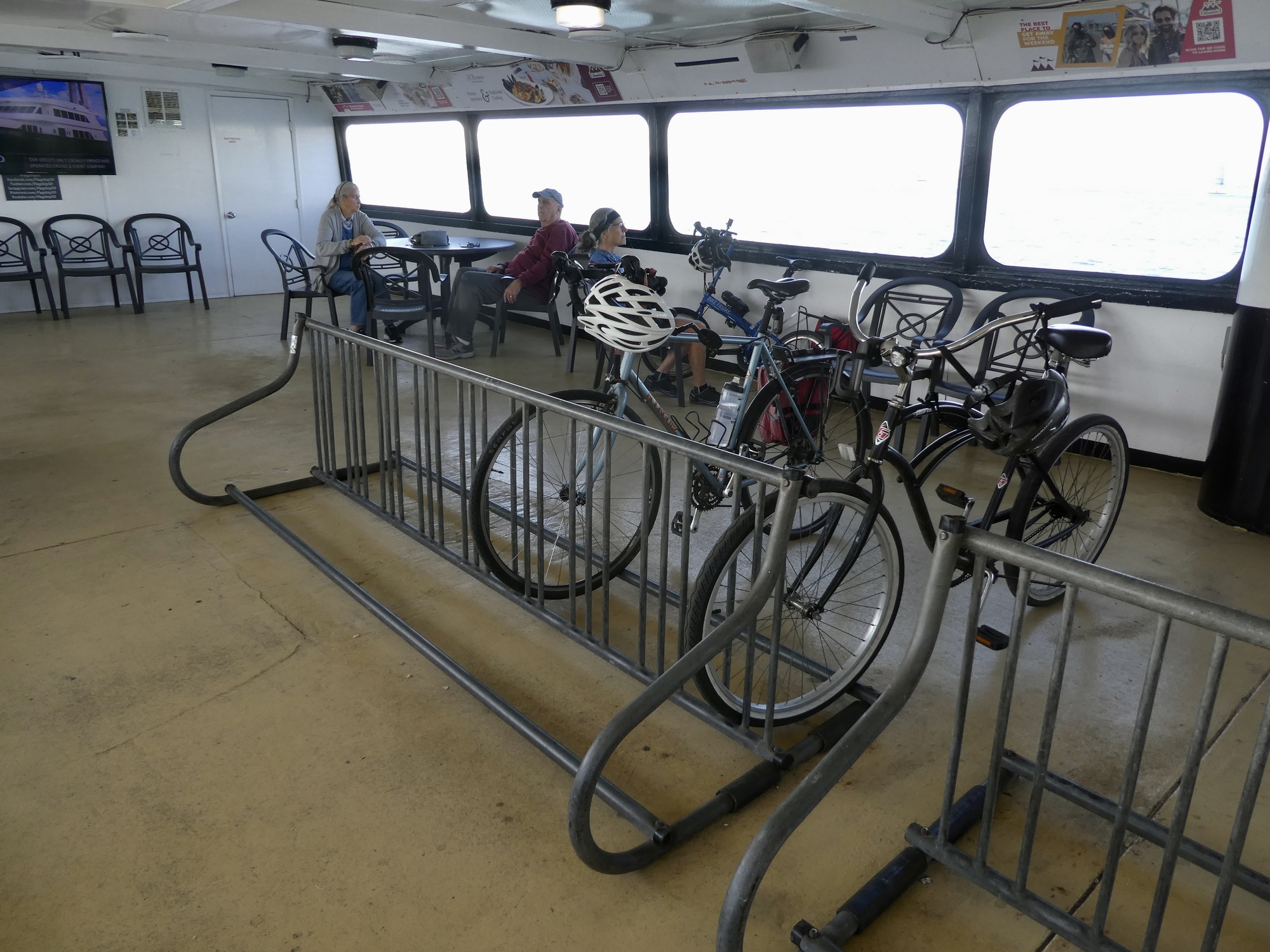 There are two ferries from Coronado back to San Diego. Their schedules aren’t really coordinated, so it’s hard to plan for how much time you might spend sitting waiting for the next departure. We decide the prudent thing is bike steadily to Coronado and eat lunch there while we wait. One’s just about to depart when we bike up though so we immediately buy our tickets ($7 each, one way), wheel the bikes on and eat lunch on the short voyage.