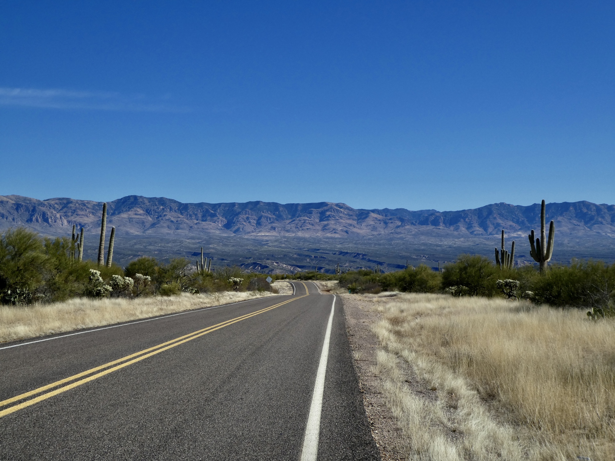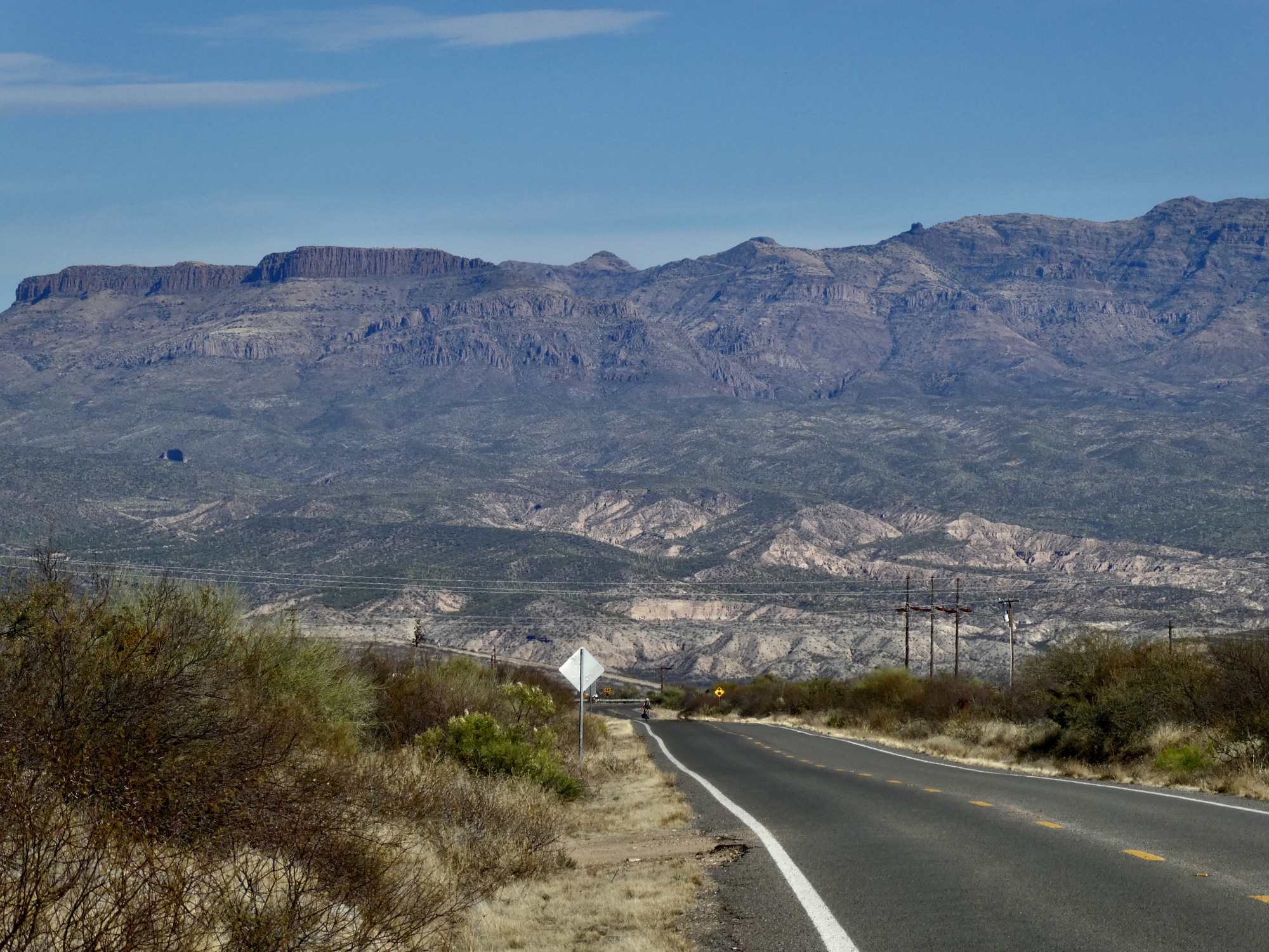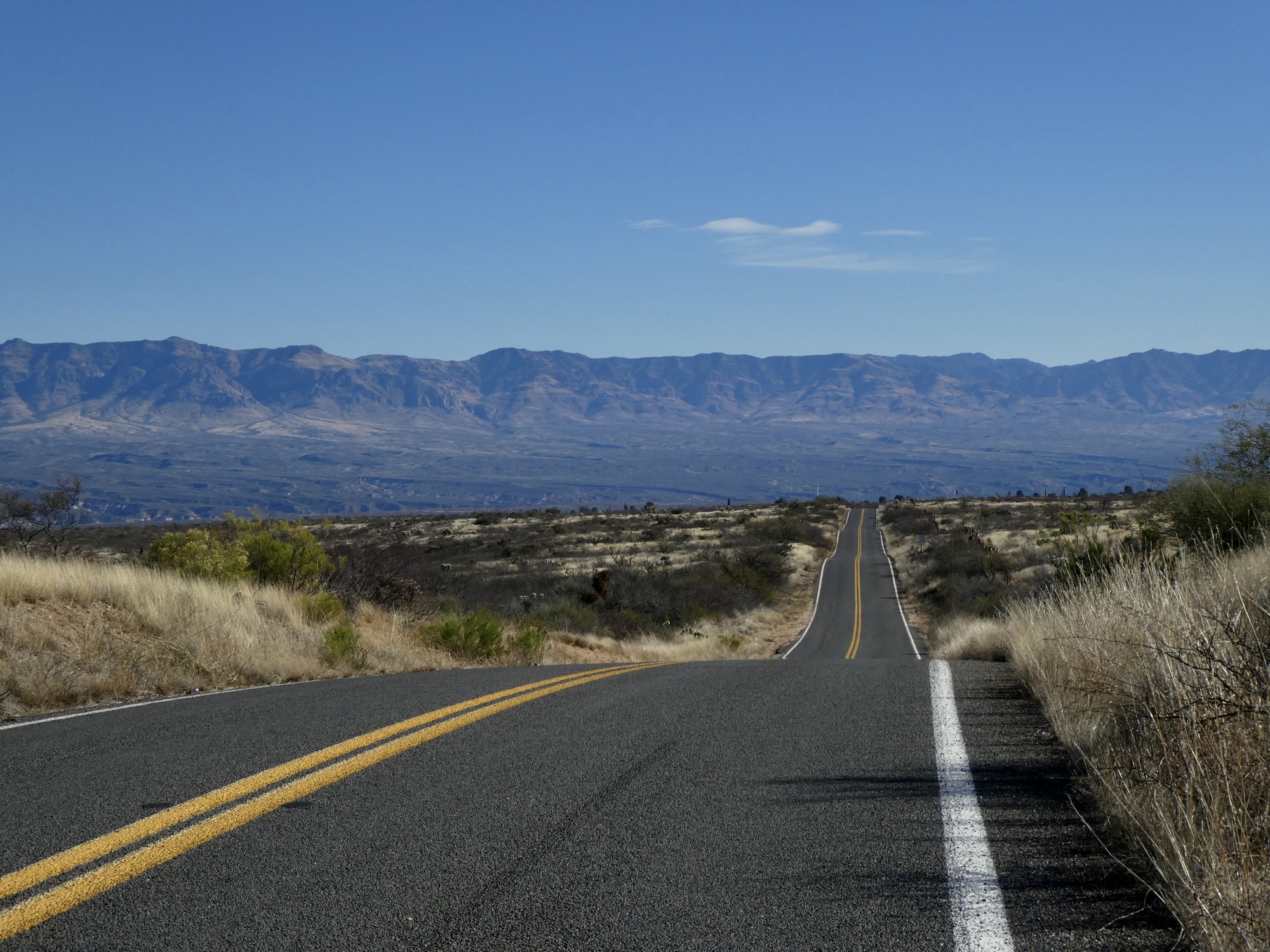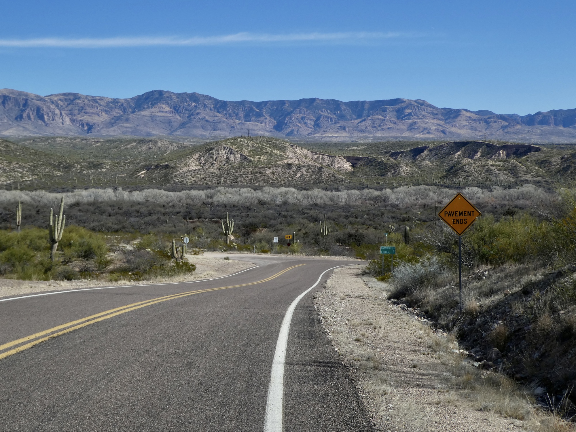 If you get bored staring down the long, empty road and the distant Mae West Peaks, you can look to either side. The view to the left across the San Pedro to the Galiuro Mountains certainly isn’t hard on the eyes.