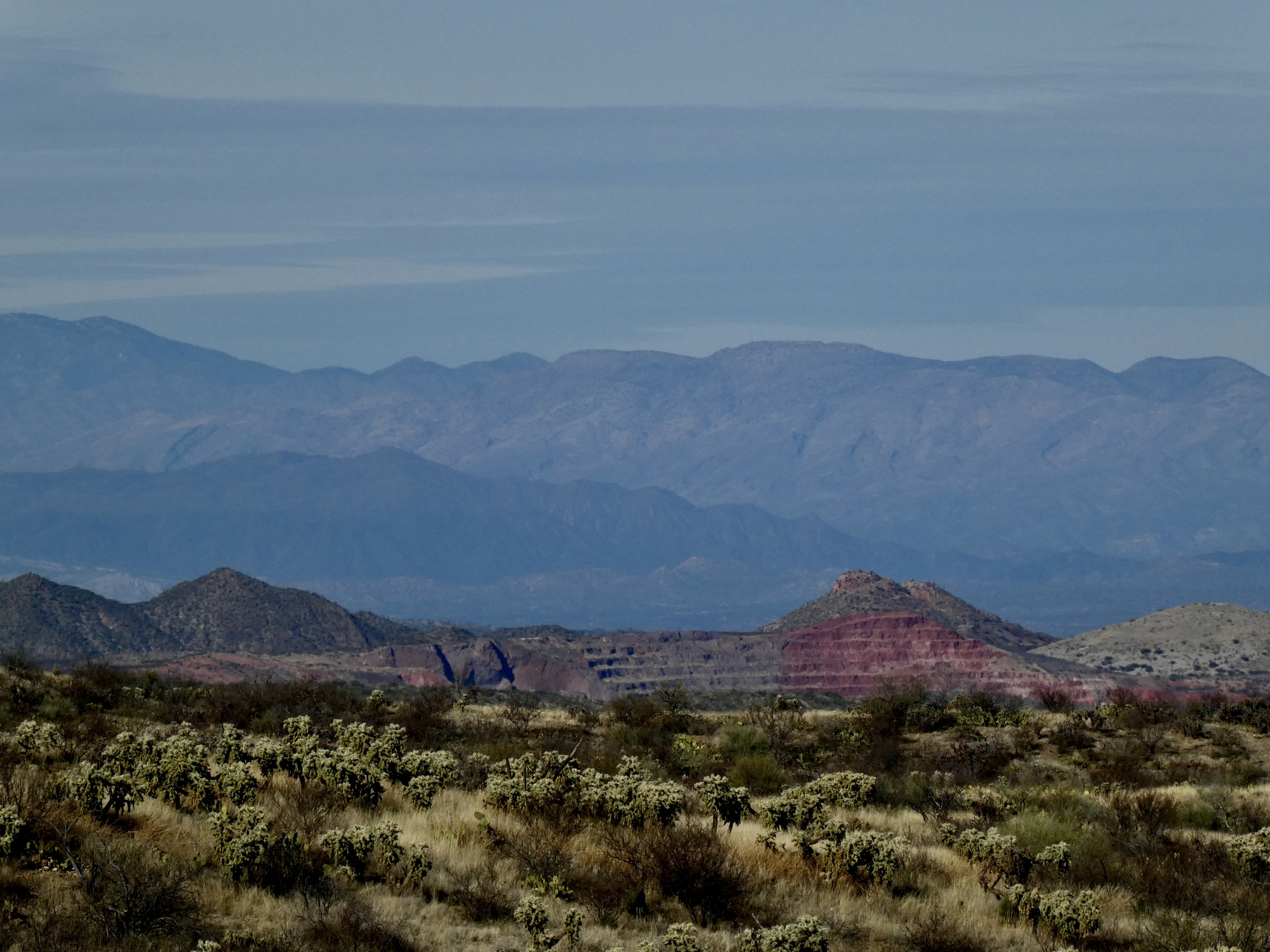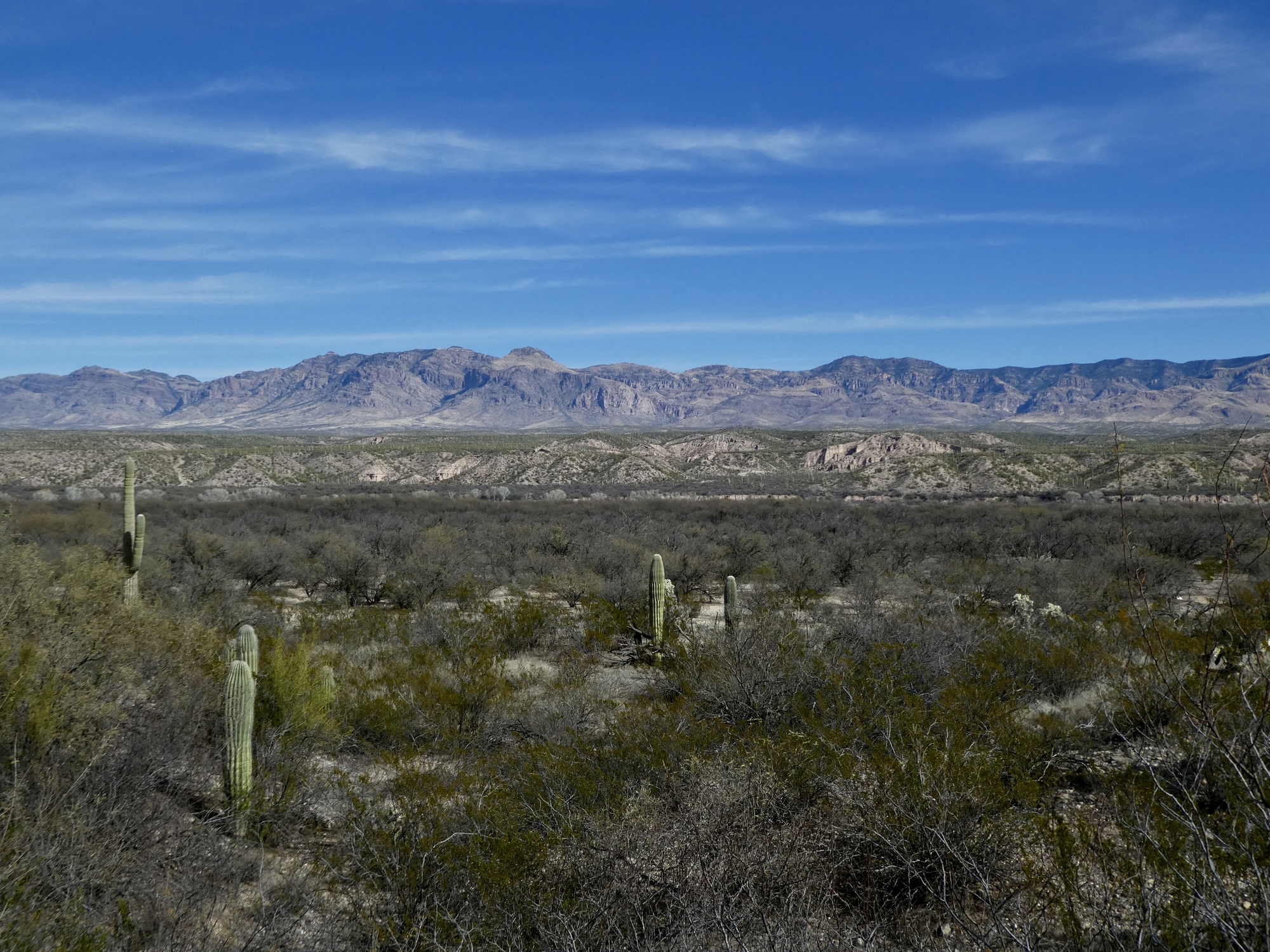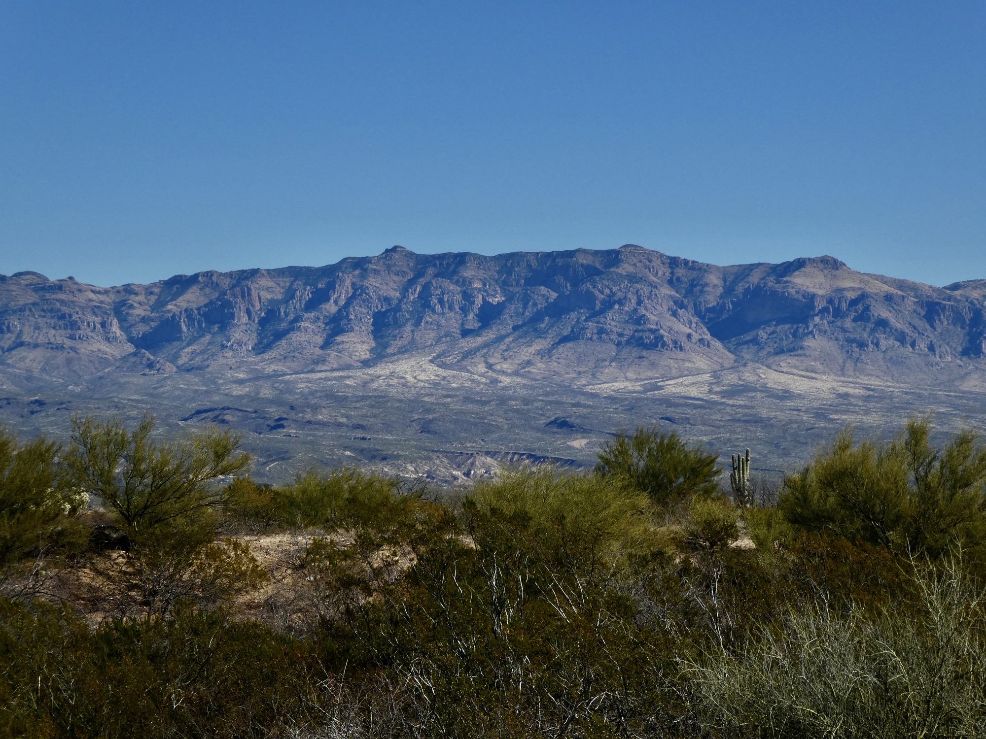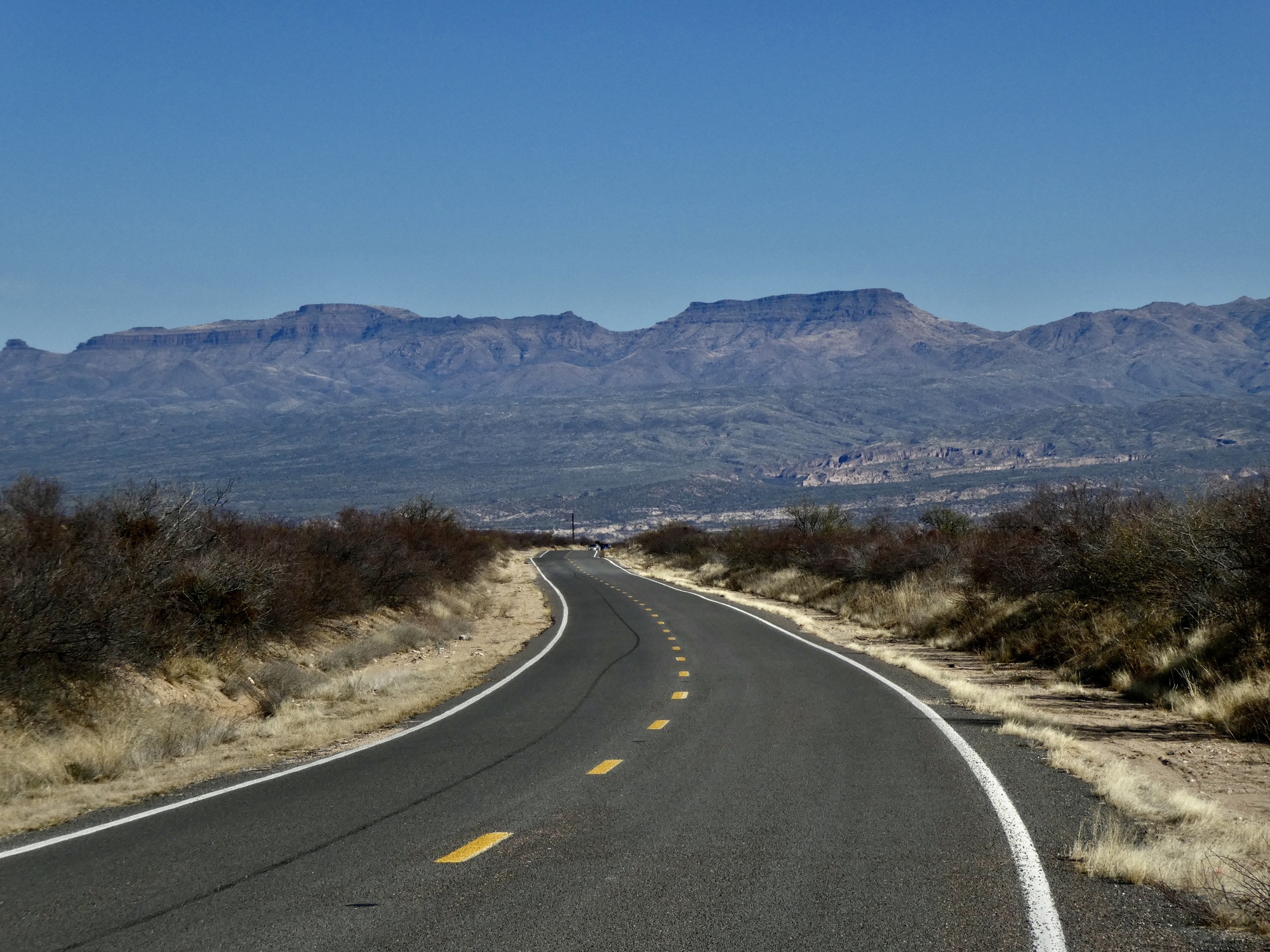 If you get bored staring down the long, empty road and the distant Mae West Peaks, you can look to either side. The view to the left across the San Pedro to the Galiuro Mountains certainly isn’t hard on the eyes.