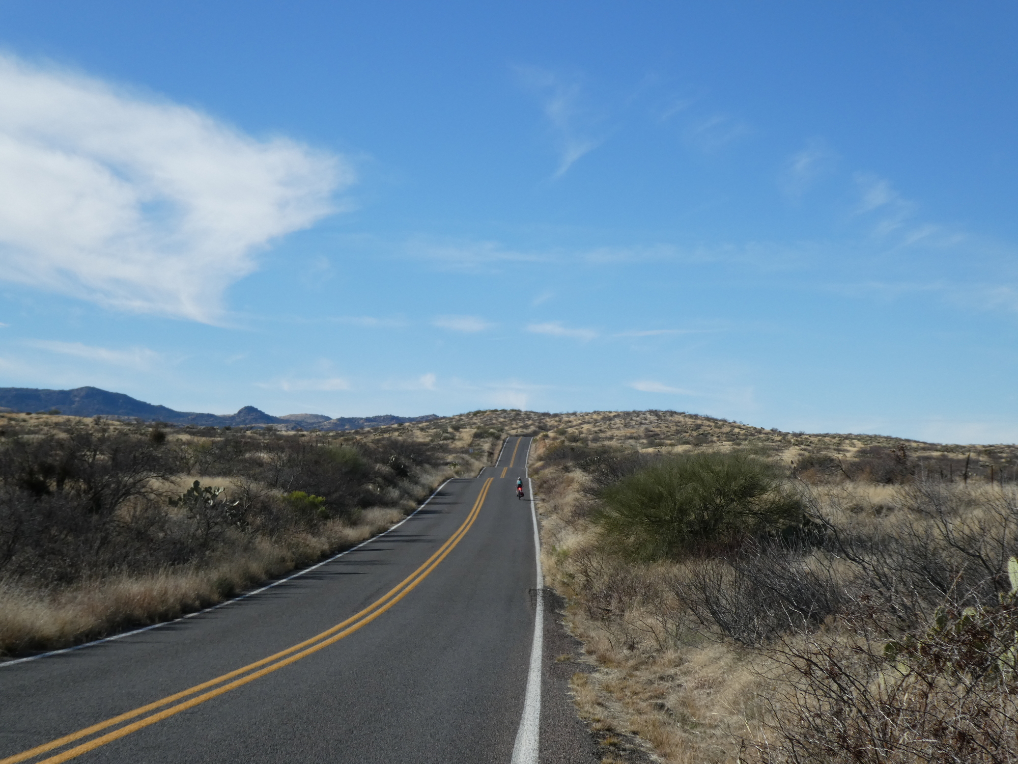 The view east to the Galiuro Mountains along Reddington Road. I’d been looking forward to this stretch, envisioning a shaded riparian ride alongside the river; but the road never drops all the way down. Soon I’ll meet up with Rachael, returning from her ride to the end of the pavement.