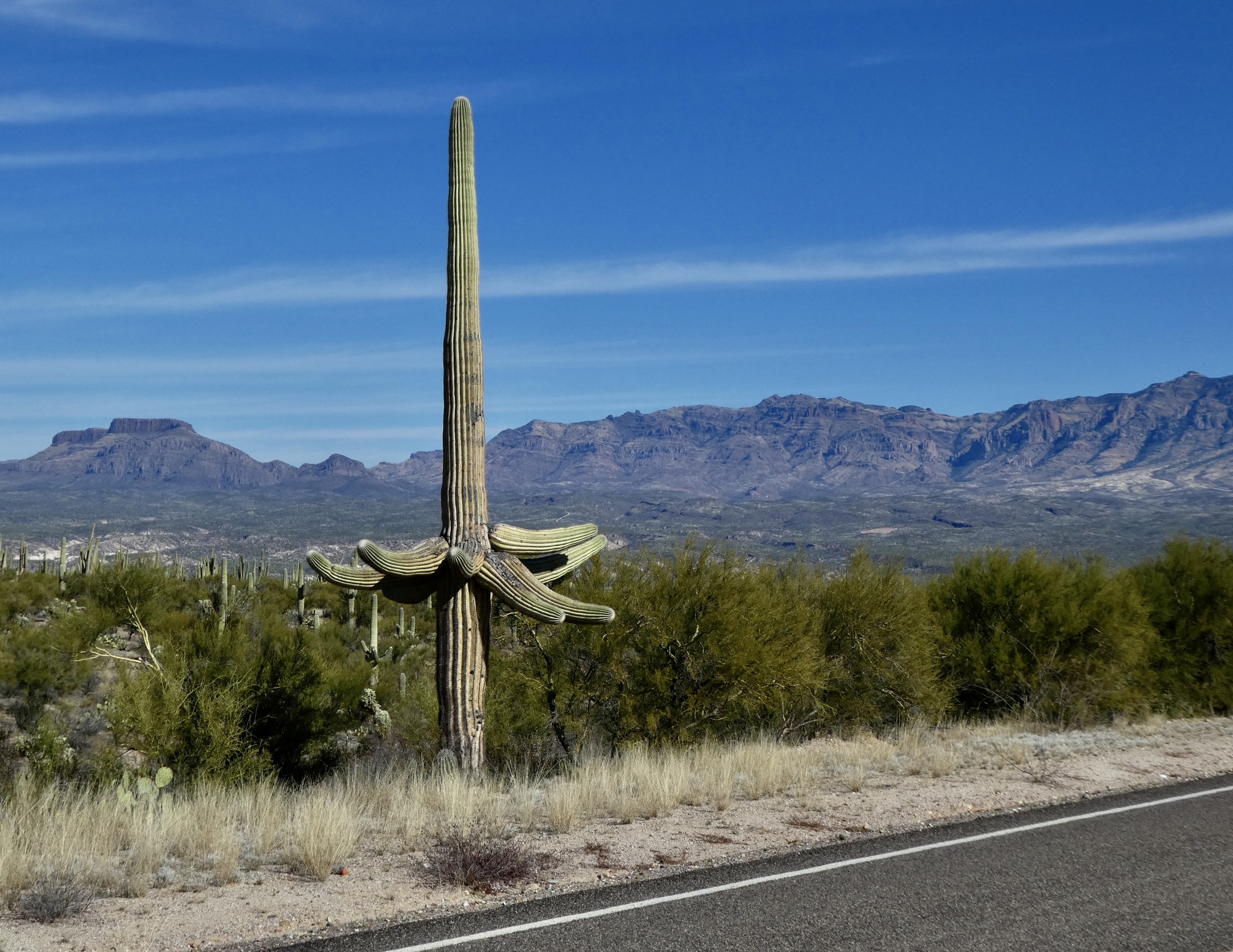 Climbing back up through the saguaros back to Veterans Way Boulevard. Not a bad climb really - four hundred feet in four miles, with a maximum grade of 8% - so I’m surprised to find it harder than it should be. I’ll realize why when we stop for lunch and I check my rear tire: 20 psi.