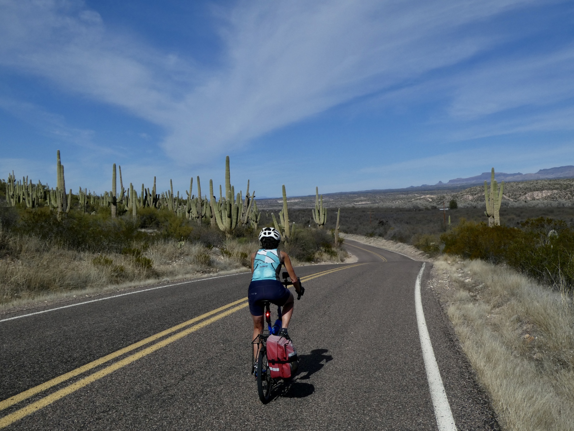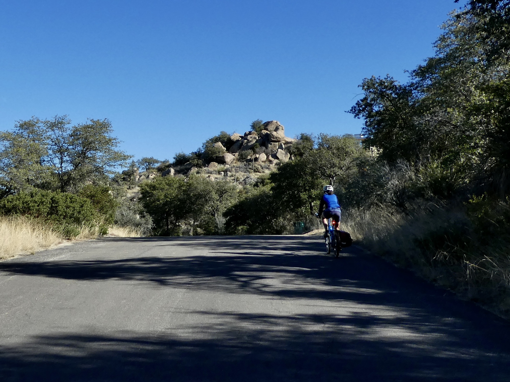 Back on Webb Road, at the start of its eight mile climb. I’ve gotten ahead of Rachael when she stopped briefly to commune with the cacti, so I’m stopped here to wait until I can see she’s coming before rounding the bend.