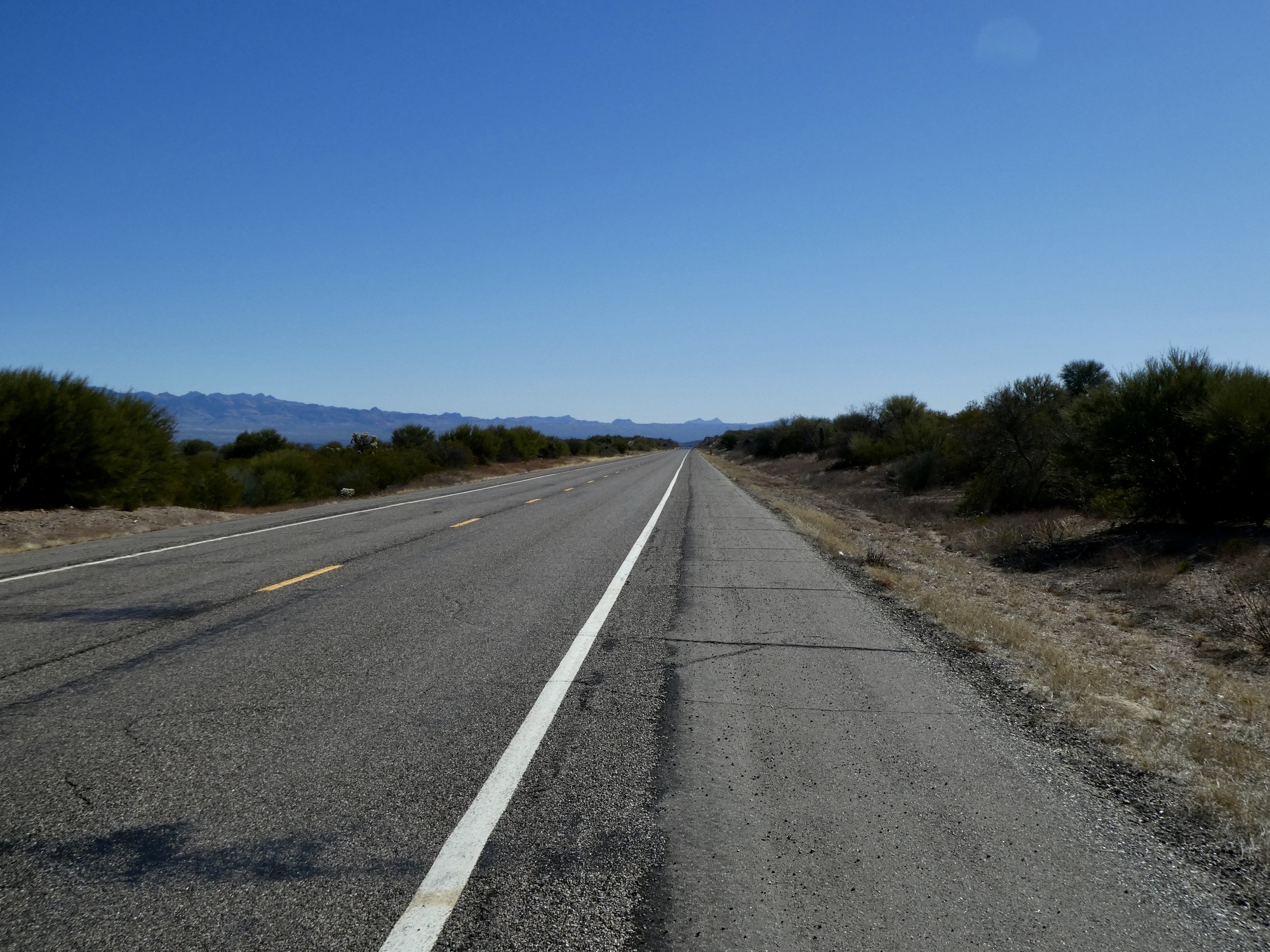 After leaving Webb Road we turn right on Veteran’s Memorial Boulevard, bike through San Manuel, and then face a few miles of this - an arrow straight road, with the Mae West Peaks rising up at the end. We’re still dropping, but much more gradually - maybe at about 1%.