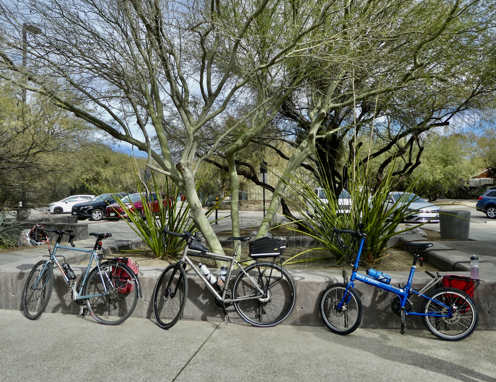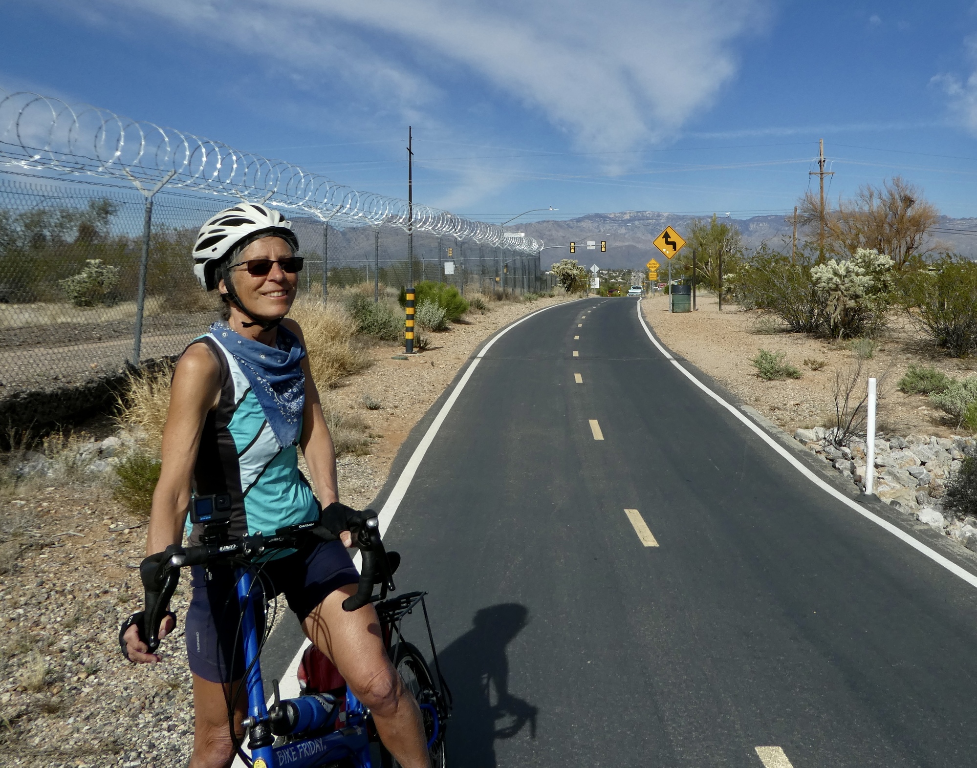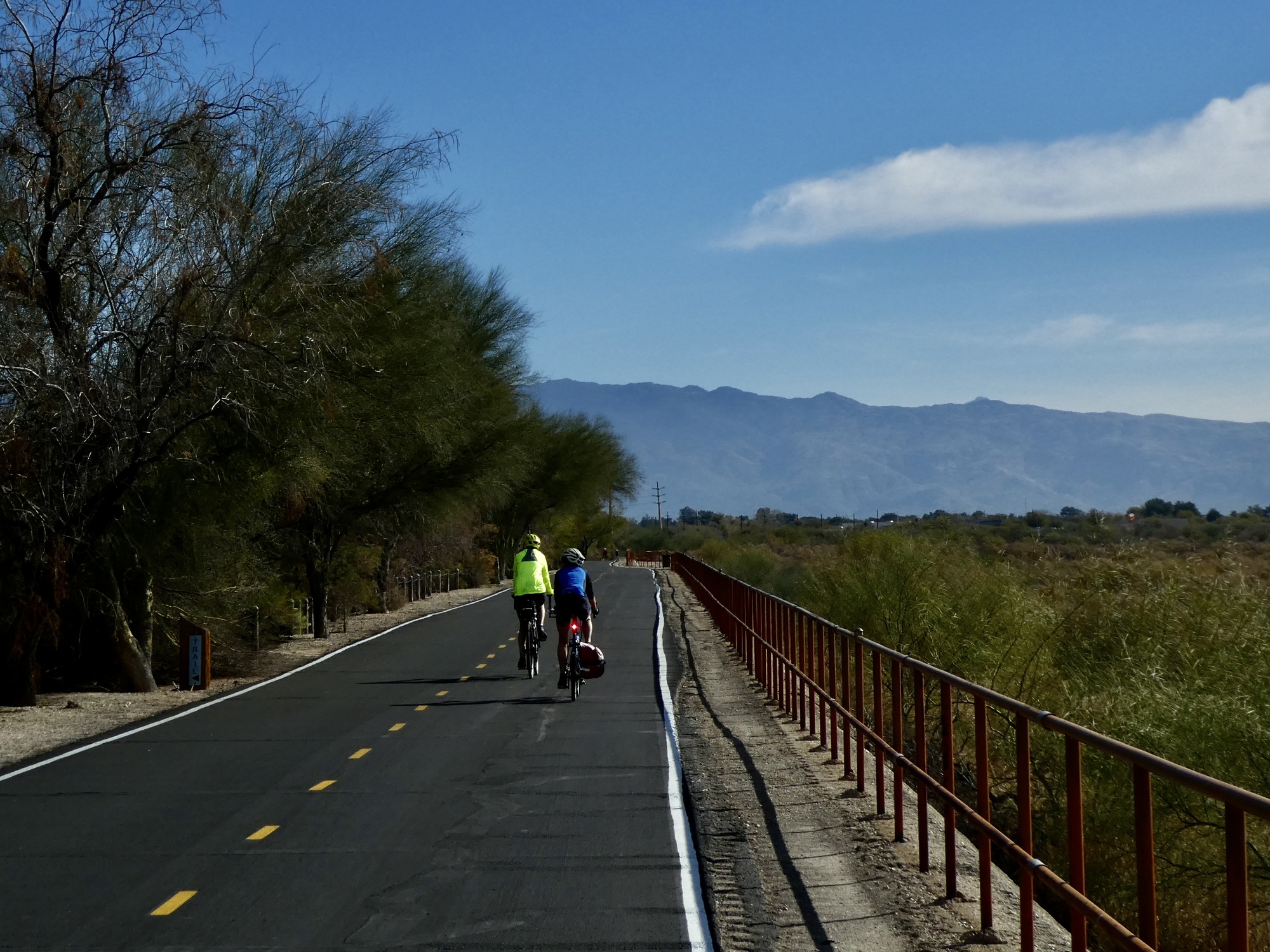 A half an hour later, both brake lines bled and back in a working state, we’re on the move again. It’s an easy decision to drop the plan for Saguaro for the day as too ambitious at this point, so we head north on Mountain for the Loop with a plan to bike east along Rillito and south along Harrison until it feels time to turn back.