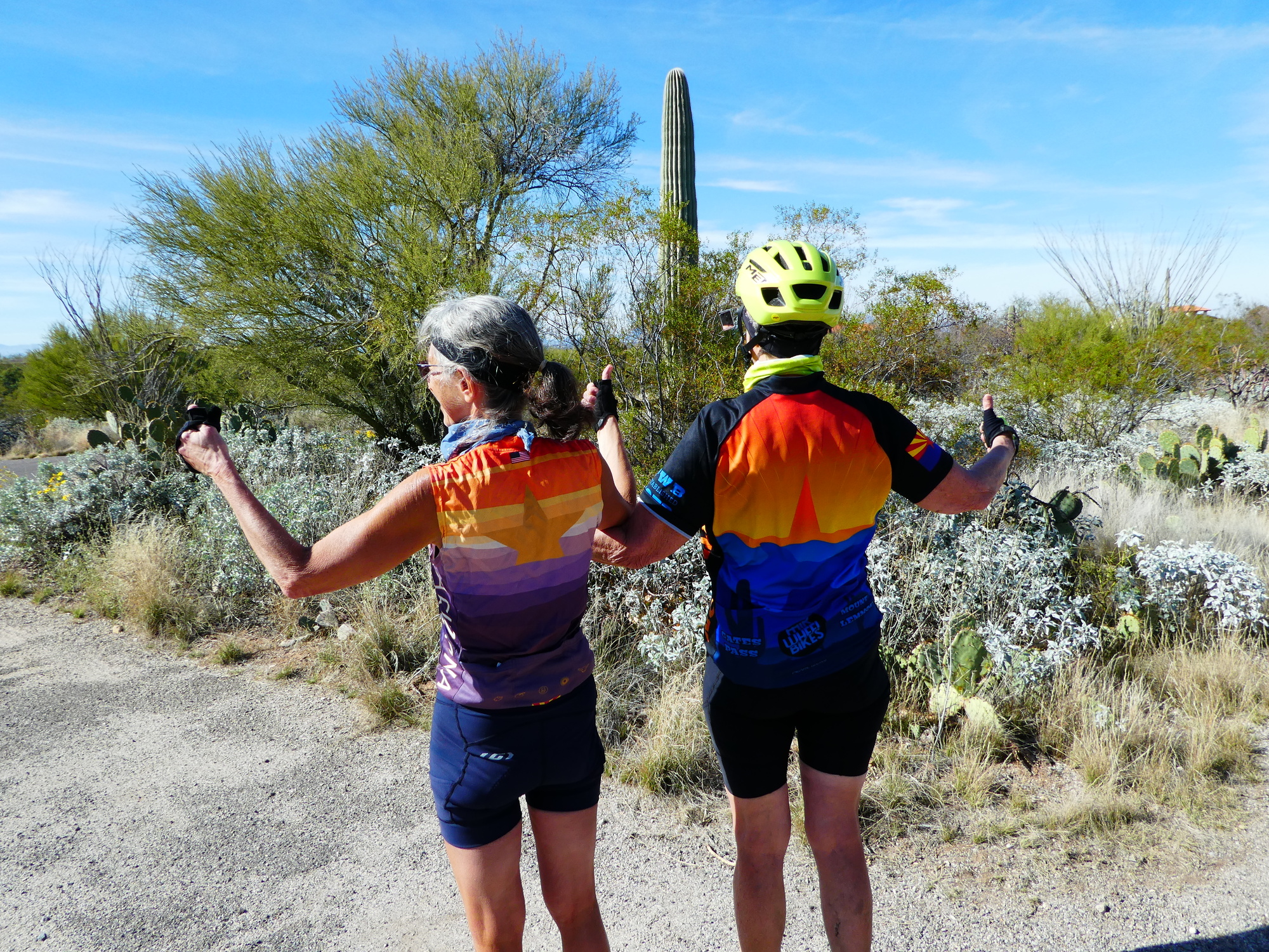 We continued on the Loop for a short while, conquered another busy stretch of the Tucson road network and turned southeast toward Saguaro National Park. A moderate incline and headwind took a bit of a toll and we were both ready for a snack by the time we reached the Park visitor center. We sat in a shaded picnic shelter, entertained by the chatter of nearby road cyclist extolling the virtues of their electrolyte supplements. We jumped at the chance when another cyclist offered to take our picture - he seemed a bit confused when we posed backwards, not fully understanding our wish memorialize our Arizona Bike Shirt ride to Saguaro National Park.