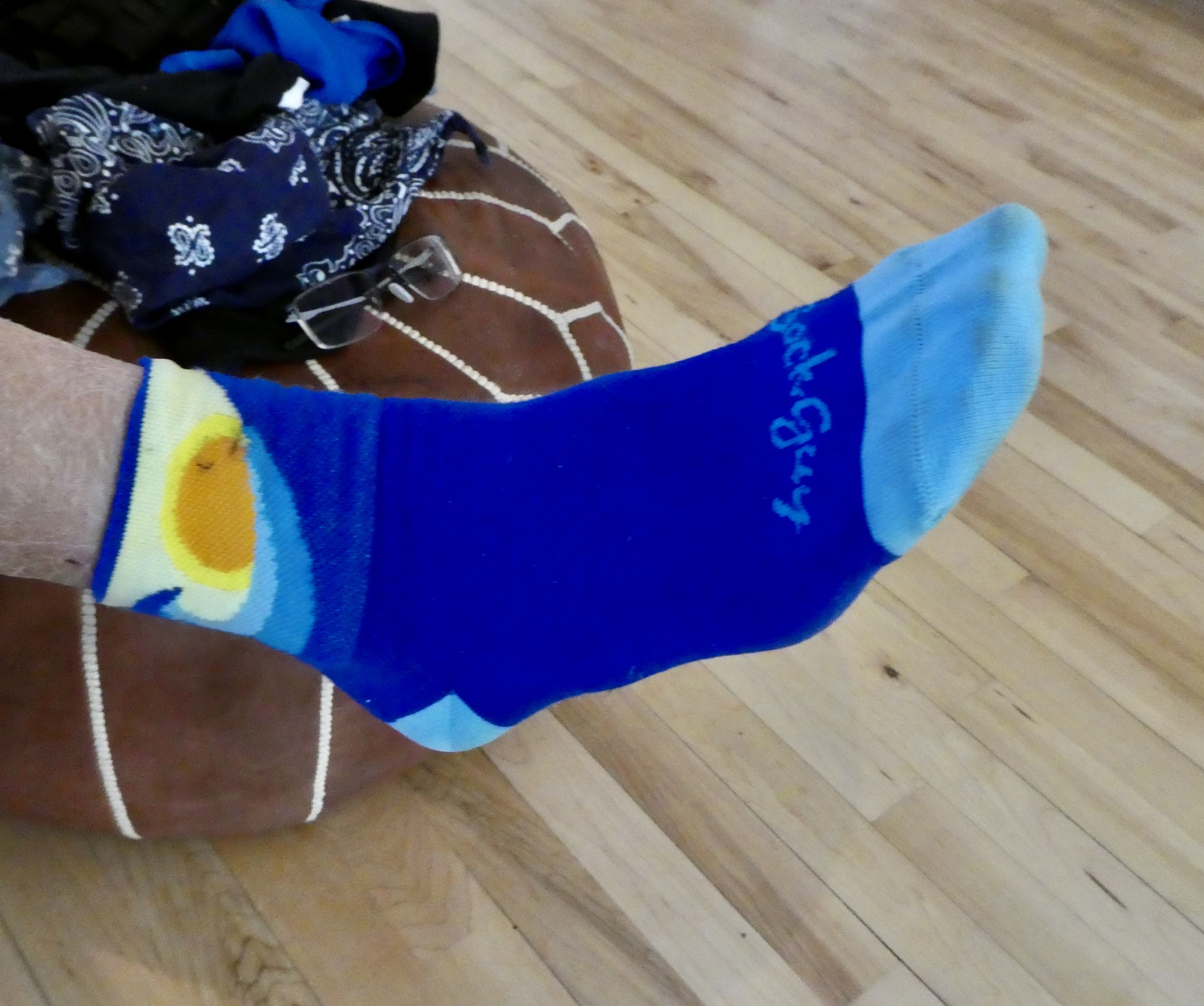 No photos of the road though, but since every post should have a bike in it here at least is the front wheel of Rachael’s bike, waiting to receive its new tire. Plus a charming photo of her colorful new bike socks, which we don’t want to forget either.