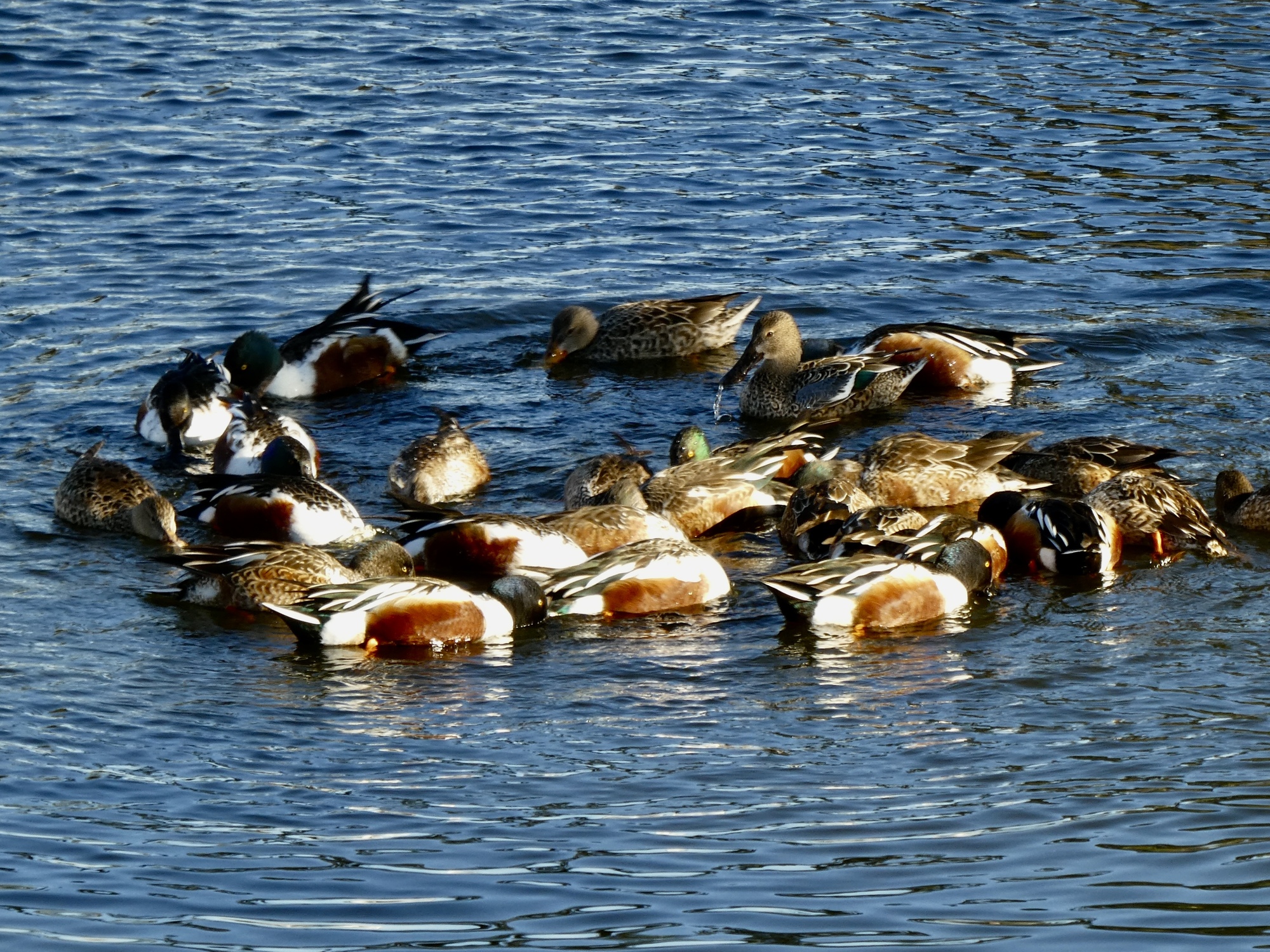 And it was a surprisingly good day for birding in general, giving me the best views so far of several previously-logged species. Might as well include them, as well as a short video of a group of shovelers circling around trying to stir up a meal. There were maybe a hundred shovelers on the pond by Sweetwater Preserve, repeatedly forming and dissolving circles. It’s an interesting process to watch - typically a few ducks will start circling together and then others will swim over one by one and accrete themselves onto the wheel.