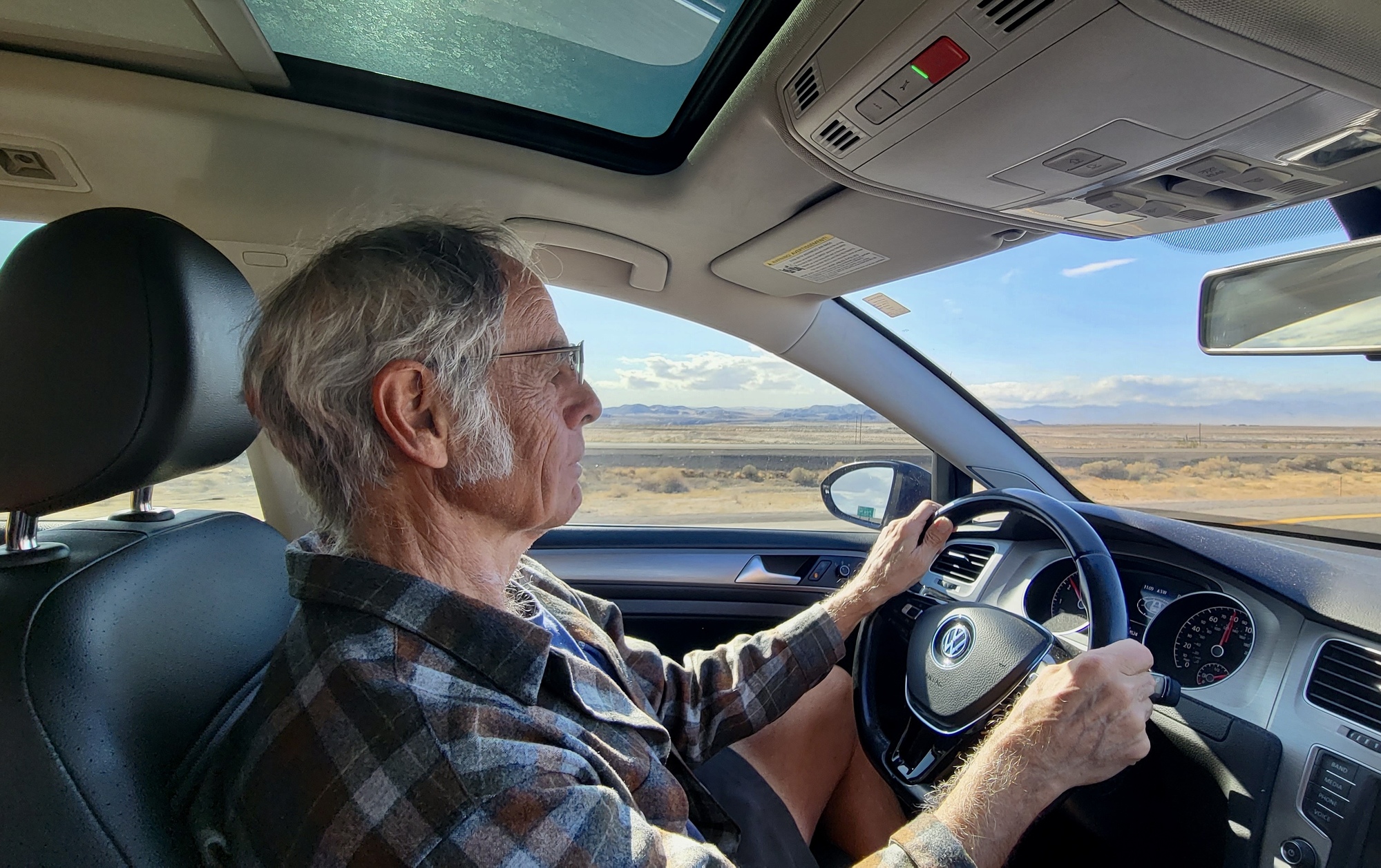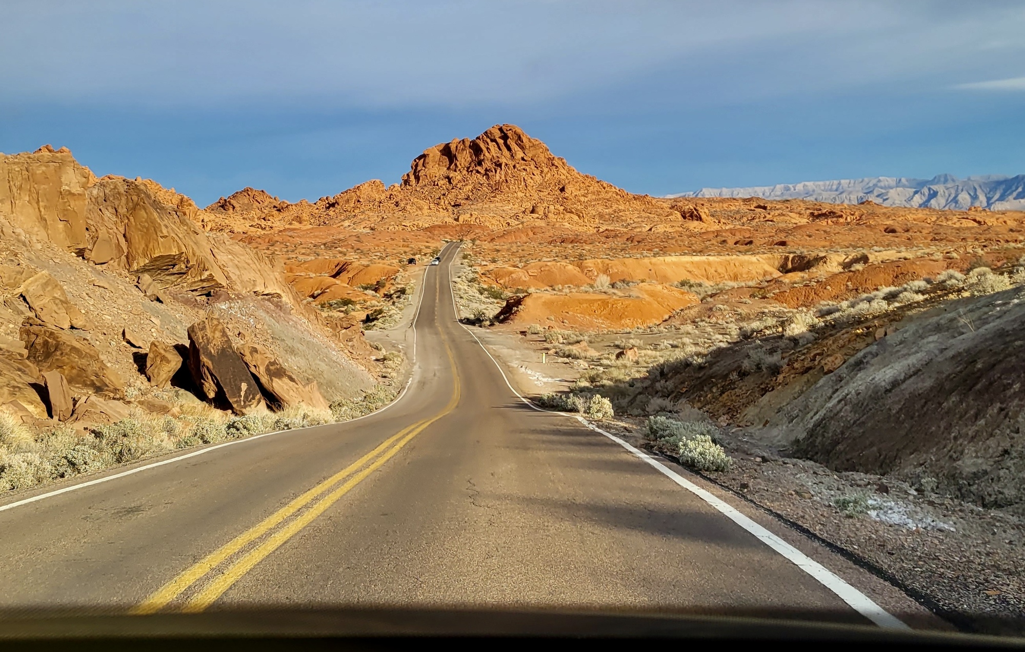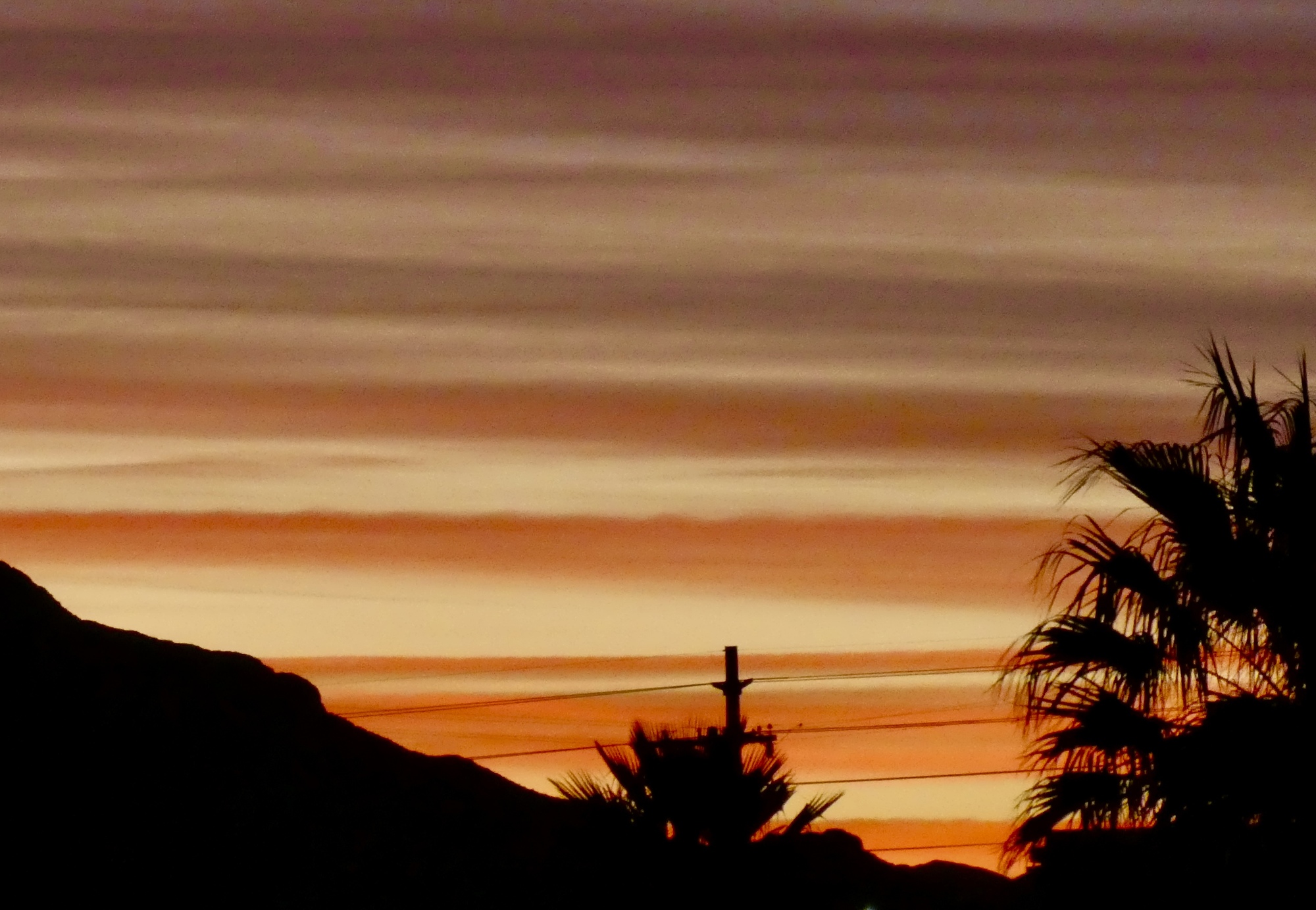 With a seven hour drive ahead, we get a jump on the day and are up and organizing for departure before six. The day gets a promising start when we step out the door and enjoy the last few minutes of a fast-fading sunrise that stripes the sky above the River Mountains. Turning back to the room, Rachael sees a perfectly full moon slightly haloed by the light morning mist. Good omens, both!
