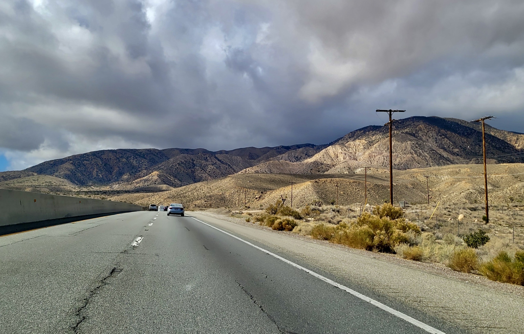The drive is as good as can be hoped for - fast roads, reasonable traffic, and one astonishing view after another as we speed west across the Mojave Desert on the interstate through a string of B-towns: Baker, Barstow, Boron, Bakersfield. The weather is dramatic, with heavy, dark clouds blanketing the mountains west of Las Vegas and winds so strong that it propels large tumbleweeds racing down the freeway toward us. Definitely not a cycling day!